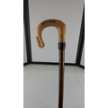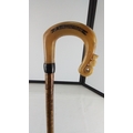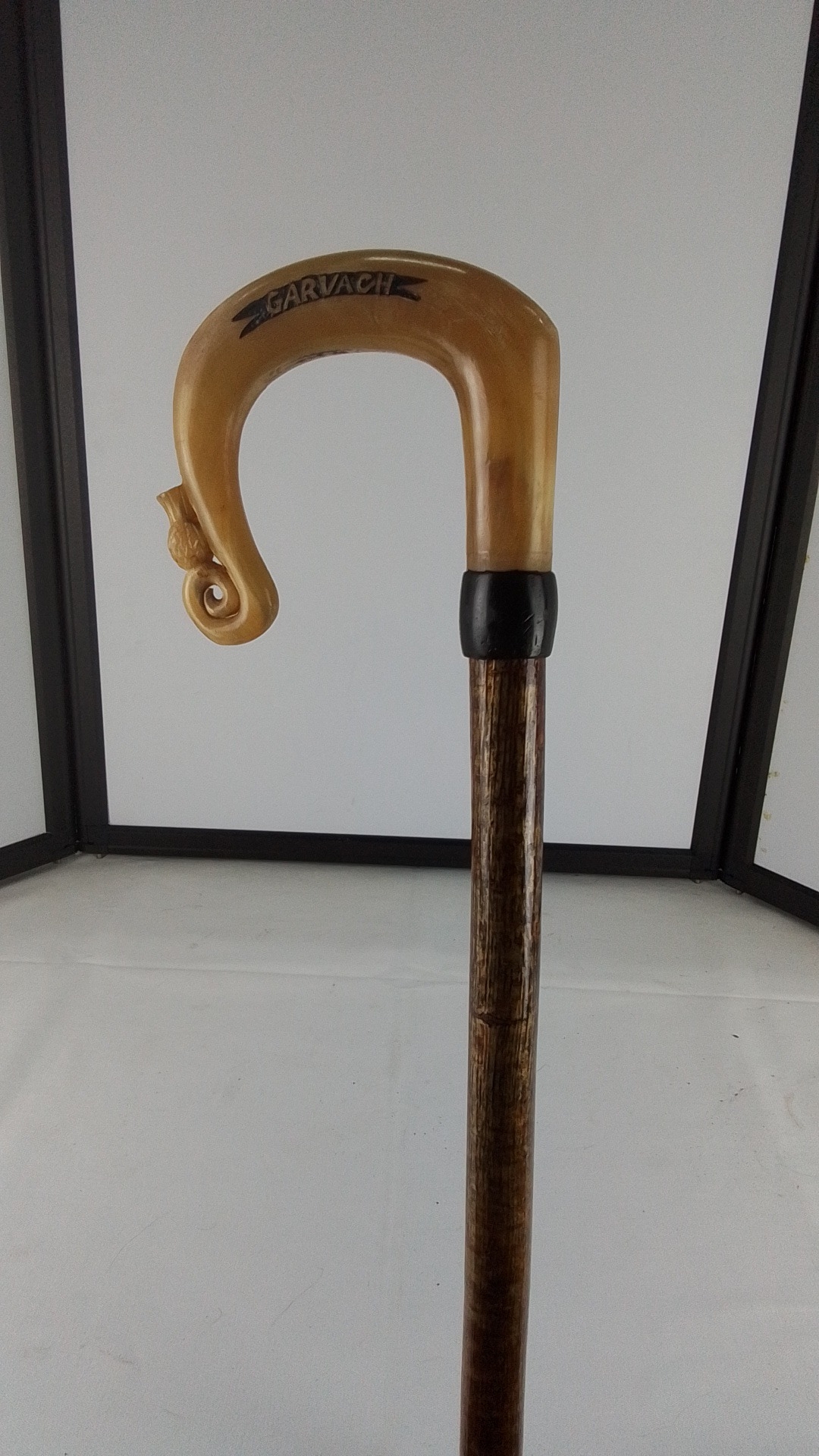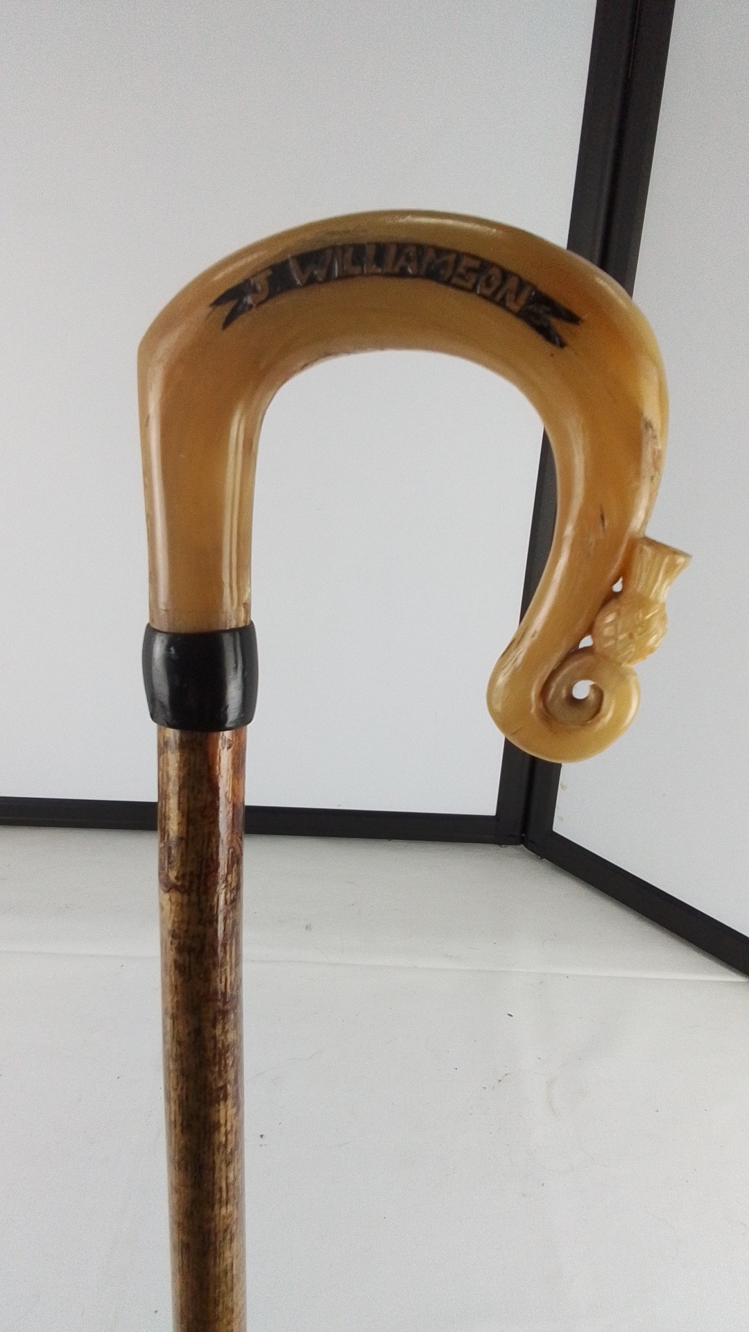 A gentleman’s carved horn-handled walking cane, the crook handle decorated with a scroll terminal, inscribed “Garvagh” and “J Williamson”.