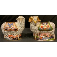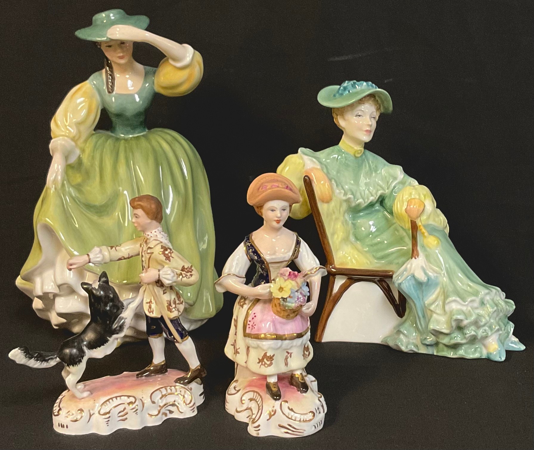 A Royal Crown Derby figure, modelled by Edward Drew, Flower Seller, 11cm, another Shepherd; a Royal Doulton figure, Ascot HN2356, another Buttercup HN2309 (4)