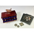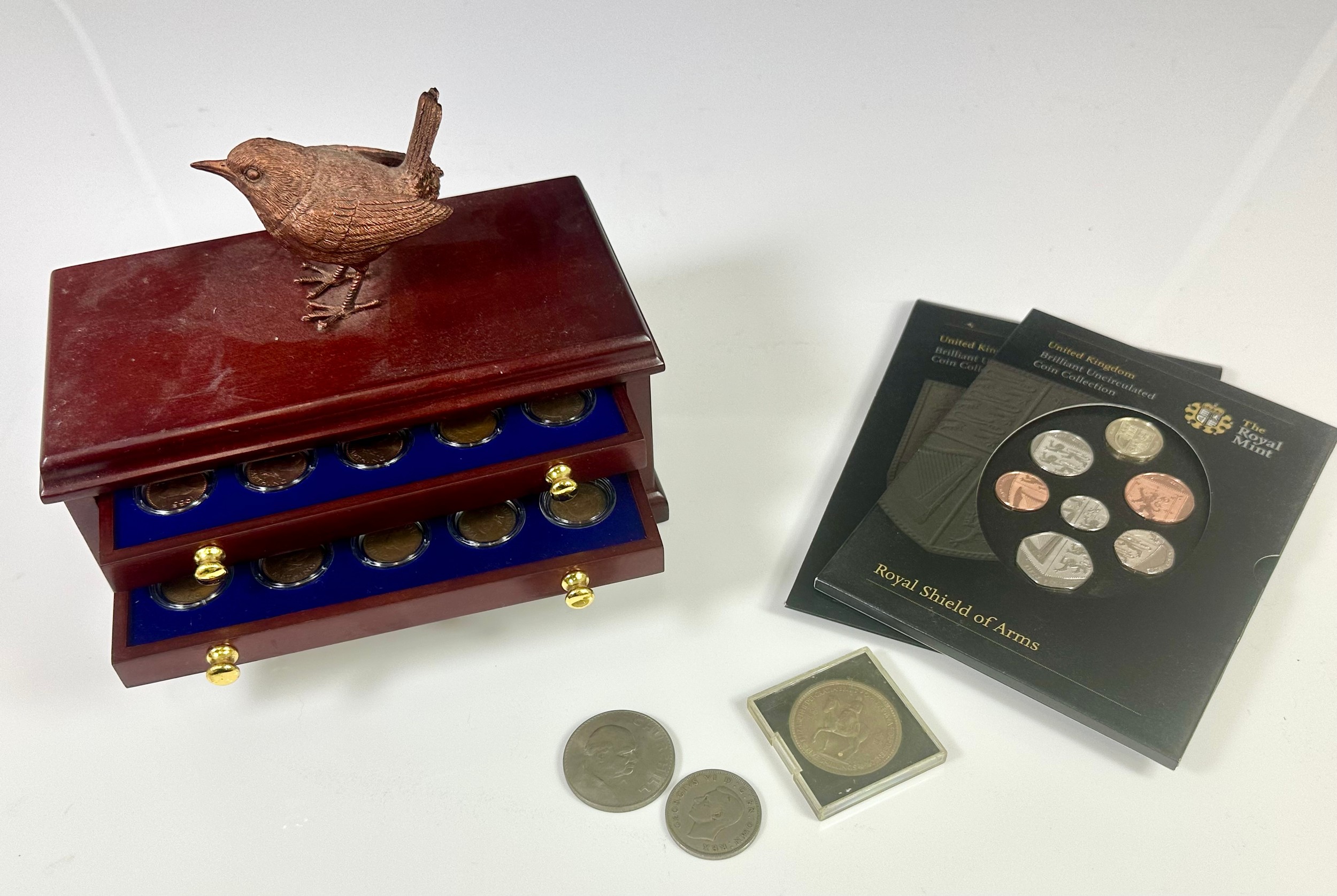 MISC. COINS INC. UK ROYAL SHIELD OF ARMS BRILLIANT UNCIRCULATED, COLLECTION OF FARTHINGS IN FITTED 3 DRAWER CABINET AND OTHERS