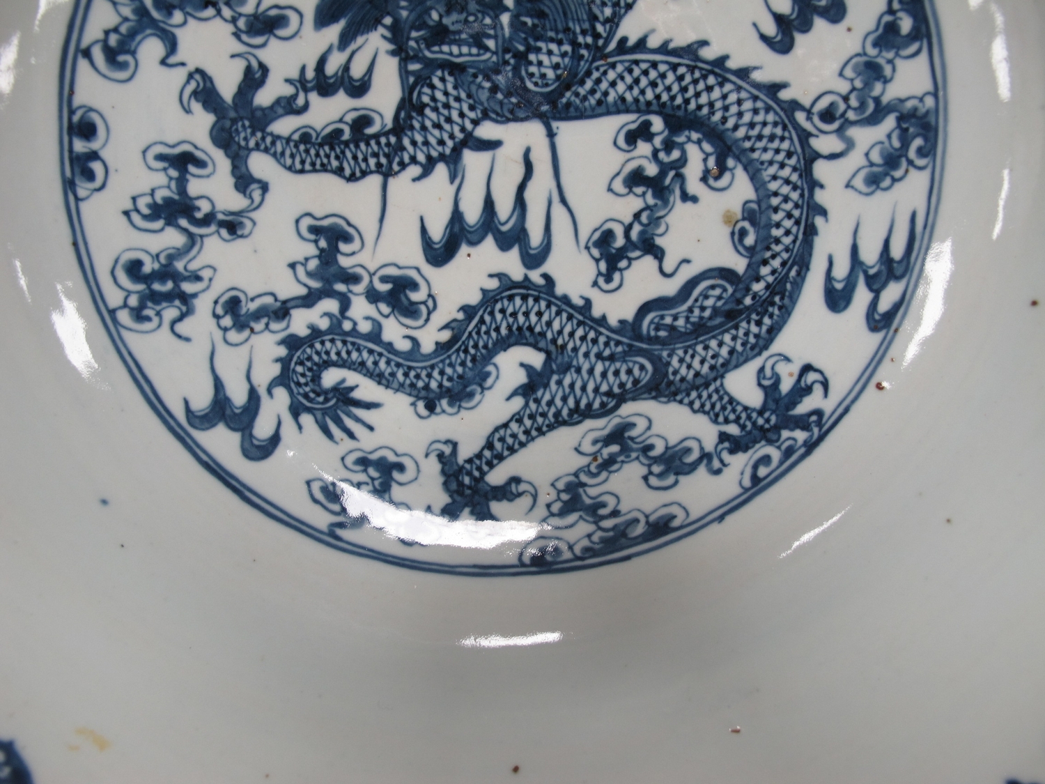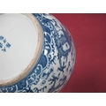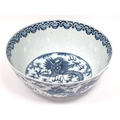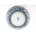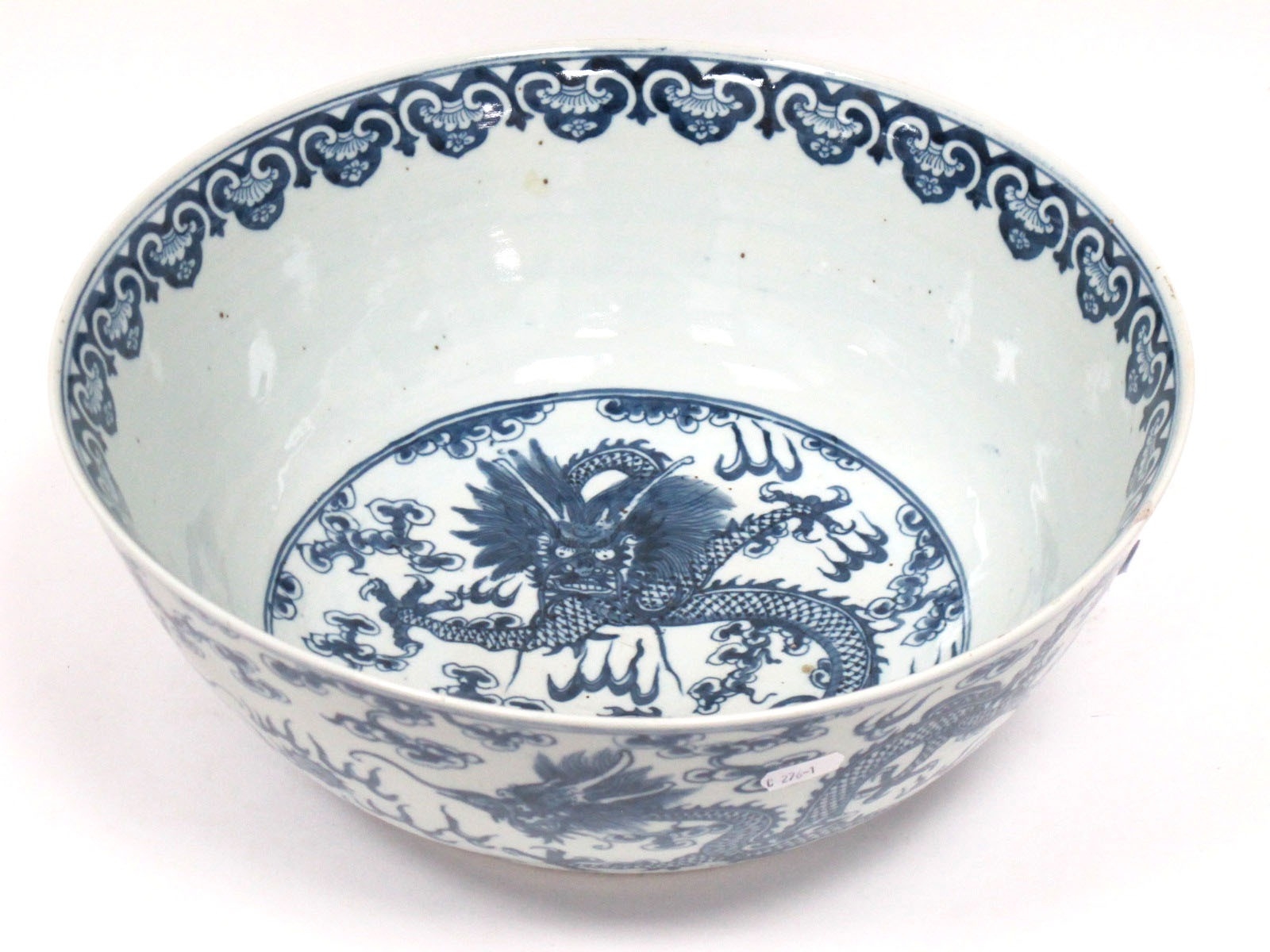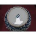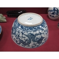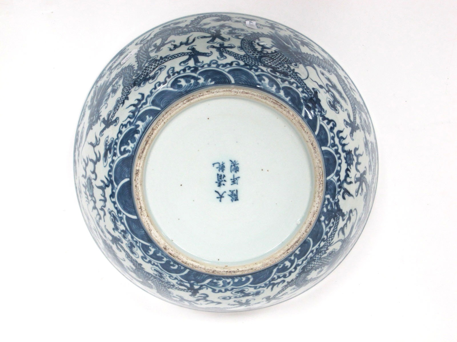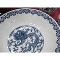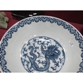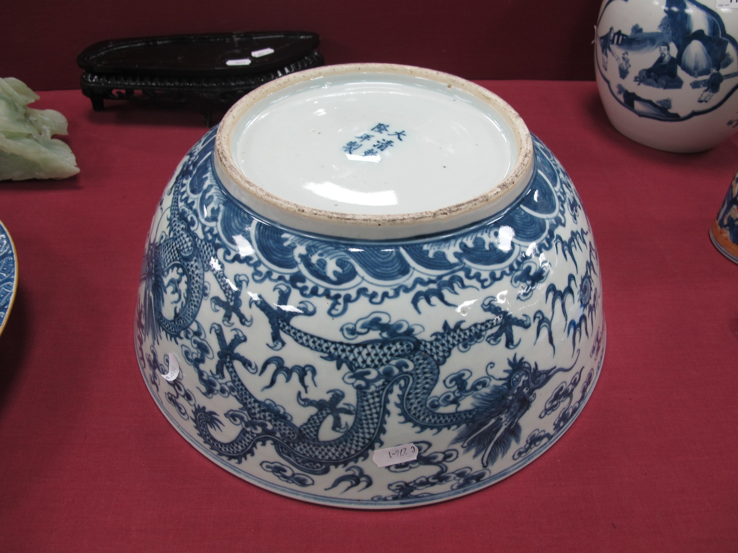 A Late XIX Century Large Chinese Pottery Circular Bowl, painted in blue with a central dragon chasing clouds within a floral border, six character mark to base, 36cm diameter.