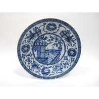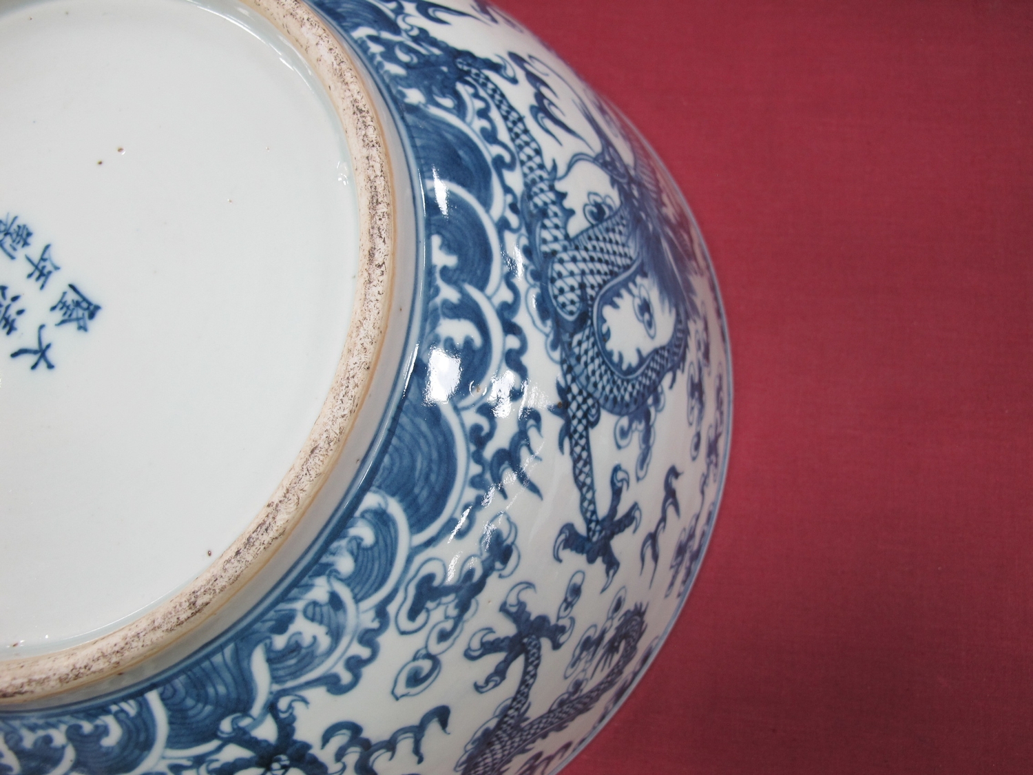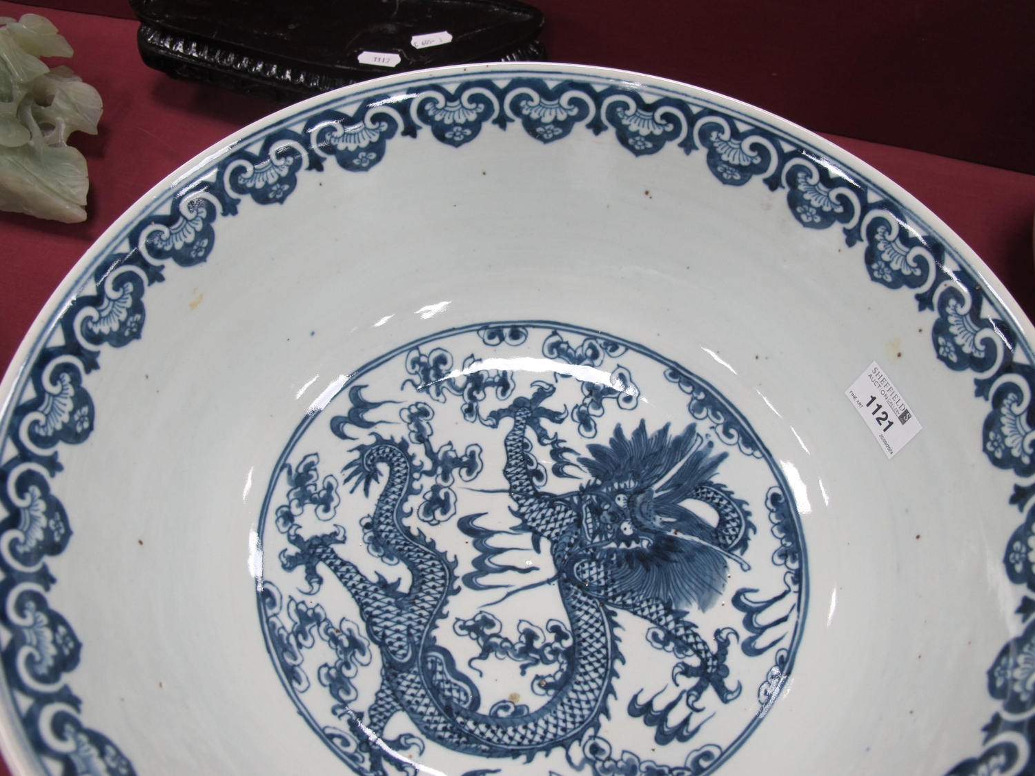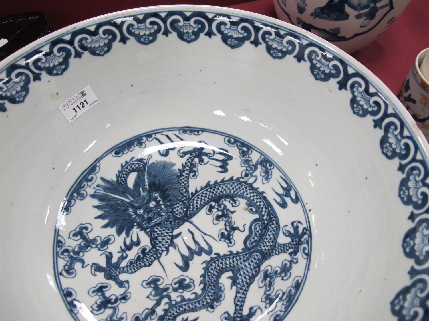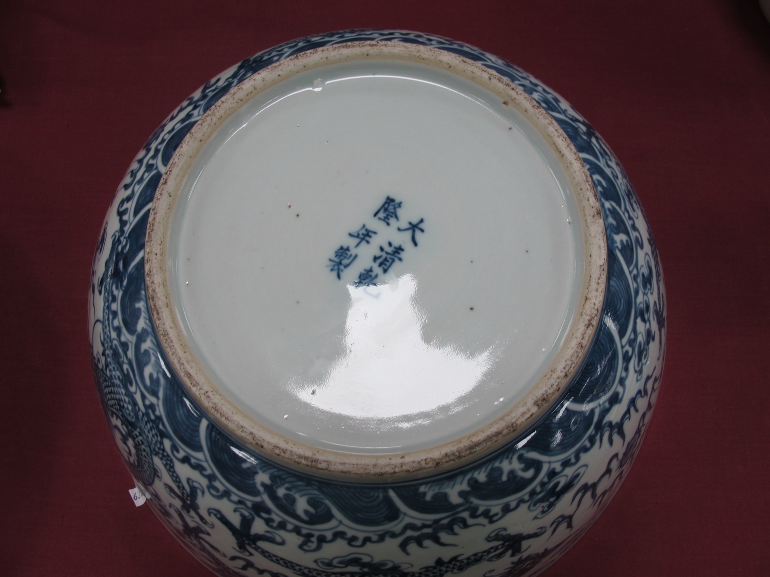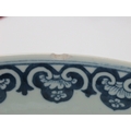 A Late XIX Century Large Chinese Pottery Circular Bowl, painted in blue with a central dragon chasing clouds within a floral border, six character mark to base, 36cm diameter.