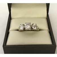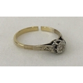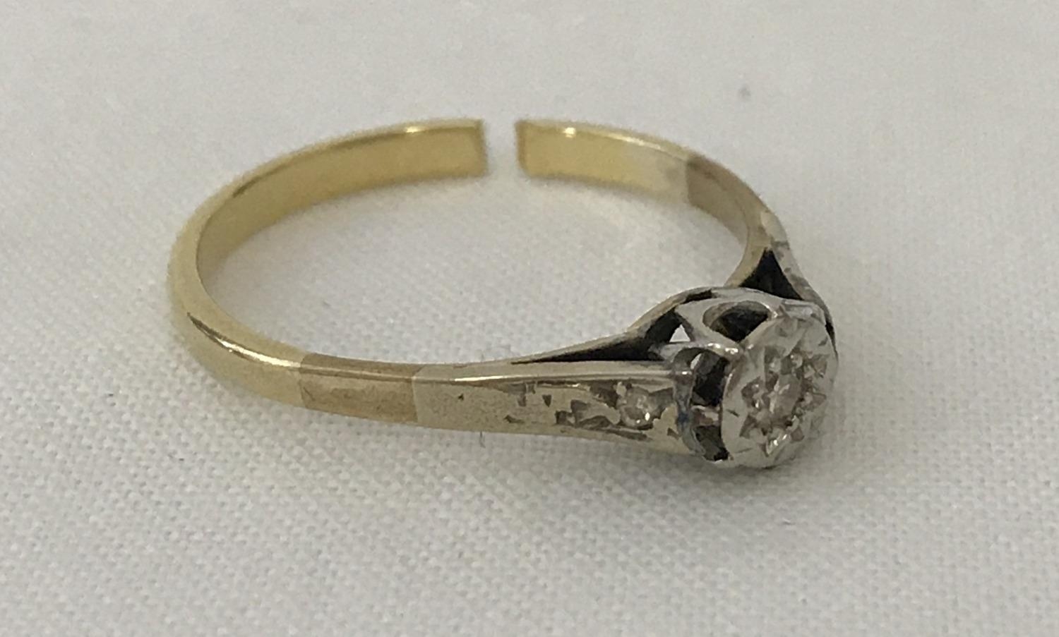 A vintage scrap gold illusion set diamond solitaire ring. Central diamond with a small diamond set to each shoulder. Ring has been cut through. Tests as 9ct. Total weight approx. 1.9g.