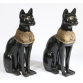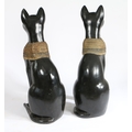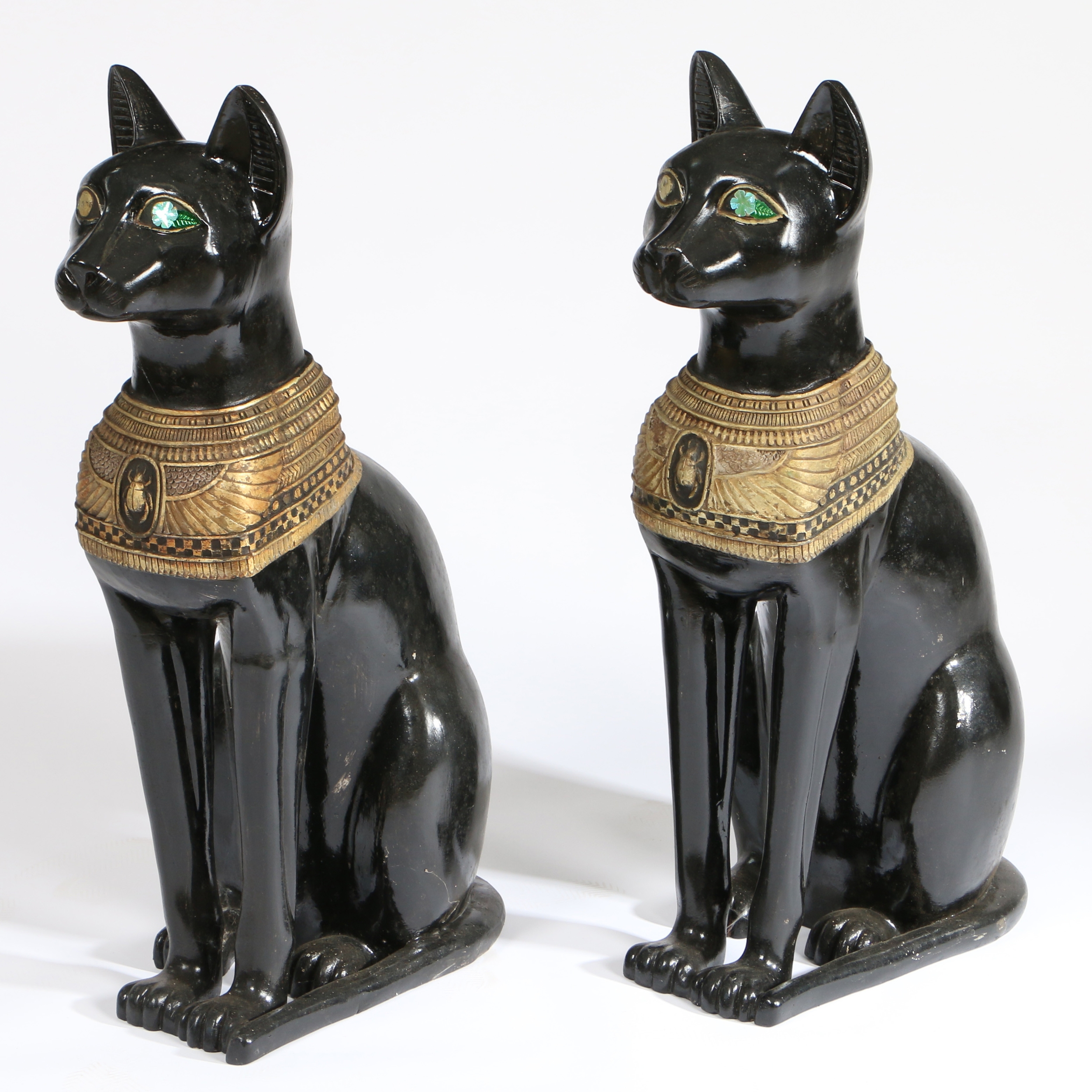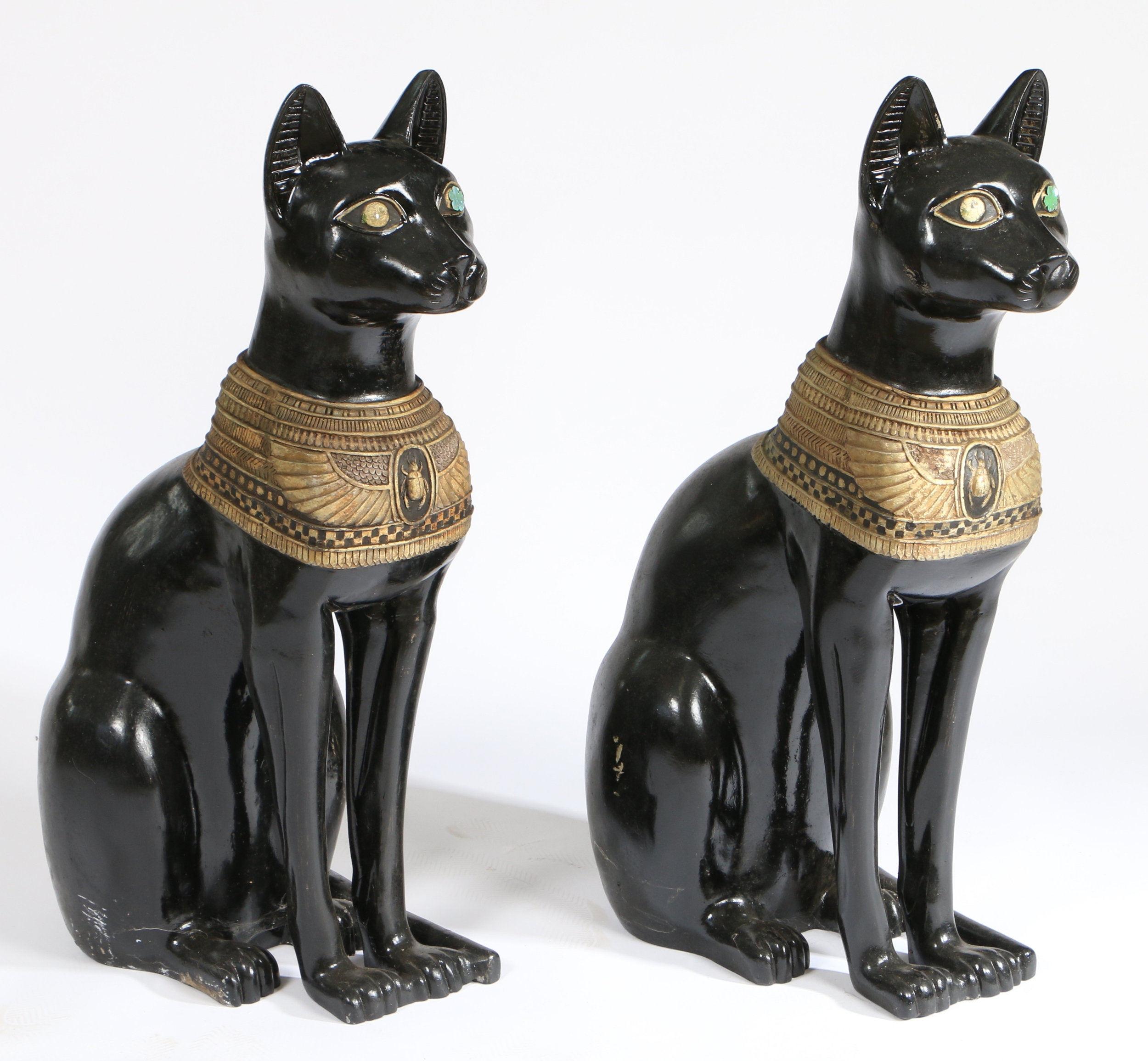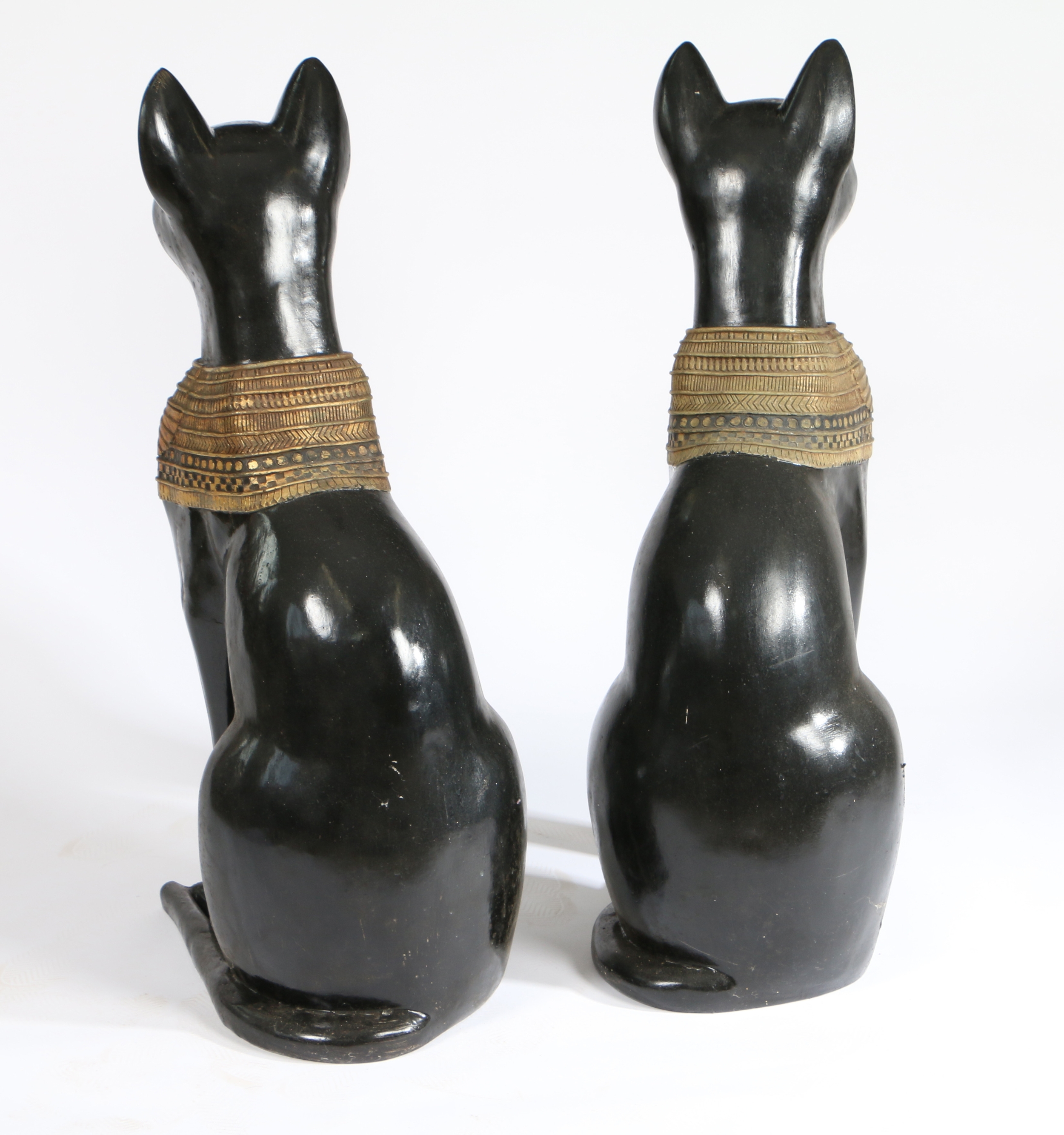 A PAIR OF 20TH CENTURY RESIN EGYPTIAN CATS. painted in black with an Egyptian style design, 74cm high.