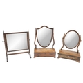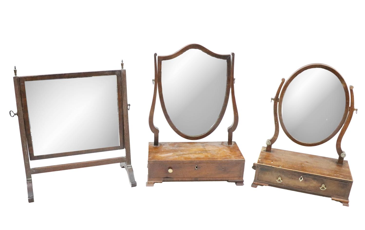 A late George mahogany swing frame Dressing Table Mirror, with oval plate and frieze drawer on ogee bracket feet, 13 3/4" (35cms); together with two similar Dressing Table Mirrors. (3)