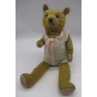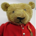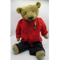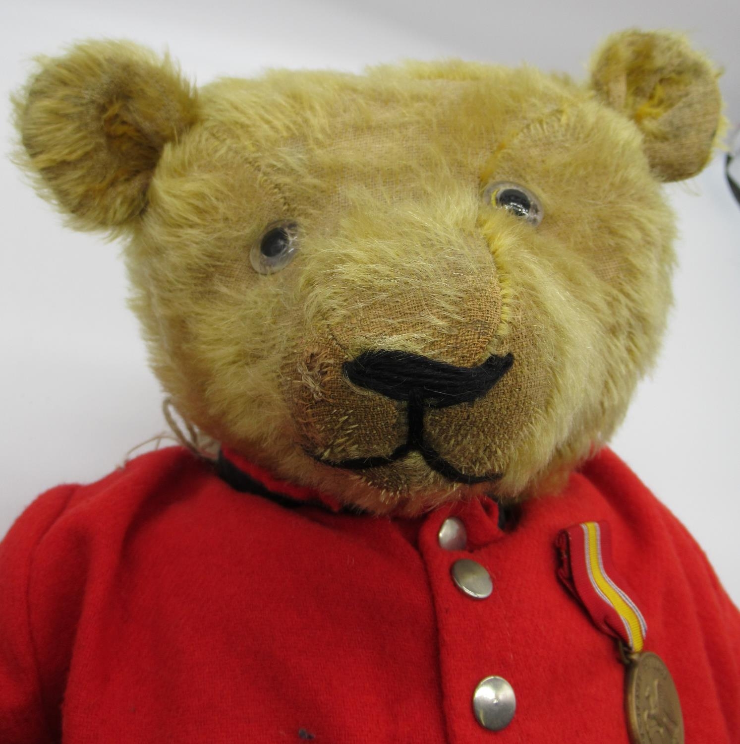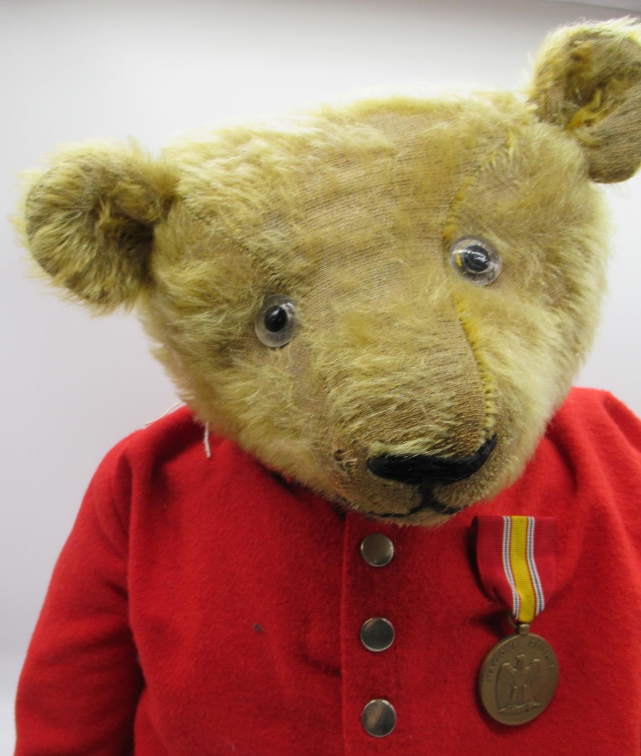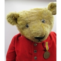 Early C20th large American teddy bear in blonde mohair with clear glass eyes, non-working growler mechanism, jointed arms and legs and swivel head, wearing navy trousers and a red jacket with National Civil Defence medal, H60cm