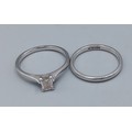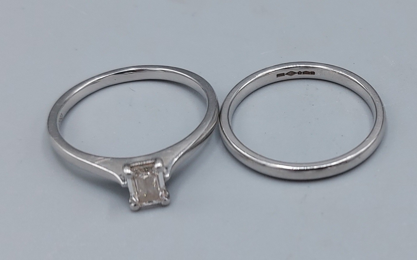A Platinum solitaire Diamond ring set with an Emerld cut Diamond, claw set, together with a Platinum wedding band, 6.7gms, ring size M