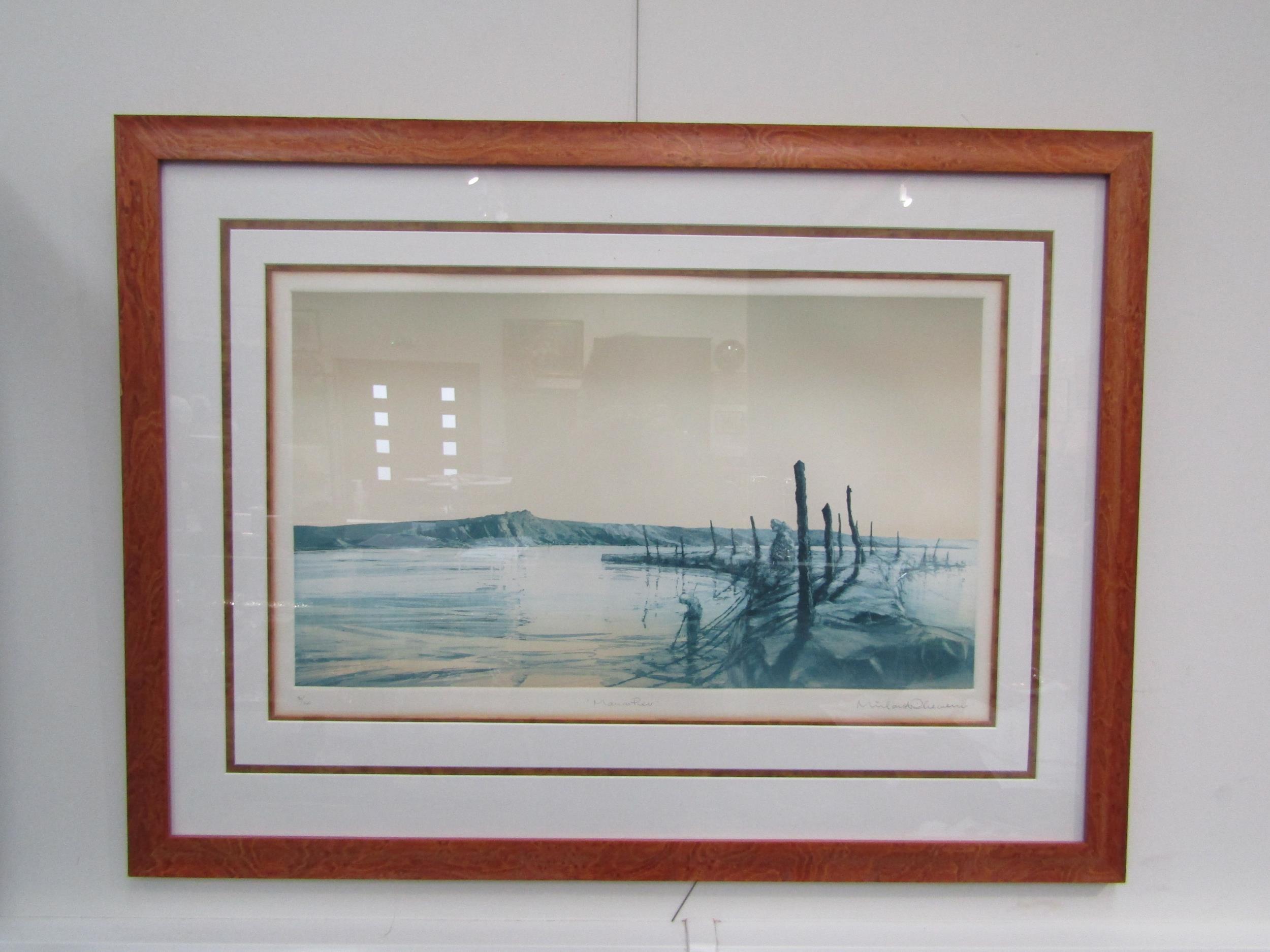 A Michael Richloer limited edition print, ‘Man on Pier’, 90/150, framed and glazed, 38.5cm x 63cm (R) £20