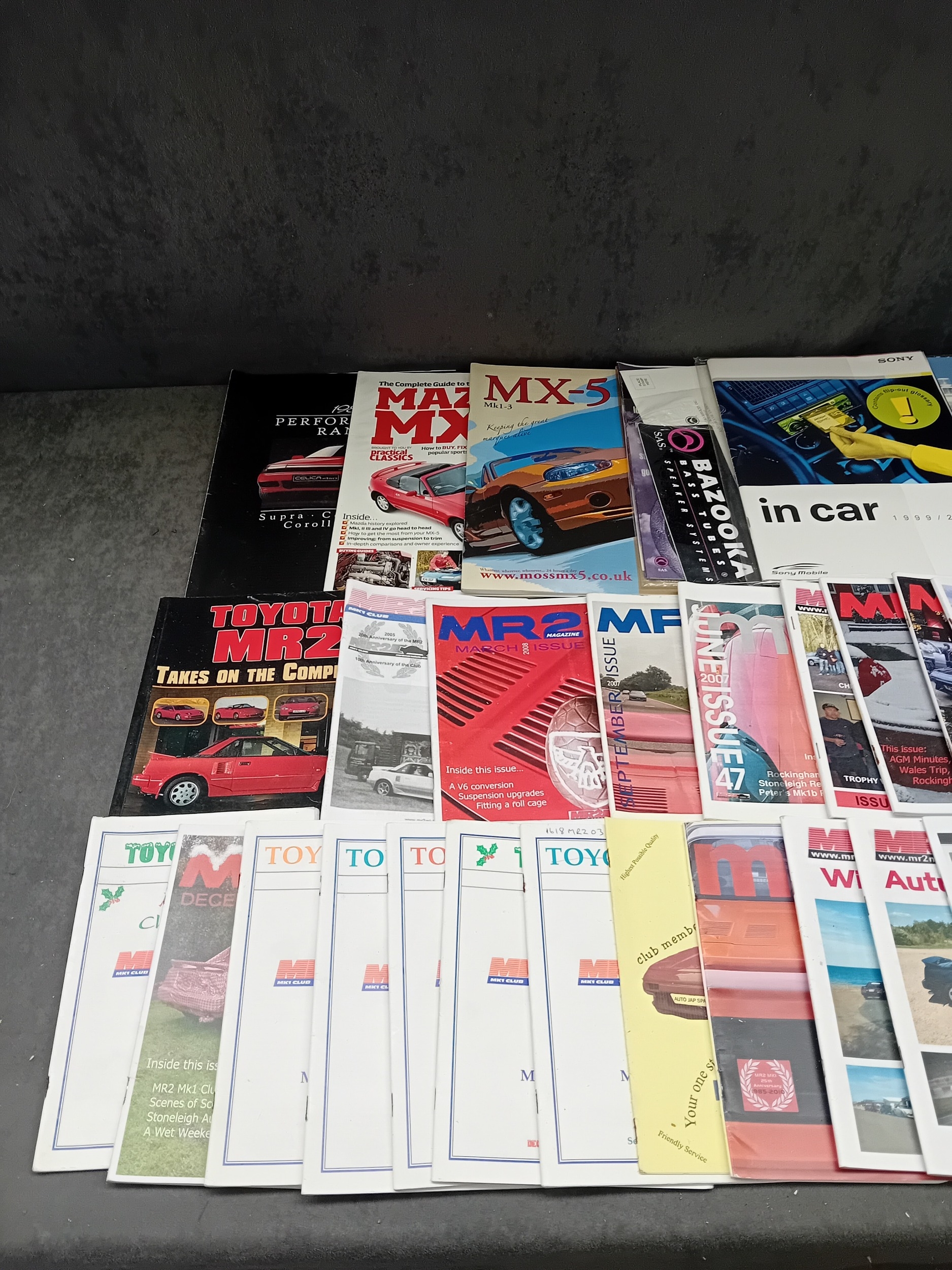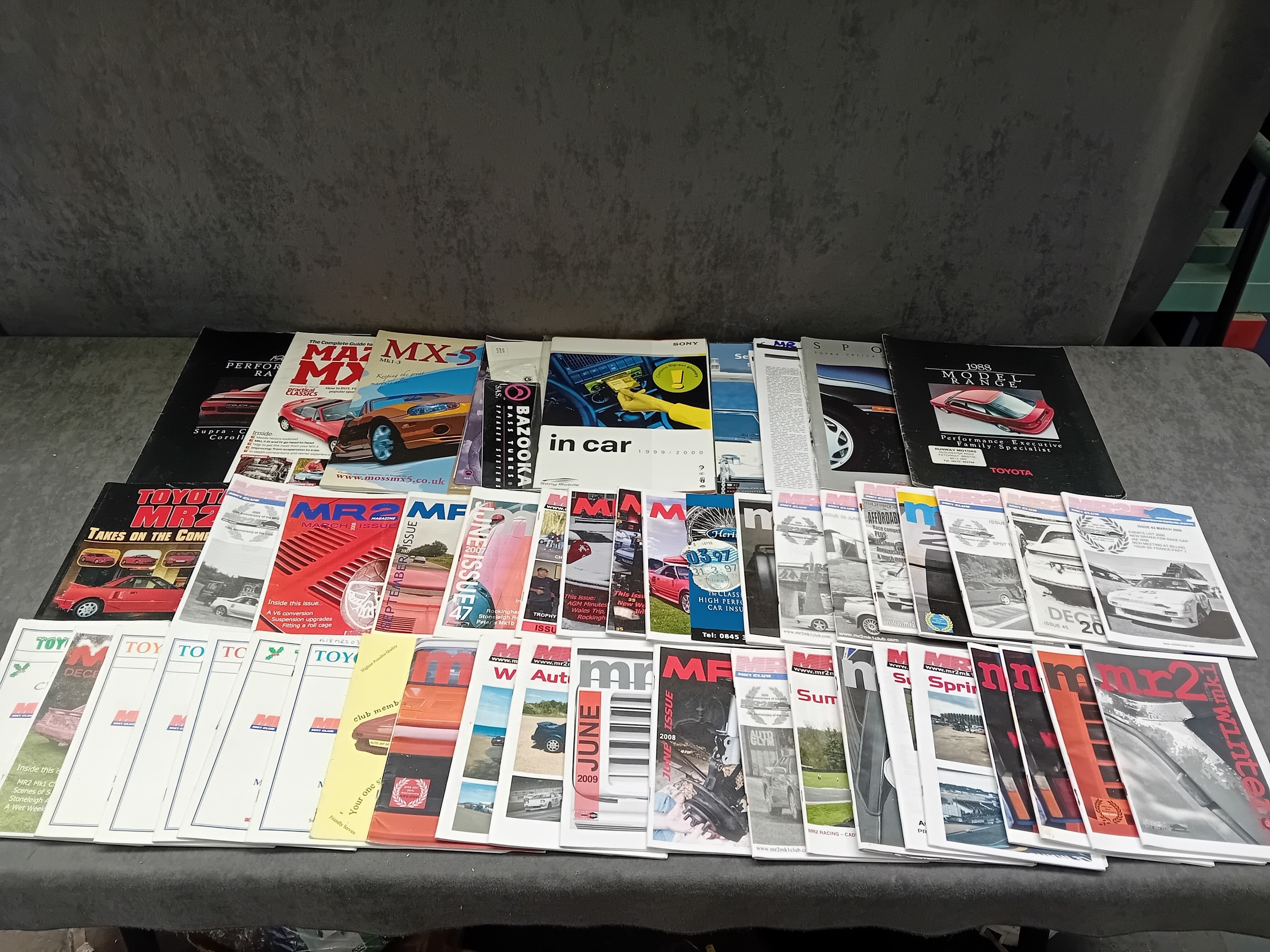 This lot comprises 49 individual issues of automotive enthusiast magazines and club newsletters. The collection predominantly features publications centered on specific car models, notably the Mazda MX-5 and Toyota MR2, with additional titles covering broader "Performance" and "Classics" themes, as well as "in car" electronics. Visible titles include "MAX MX-5," "Toyota MR2," "Performance Car, " and "MR2 issue, " alongside club branding such as "MR2 Owners Club" and references to car generations ("MK1, MK2, MK3"). The publications are constructed from printed paper with full-color photographic covers depicting various sports cars. Publication dates range from the late 1990s (e.g., "1999/2000") through at least "JUNE 2009."