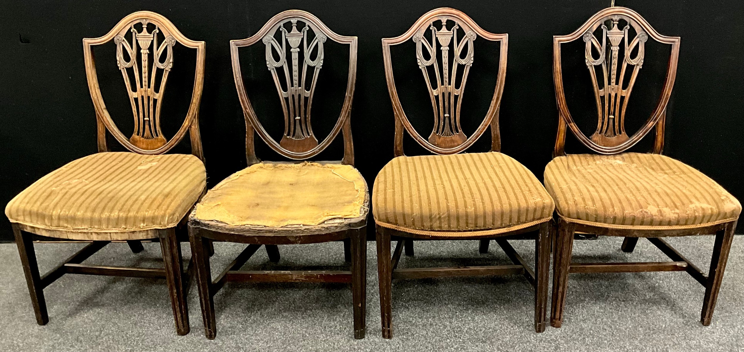A set of four George III, Hepplewhite style chairs, shield-shaped backs, with carved urn and soaks splat, fluted square legs, 94.5cm high x 54.5cm wide, (4).