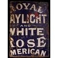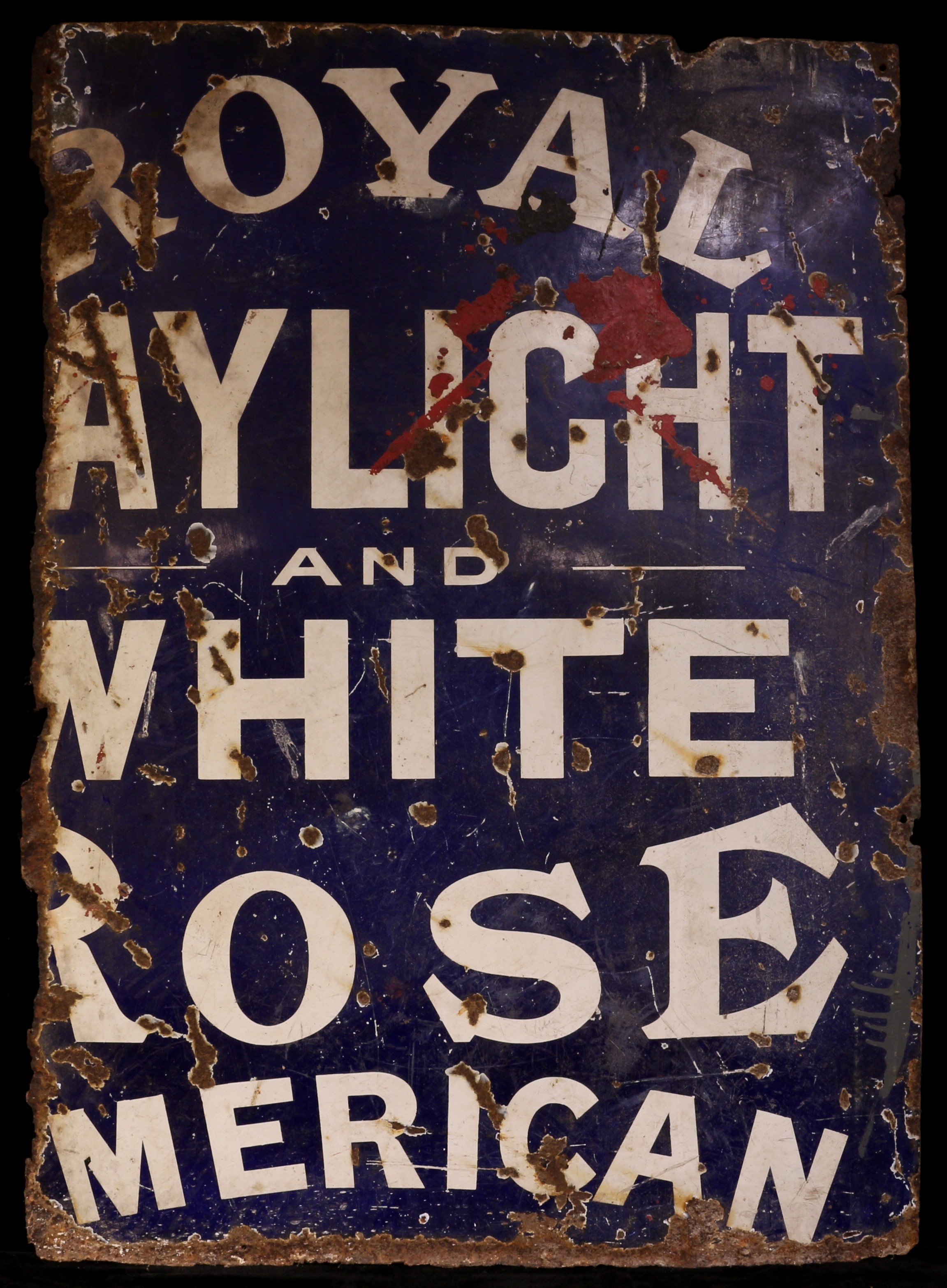 Advertising, Automobilia Interest - a rectangular shaped single sided enamel sign, white lettering on a cobalt blue ground 'ROYAL *AYLIGHT AND WHITE ROSE *MERICAN', 107cm high, 76cm wide