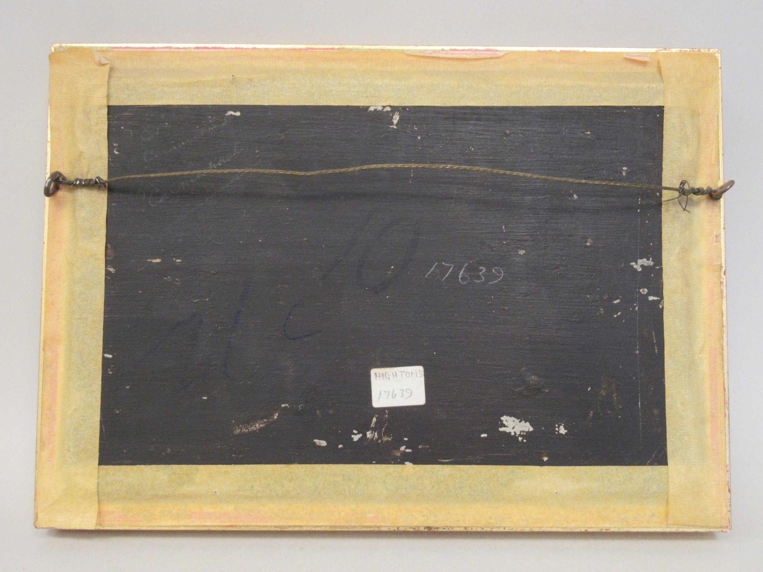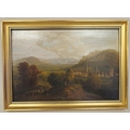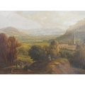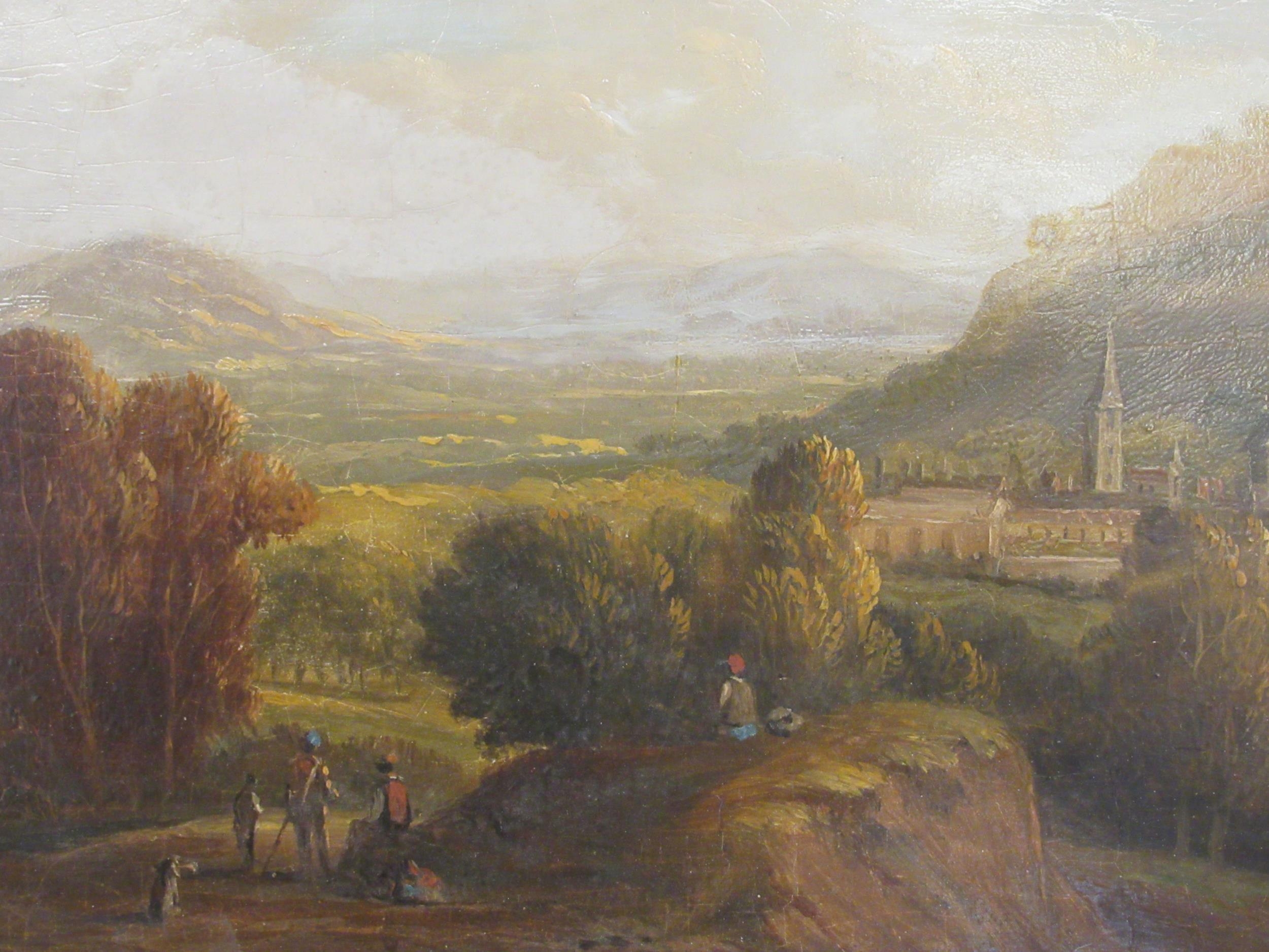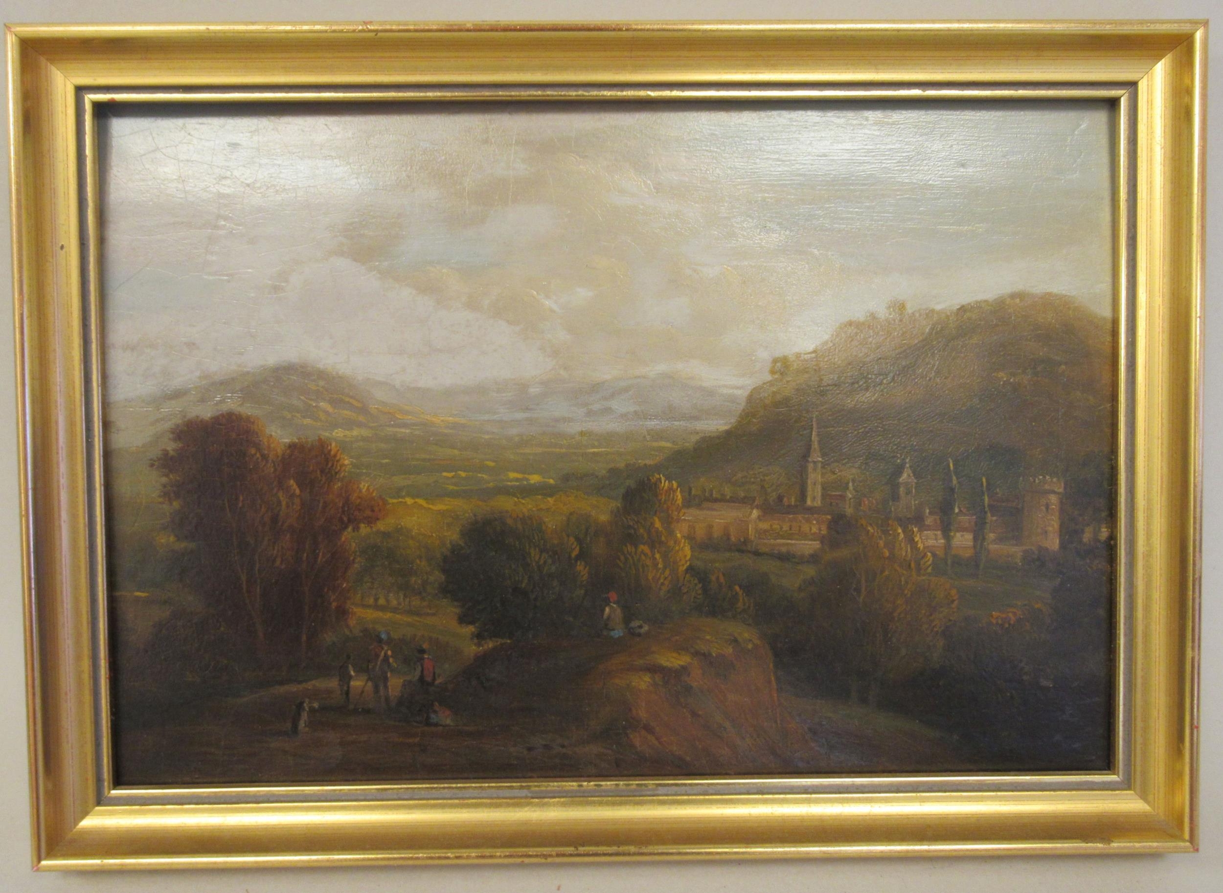 19thC Continental School - a landscape with figures resting in the foreground and a village beyond oil on board 7" x 10" framed