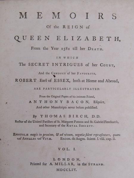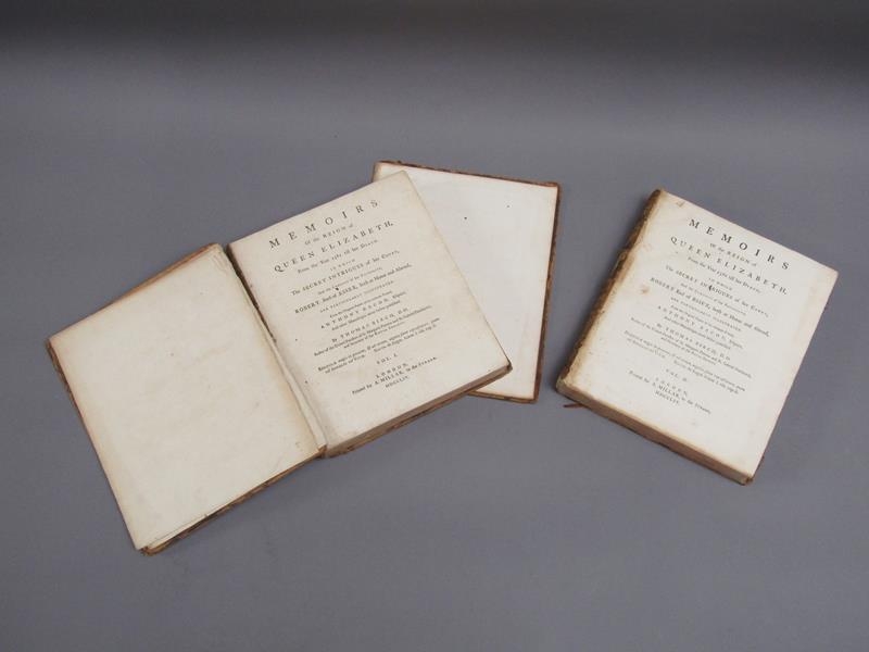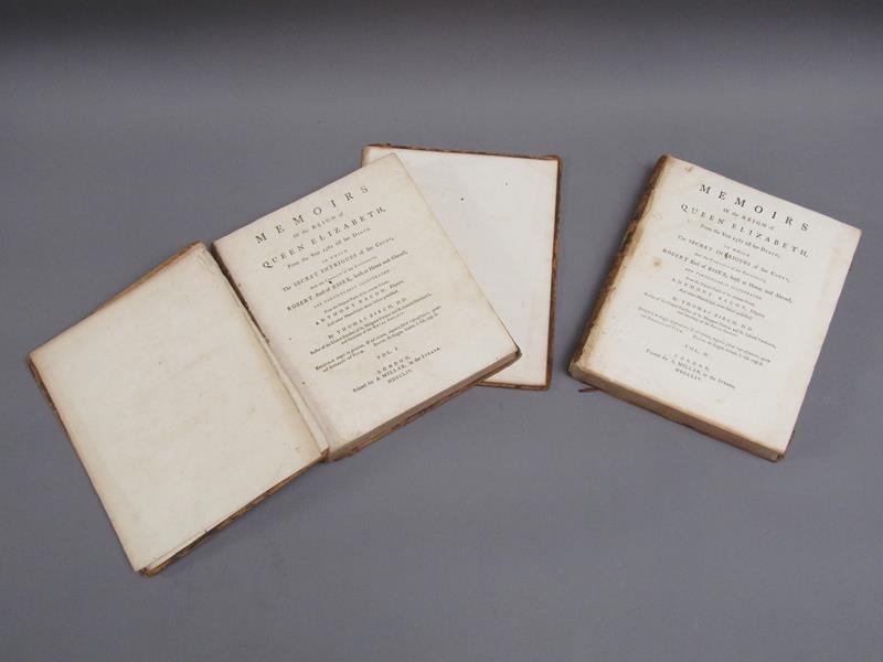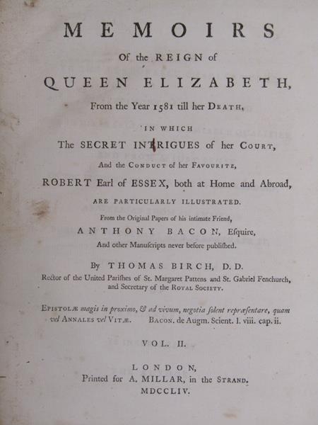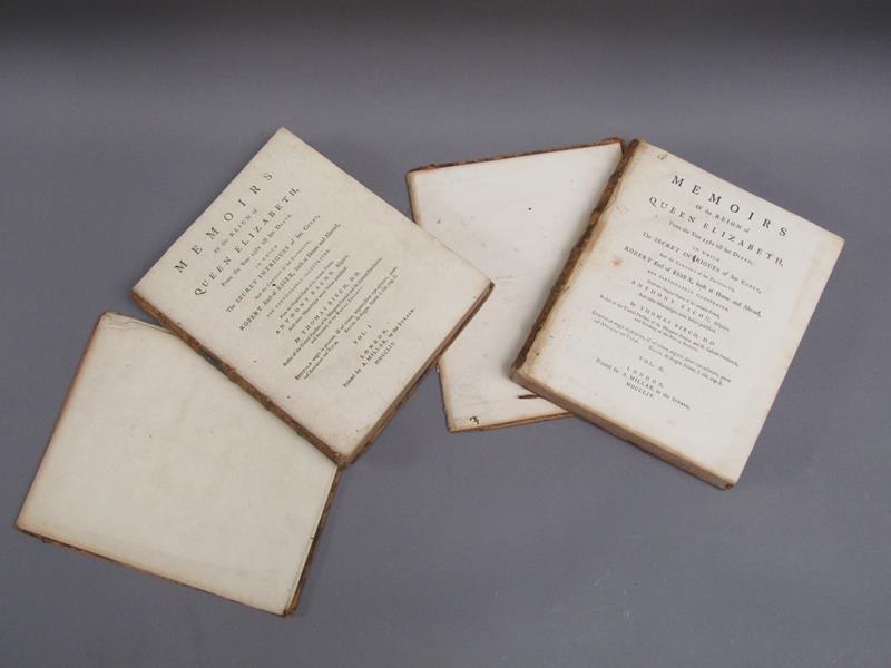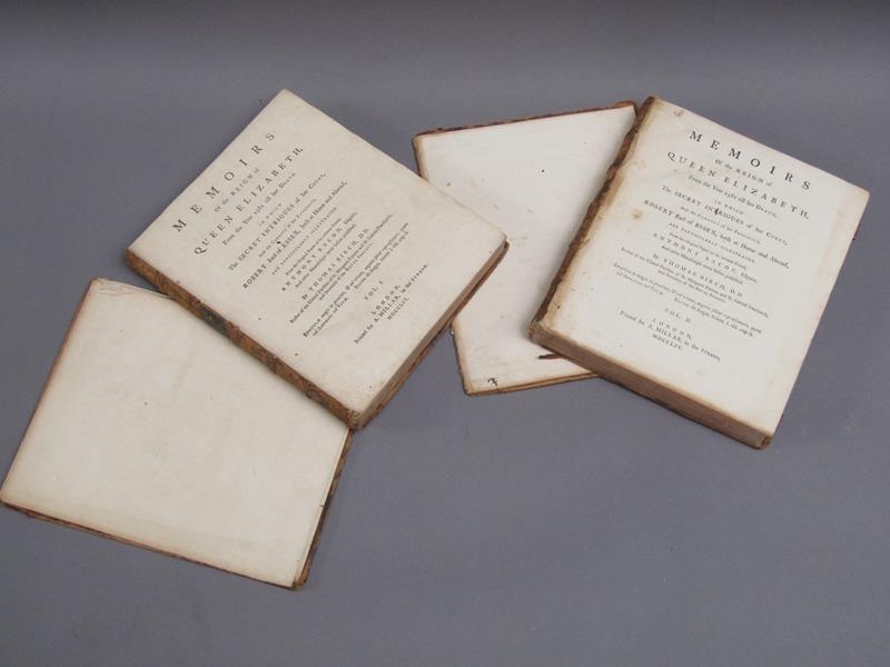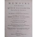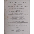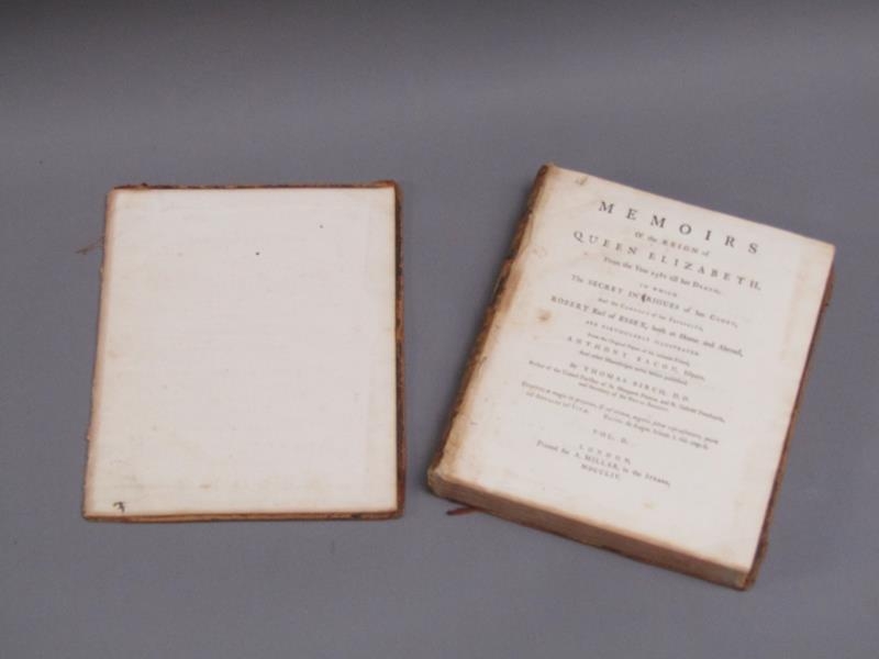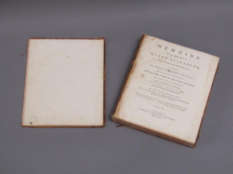 Two books - Memoires of the Reign of Queen Elizabeth from 1581 till her death, by Thomas Birch, being volumes I & II, printed London 1754. - boards and spine detached, books rubbed.
