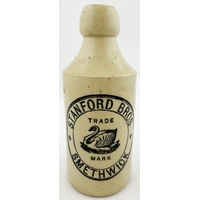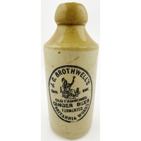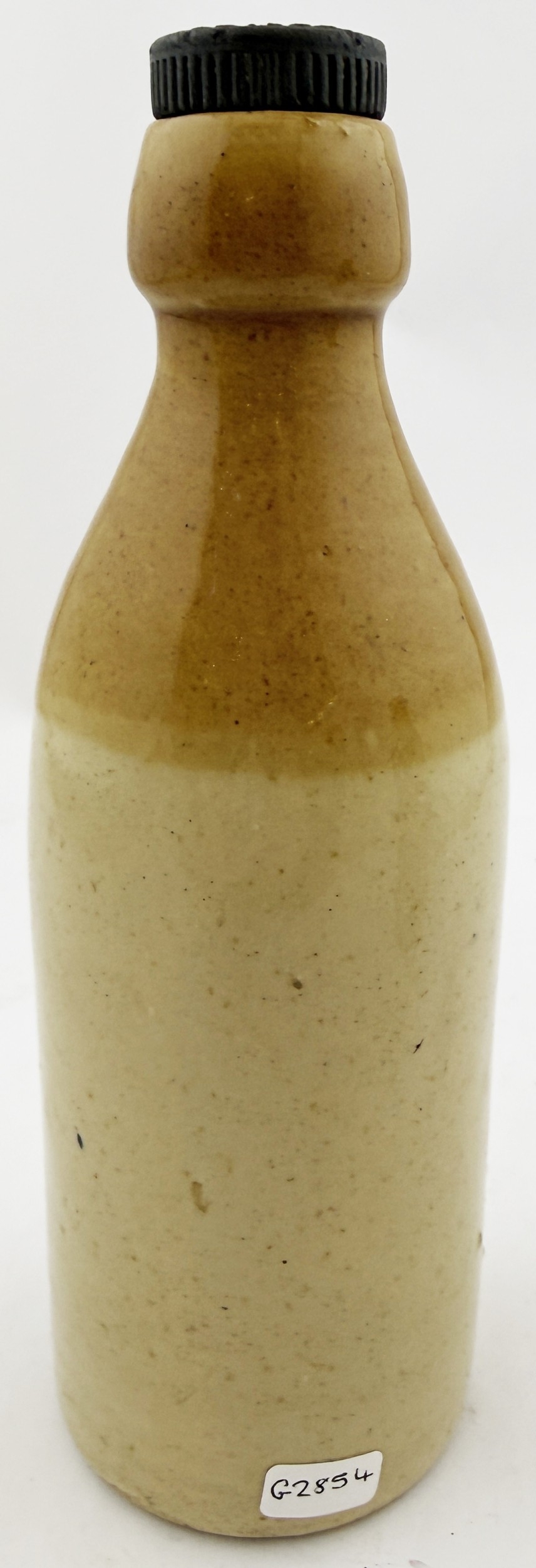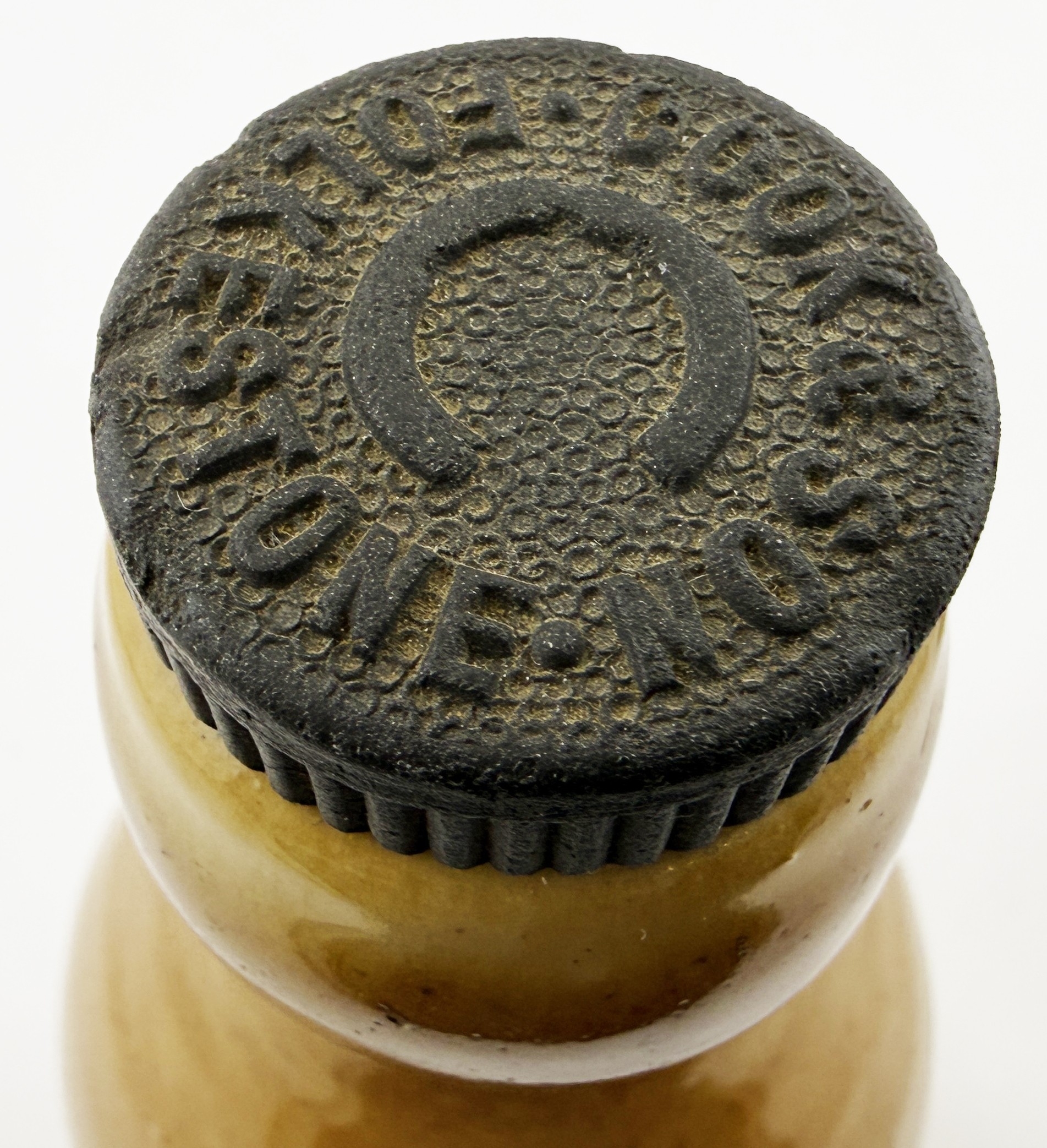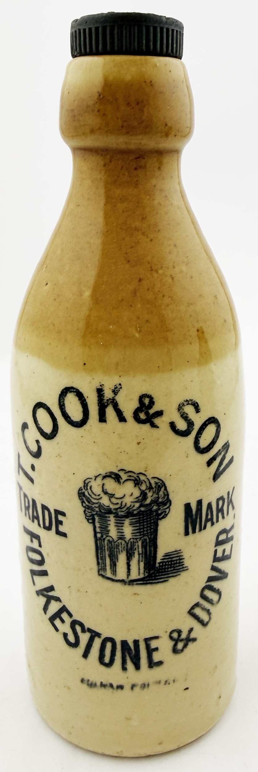 T. COOK & SON KENT GINGER BEER BOTTLE. Ch., t.t. ginger T. COOK & SON/ TRADE MARK/ FOLKESTONE & DOVER around pict. t.m. of foaming glass of ginger beer. Printed Fulham Pottery p.m. below the print. Original named stopper. Small lip chip.