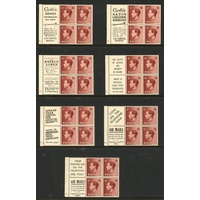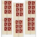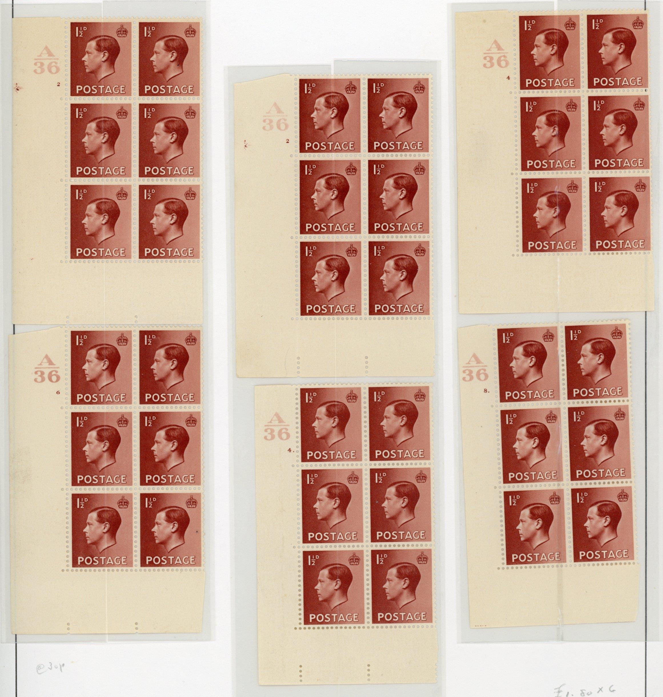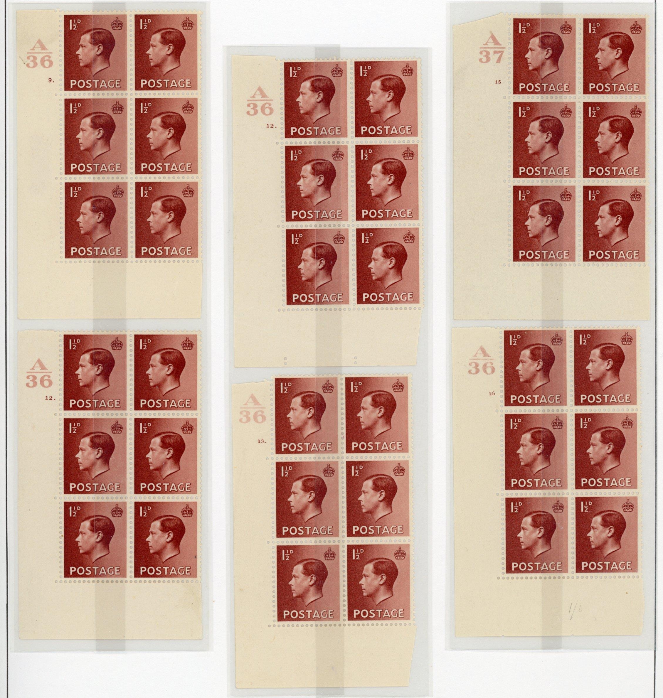 1½d RED- BROWN CYLINDER BLOCK RANGE: Blocks of 6 on pages inc. A36 2 no dot (2); 4 dot/no dot; 6 no dot; 8 dot; 9 dot; 12 dot (2); 13 dot; and 16 no dot; plus A35 15 no dot. (12 blocks)
