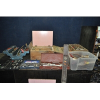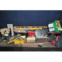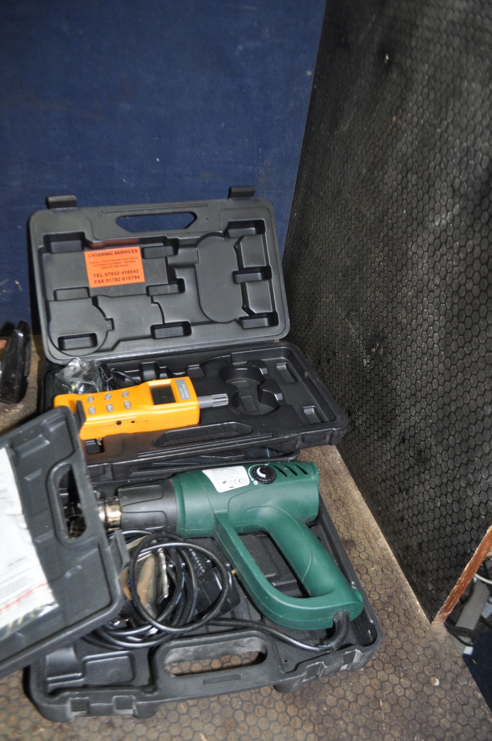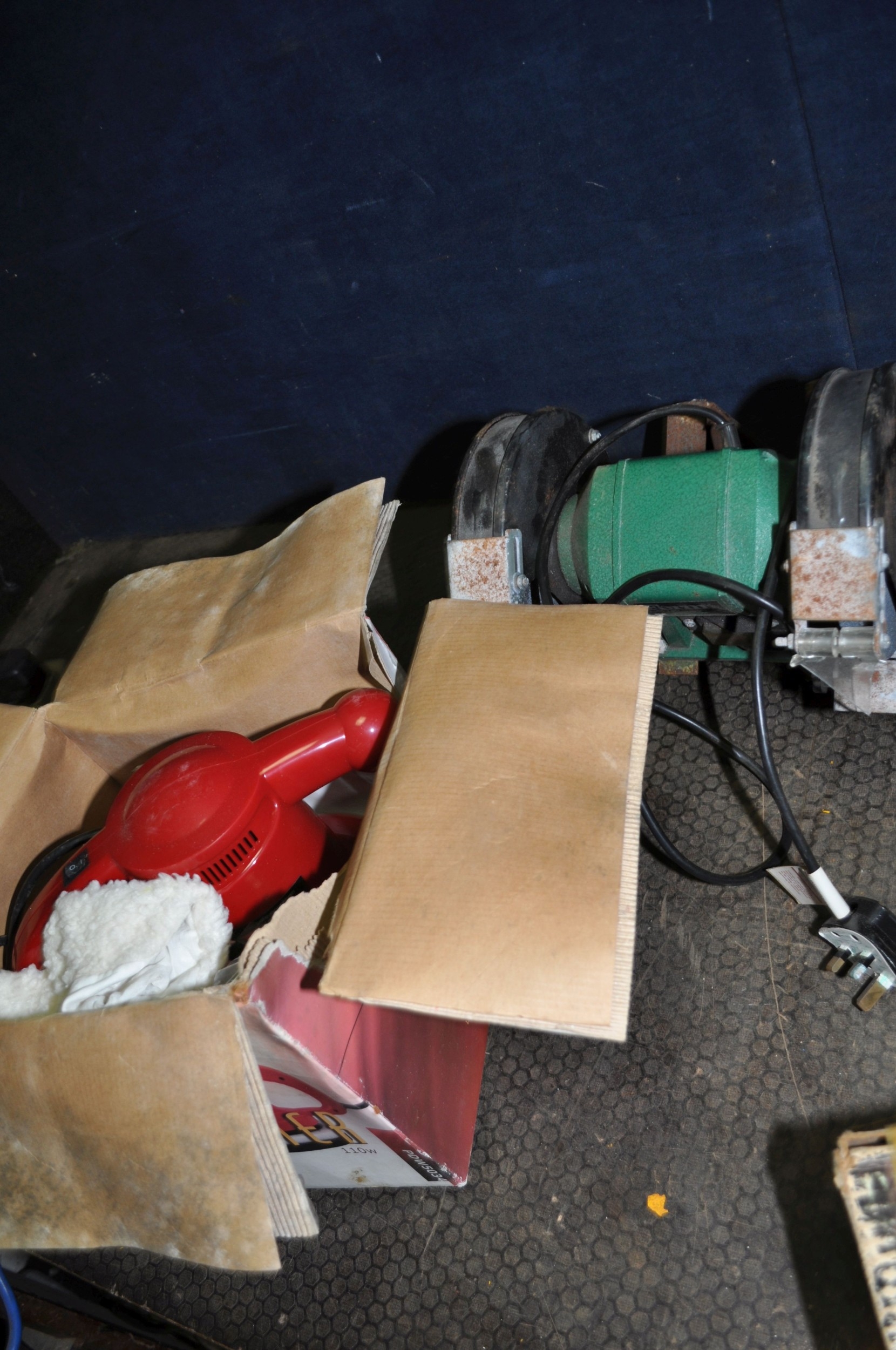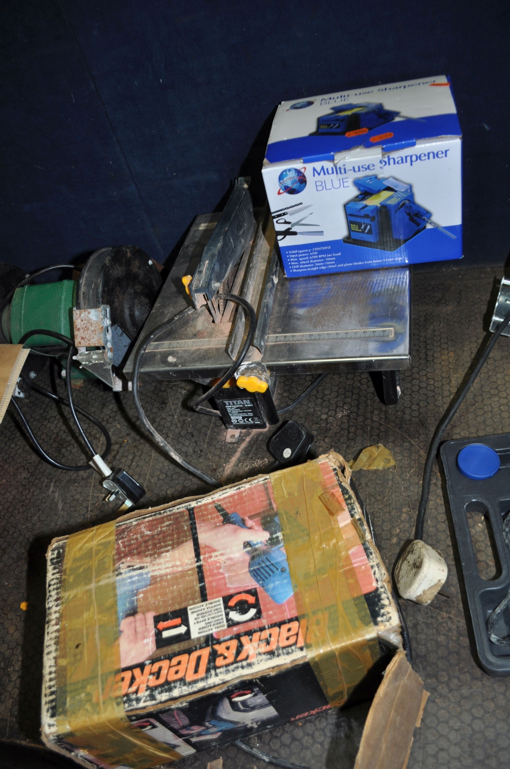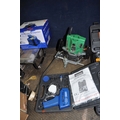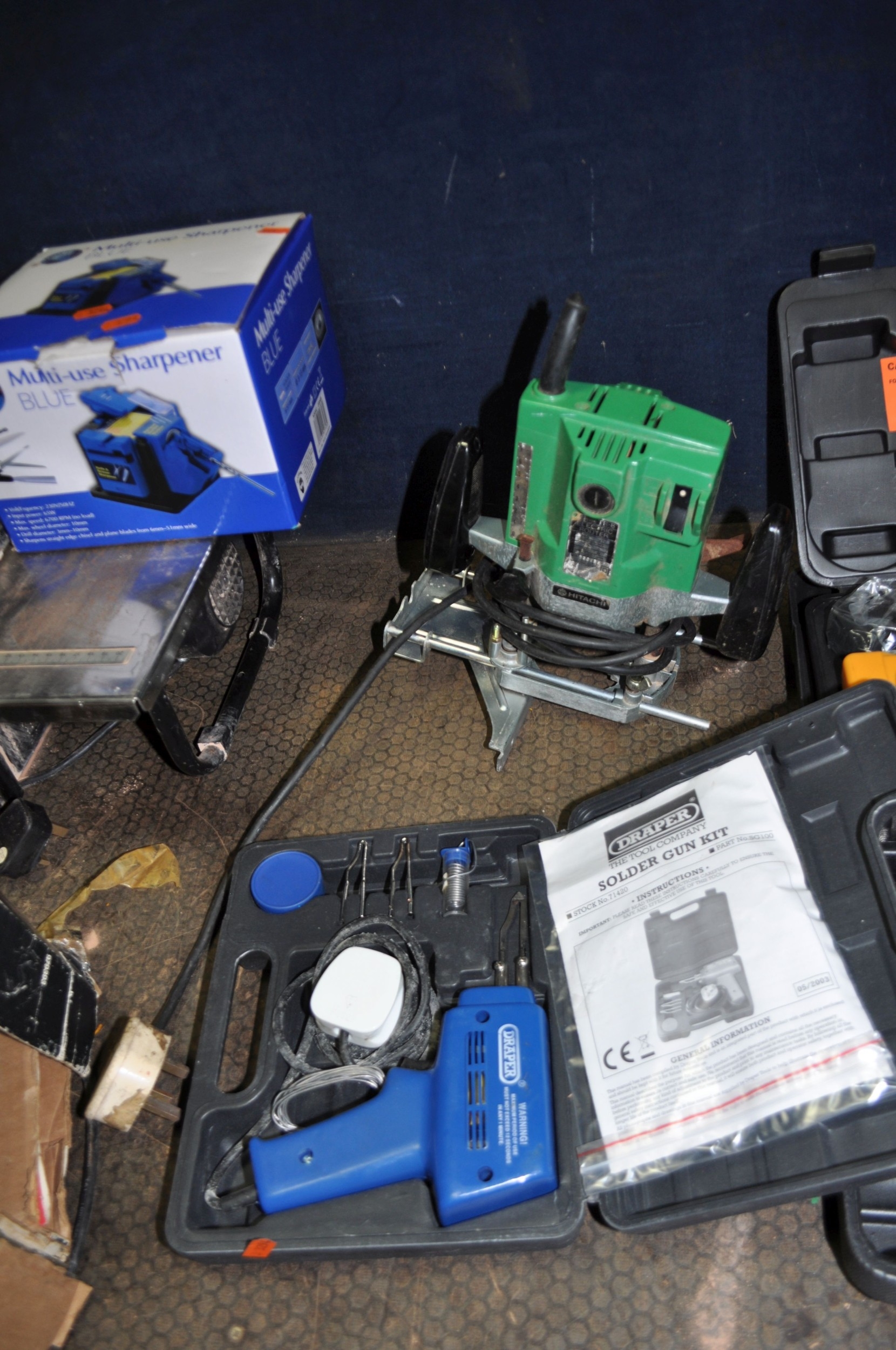 A COLLECTION OF POWER TOOLS including a Hitachi router, a Ferm bench grinder, a Draper soldering iron, a heat gun etc (all UNTESTED)