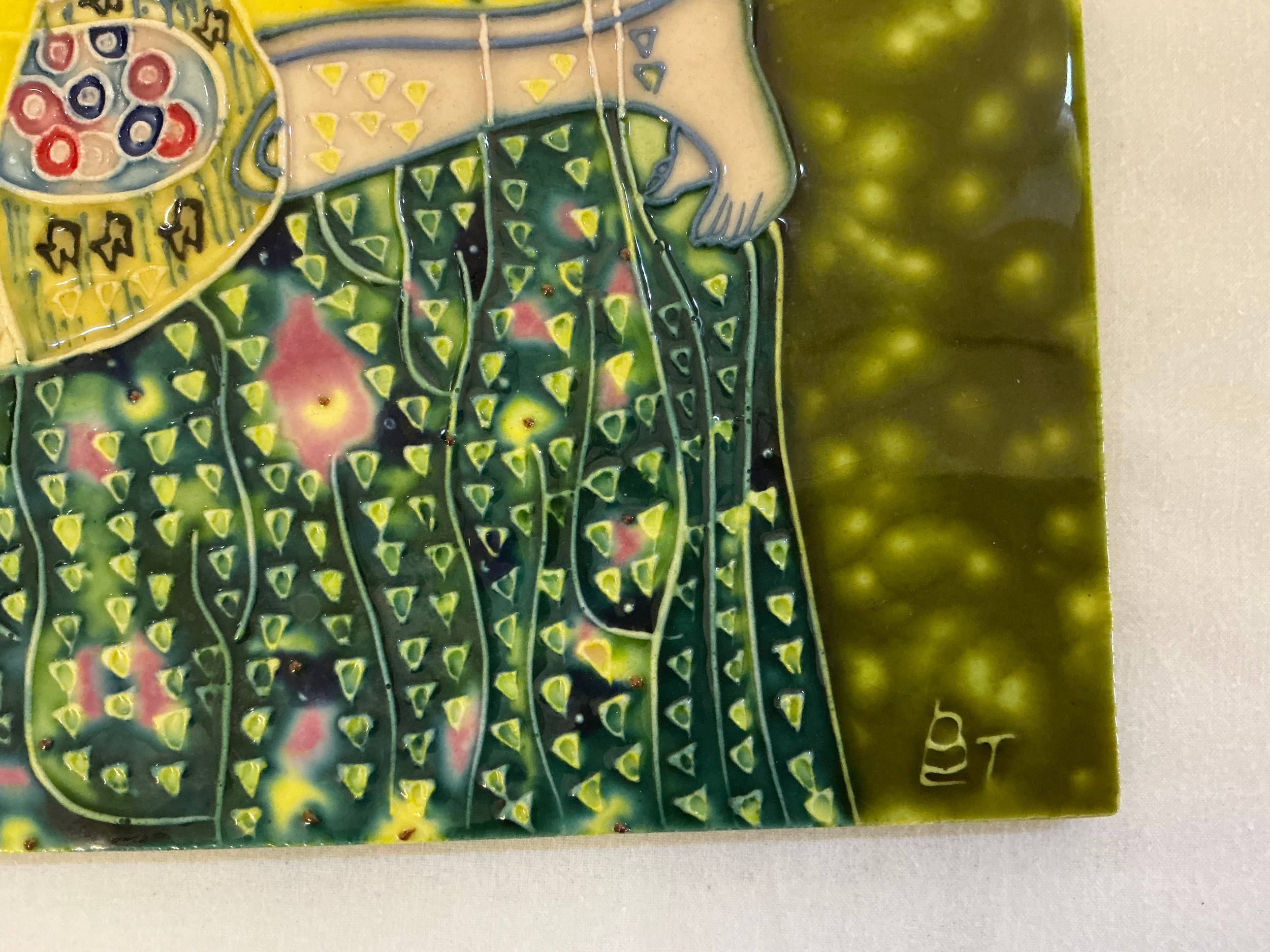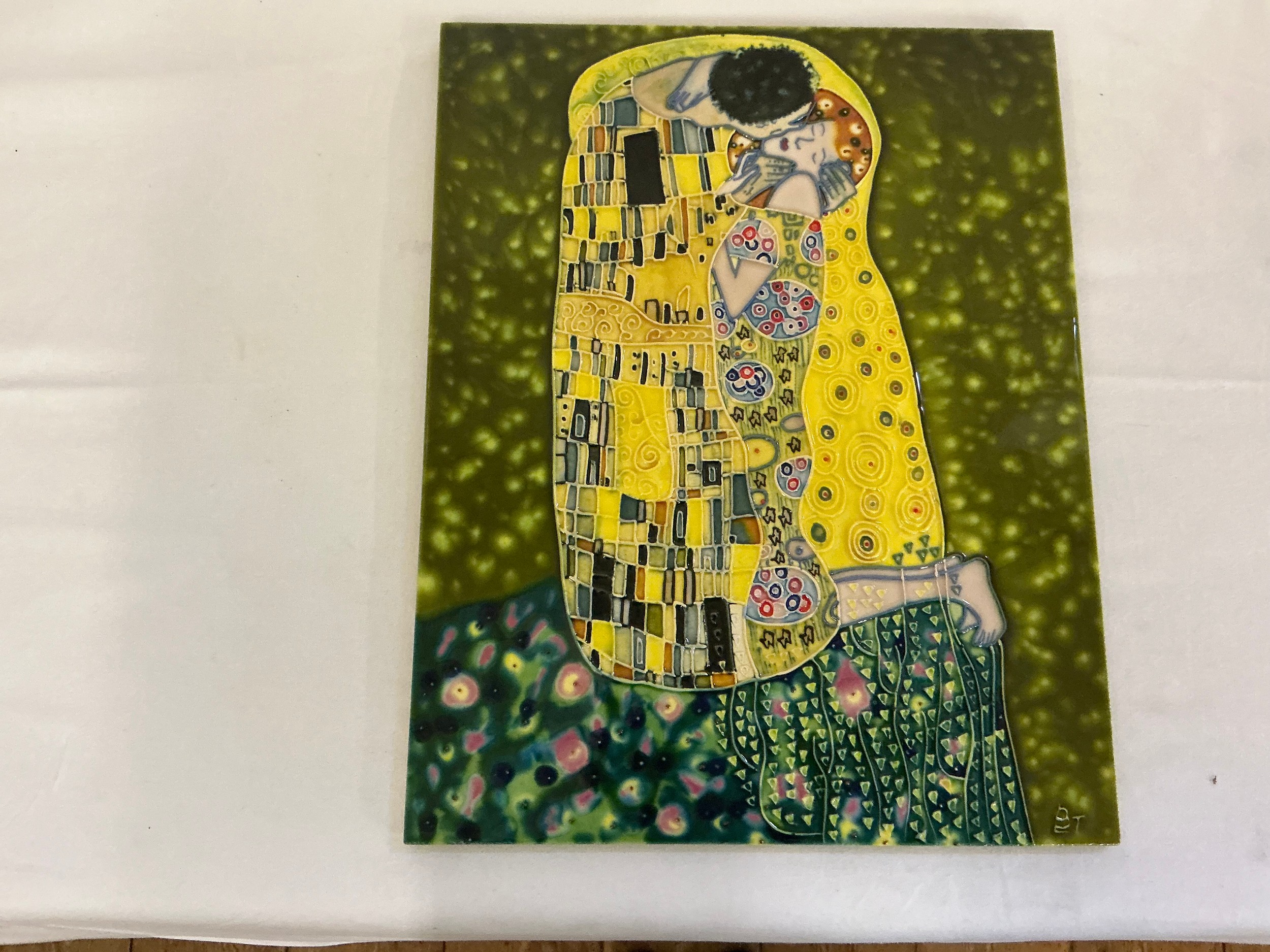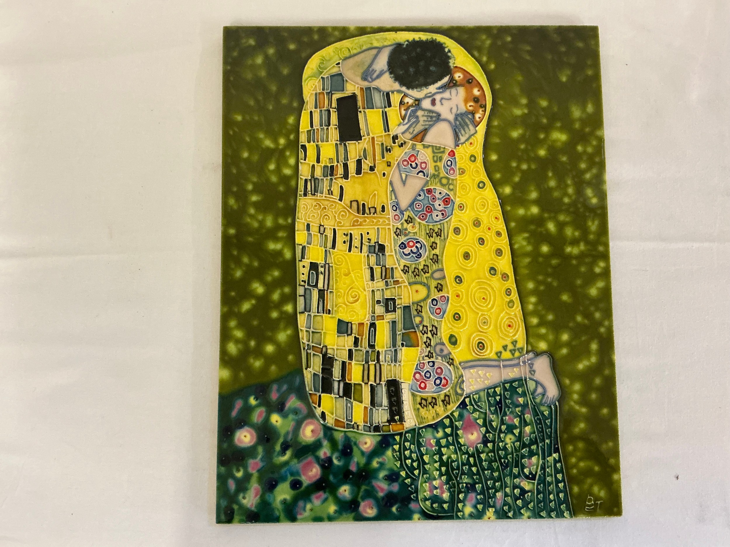 A B T monogrammed Slip-Ware Plaque decorated with Gustav Klimt "The Lovers". Measuring: 28cms x 35cms.
