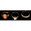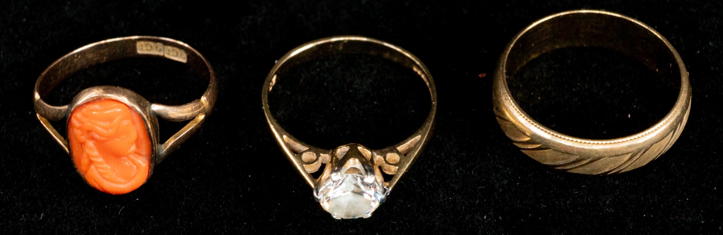 Jewellery: Three 9ct gold rings, one 4.5mm fancy band, size M, one set with an oval carved coral, ring size L, and one set with a cubic zirconia, ring size K, combined weight 6.1g.