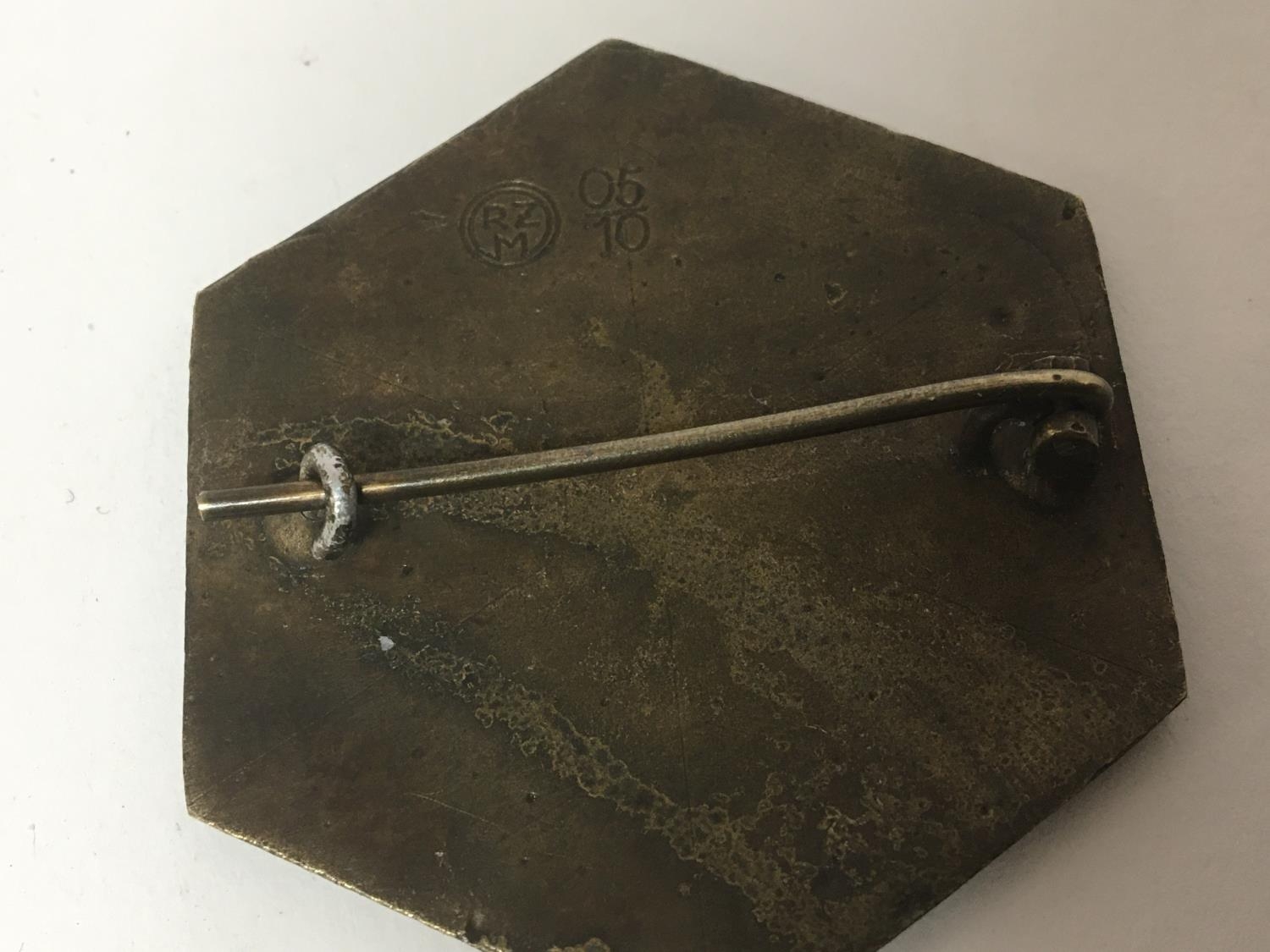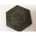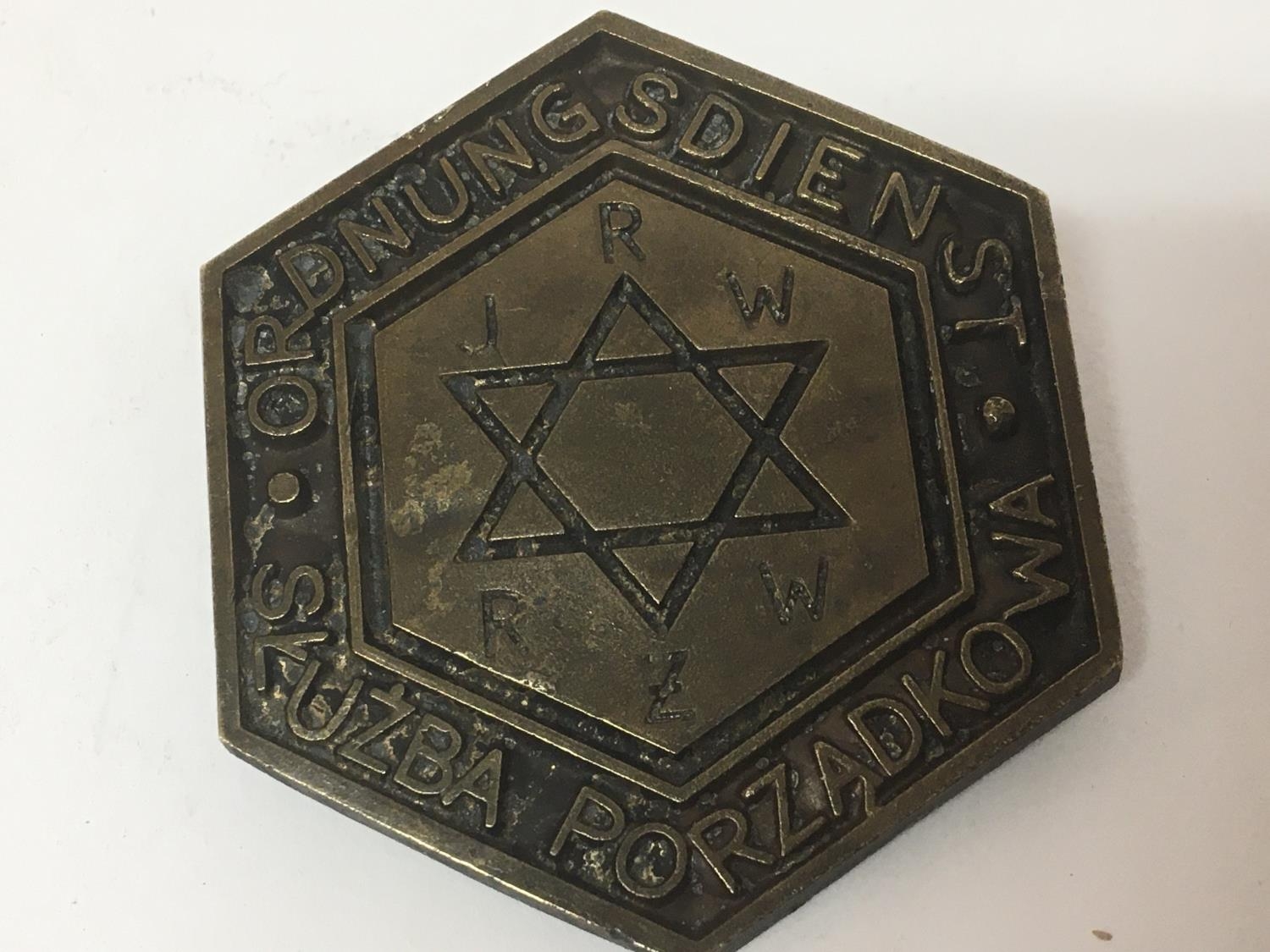 A cast brass Jewish Police Warsaw ghetto badge markings to the reverse not numbered. Possible a retrospective copy. 52mm wide approximately