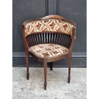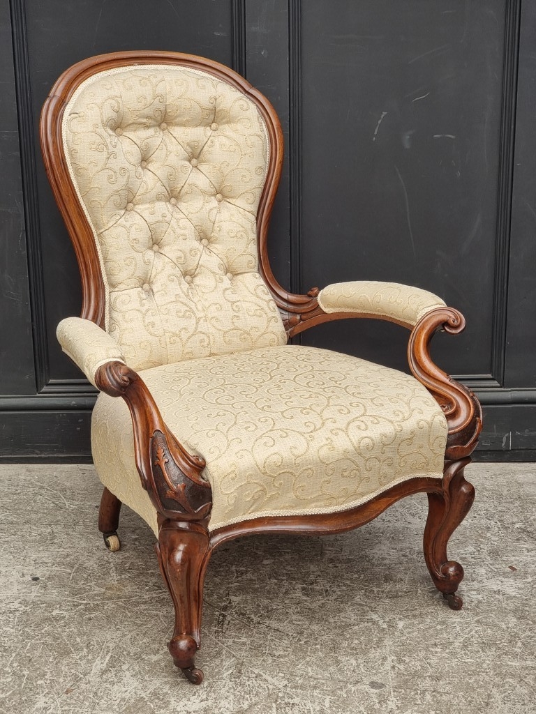 A Victorian carved walnut and button upholstered open arm occasional chair.