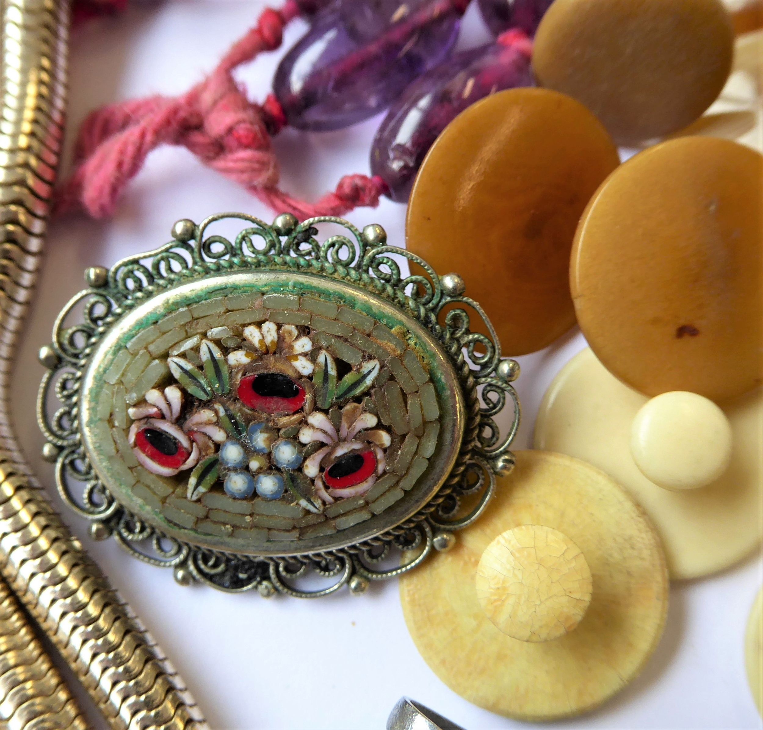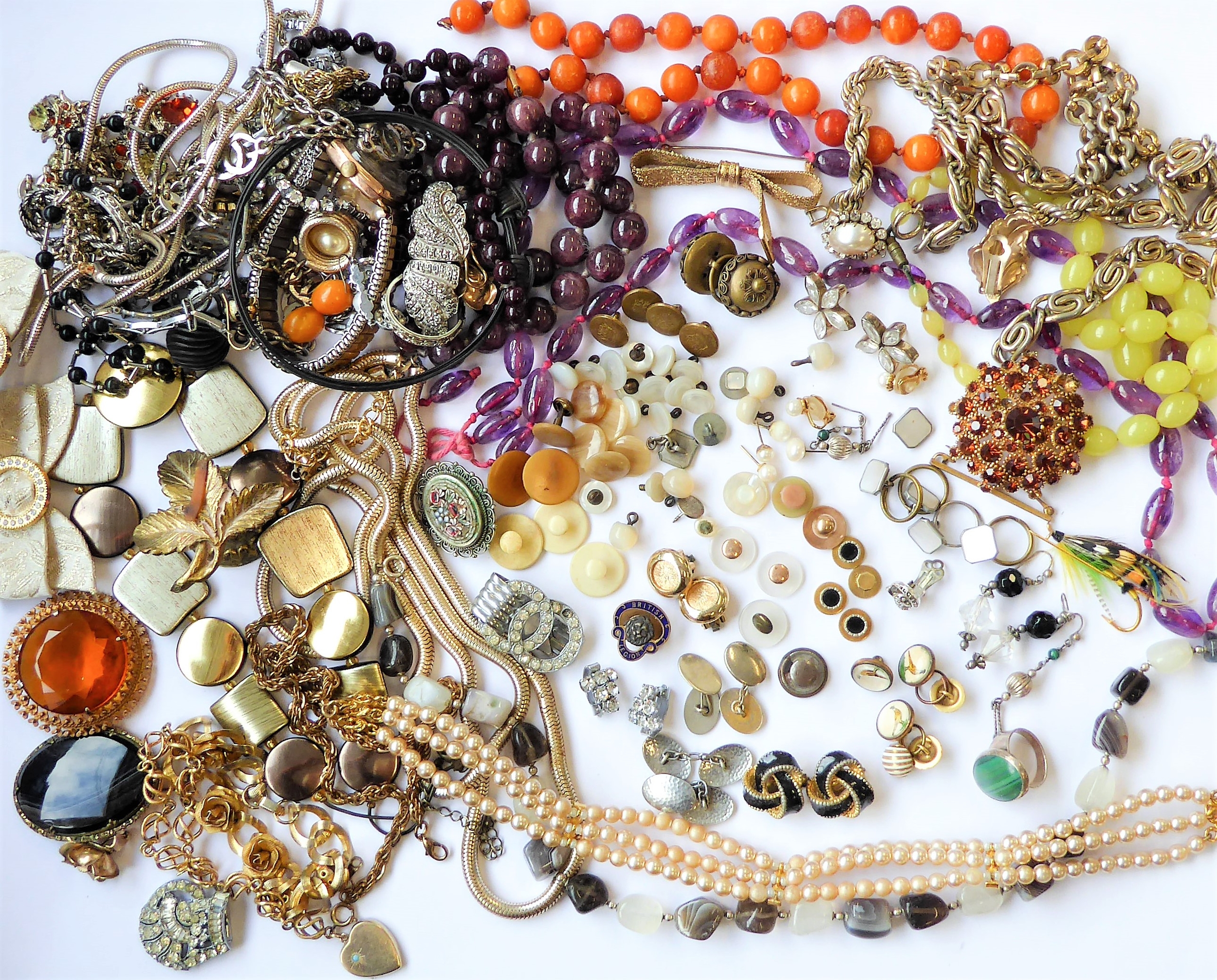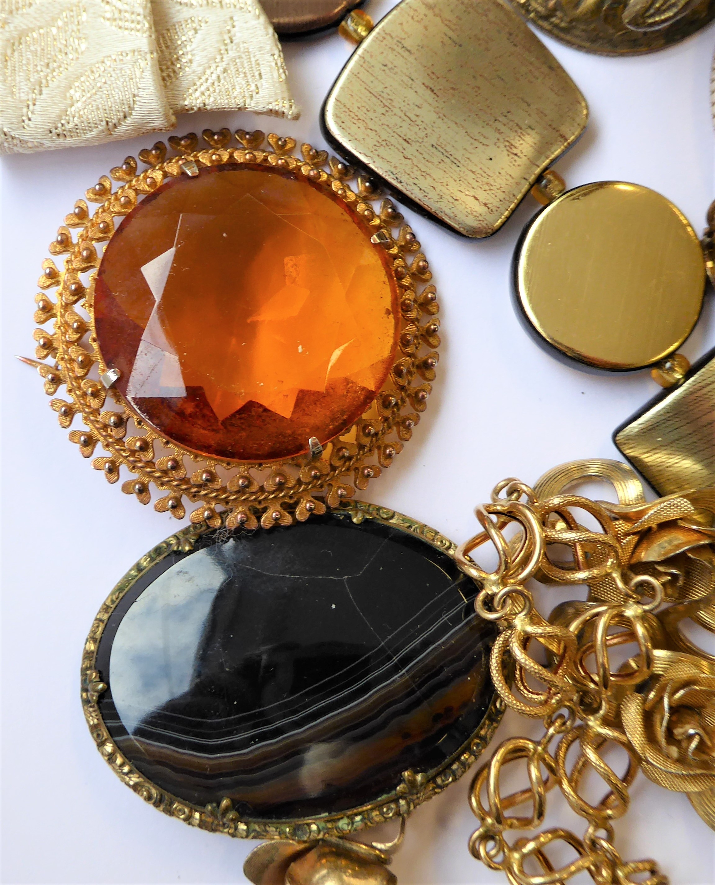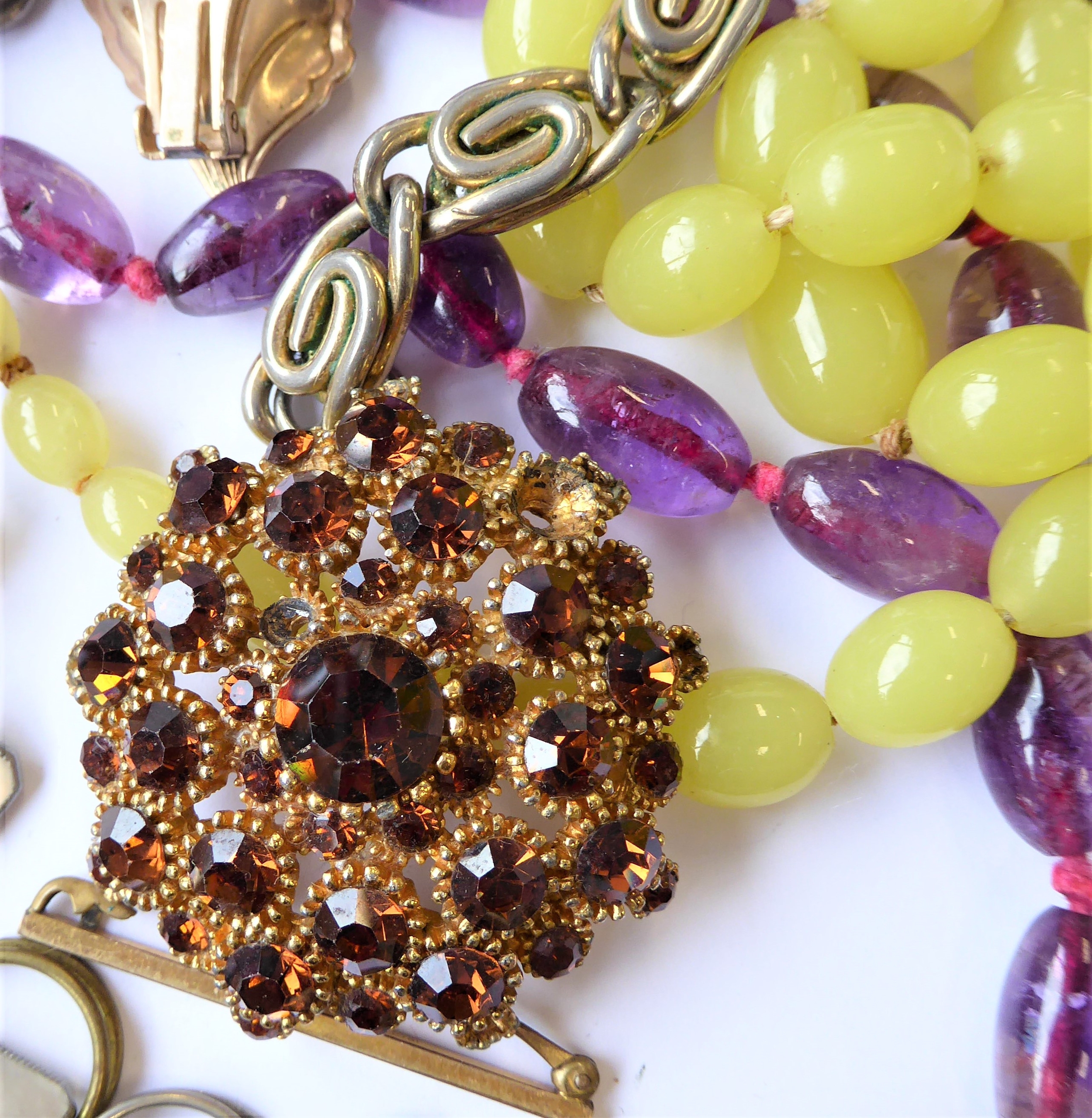 Assorted jewellery and costume jewellery including an oval amethyst (untested) bead necklace, a late 19th century banded agate (a/f) and gilt metal brooch, a gentleman's 9-carat gold wrist watch by Record (later strap) and assorted cufflinks and studs