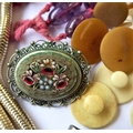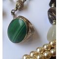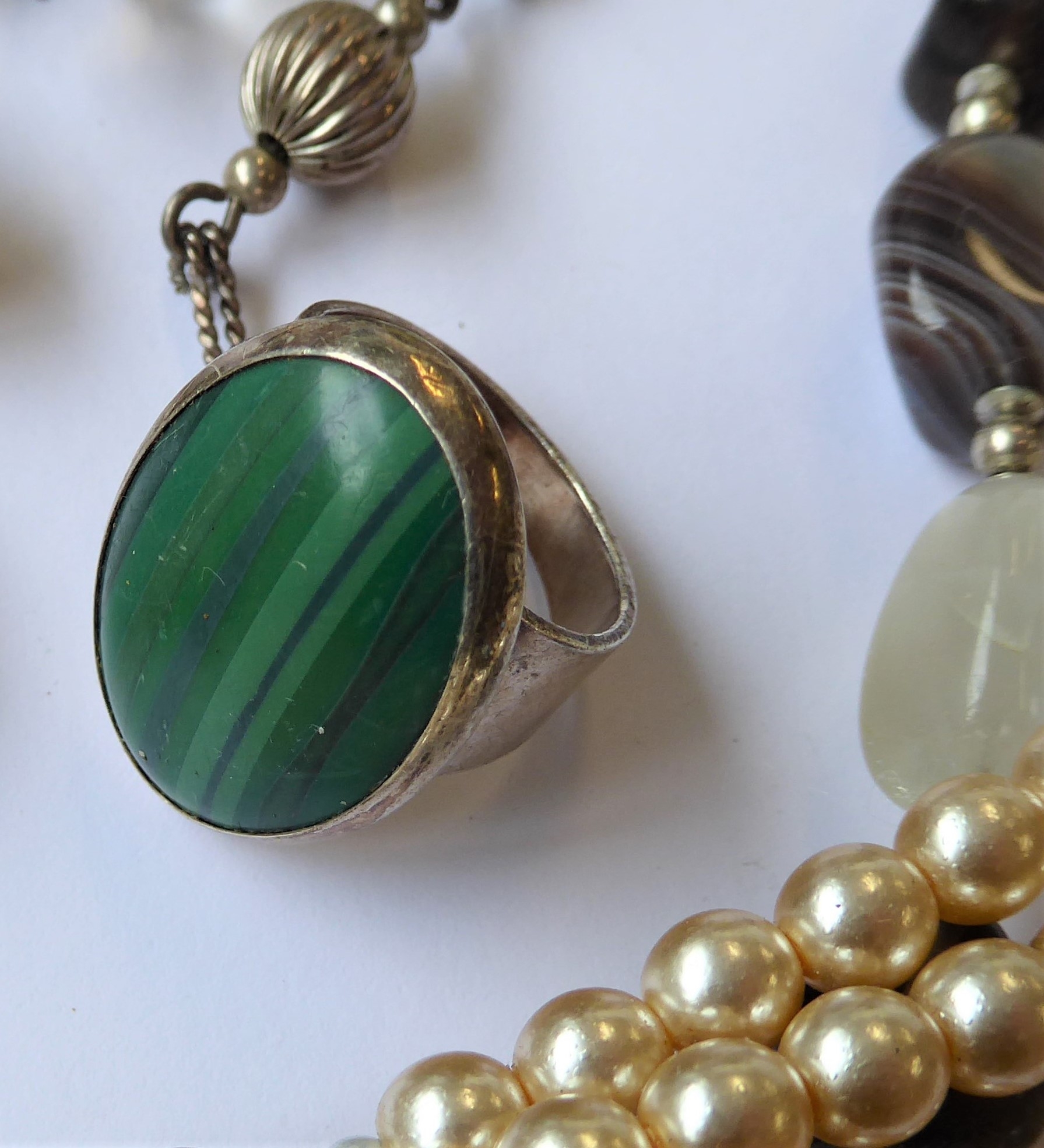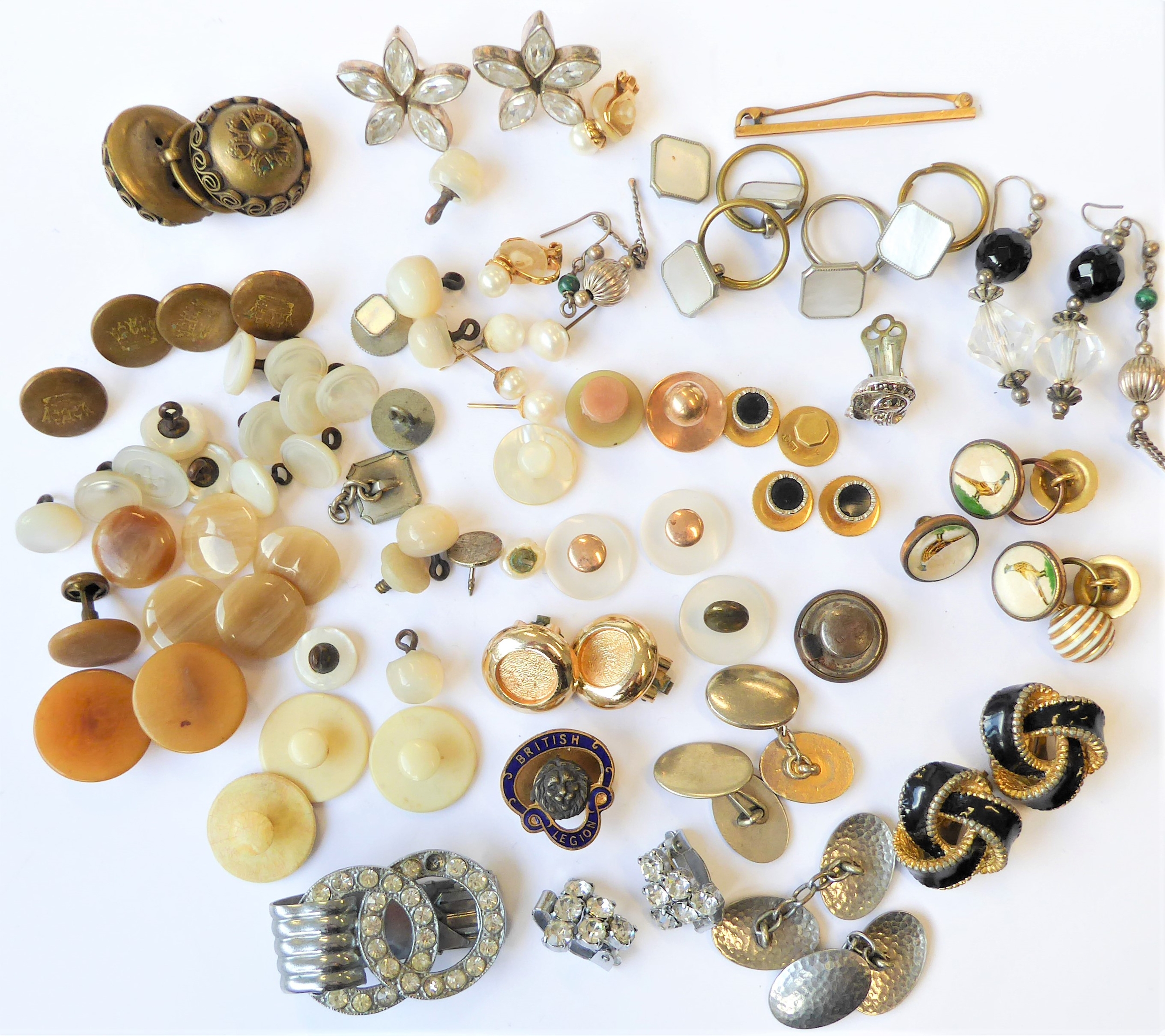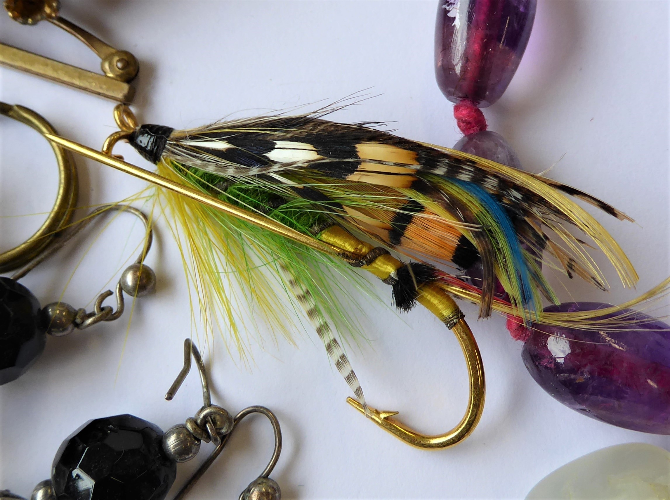 Assorted jewellery and costume jewellery including an oval amethyst (untested) bead necklace, a late 19th century banded agate (a/f) and gilt metal brooch, a gentleman's 9-carat gold wrist watch by Record (later strap) and assorted cufflinks and studs