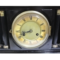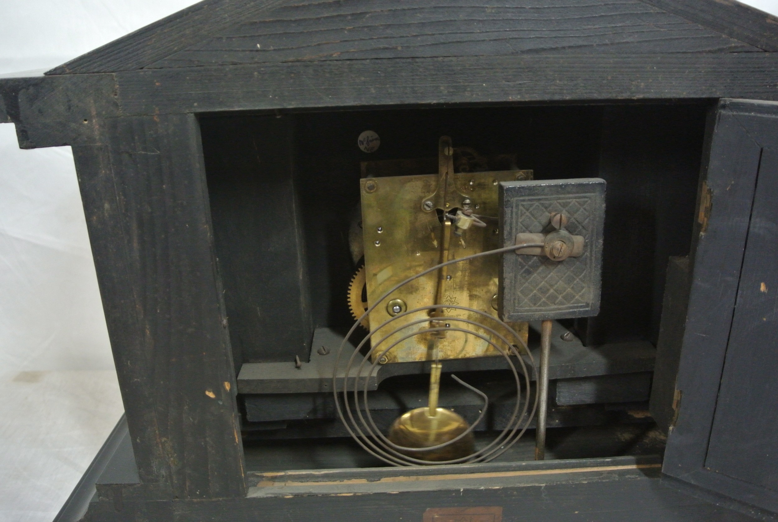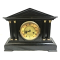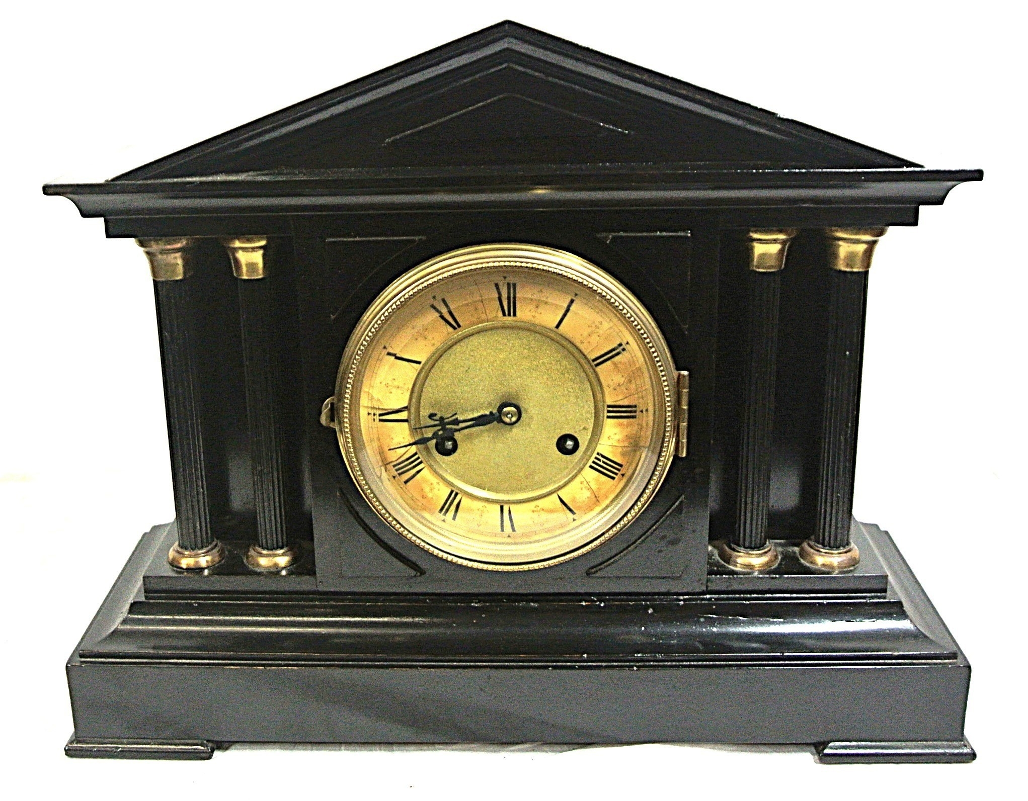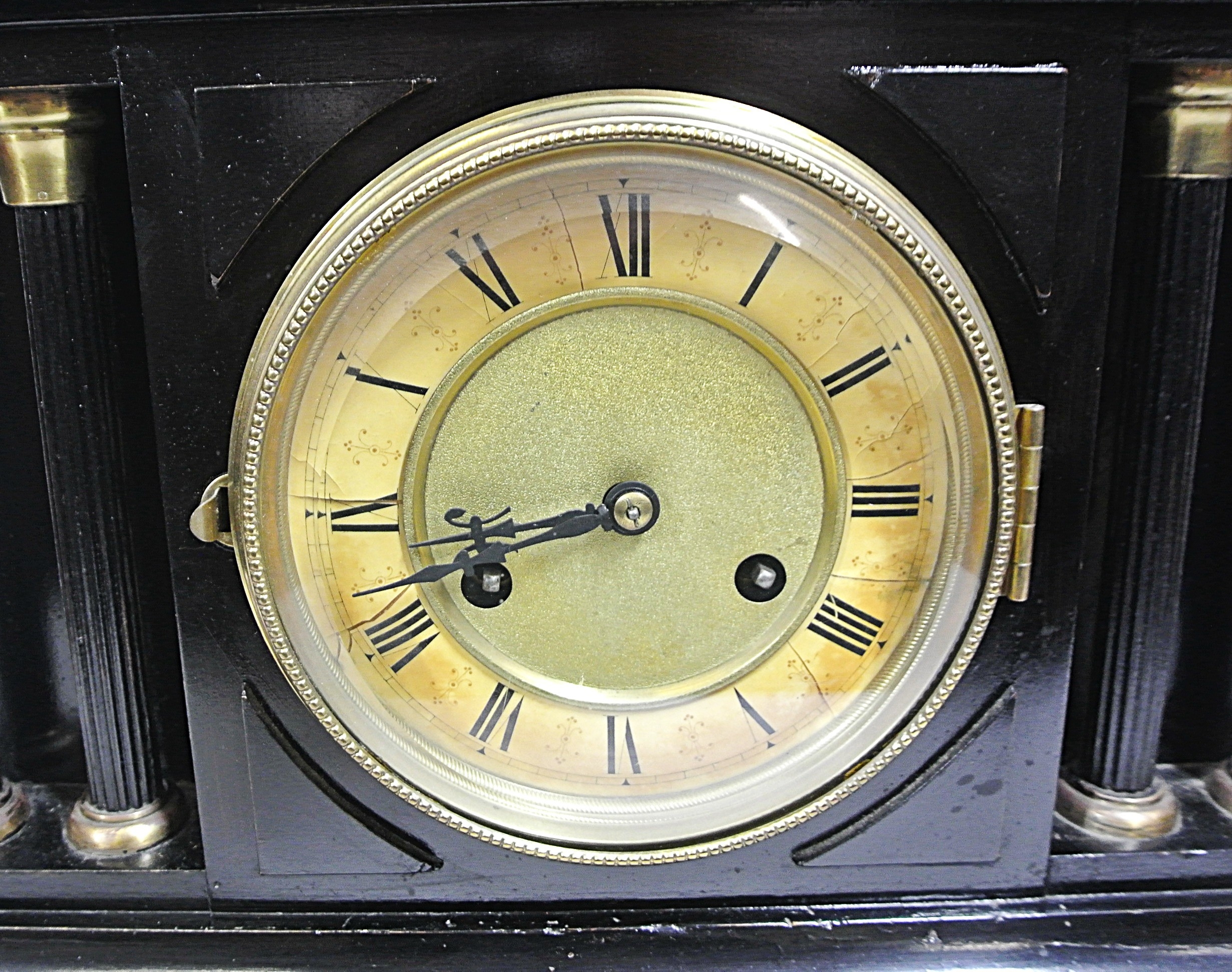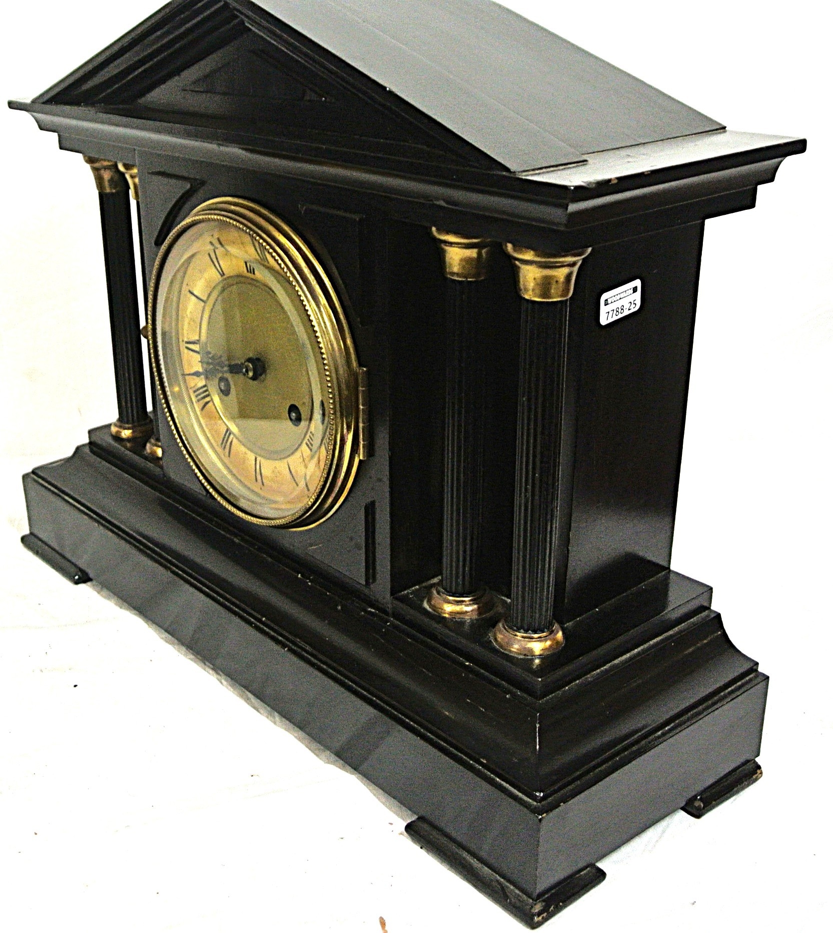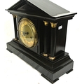 French style mantle clock with angled top, round brass framed enamel dial, on bracket feet