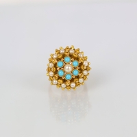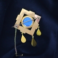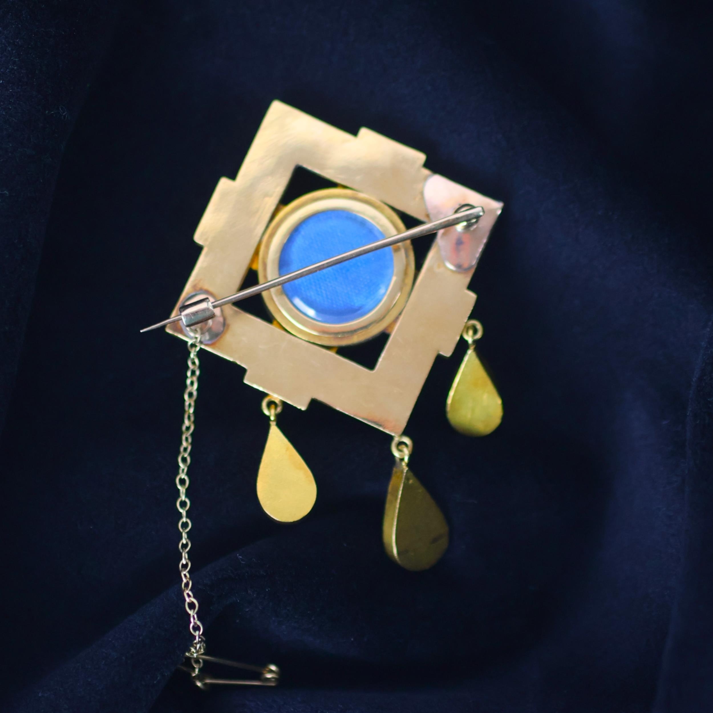 A 19th century Egyptian revival micro mosaic brooch, probably Italian, the square shaped openwork brooch with central raised circular depiction of pharaohs head, suspending trio of tear shaped drops, glazed aperture to reverse, indistinctly stamped, 6cm long, 18gms (at fault)