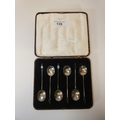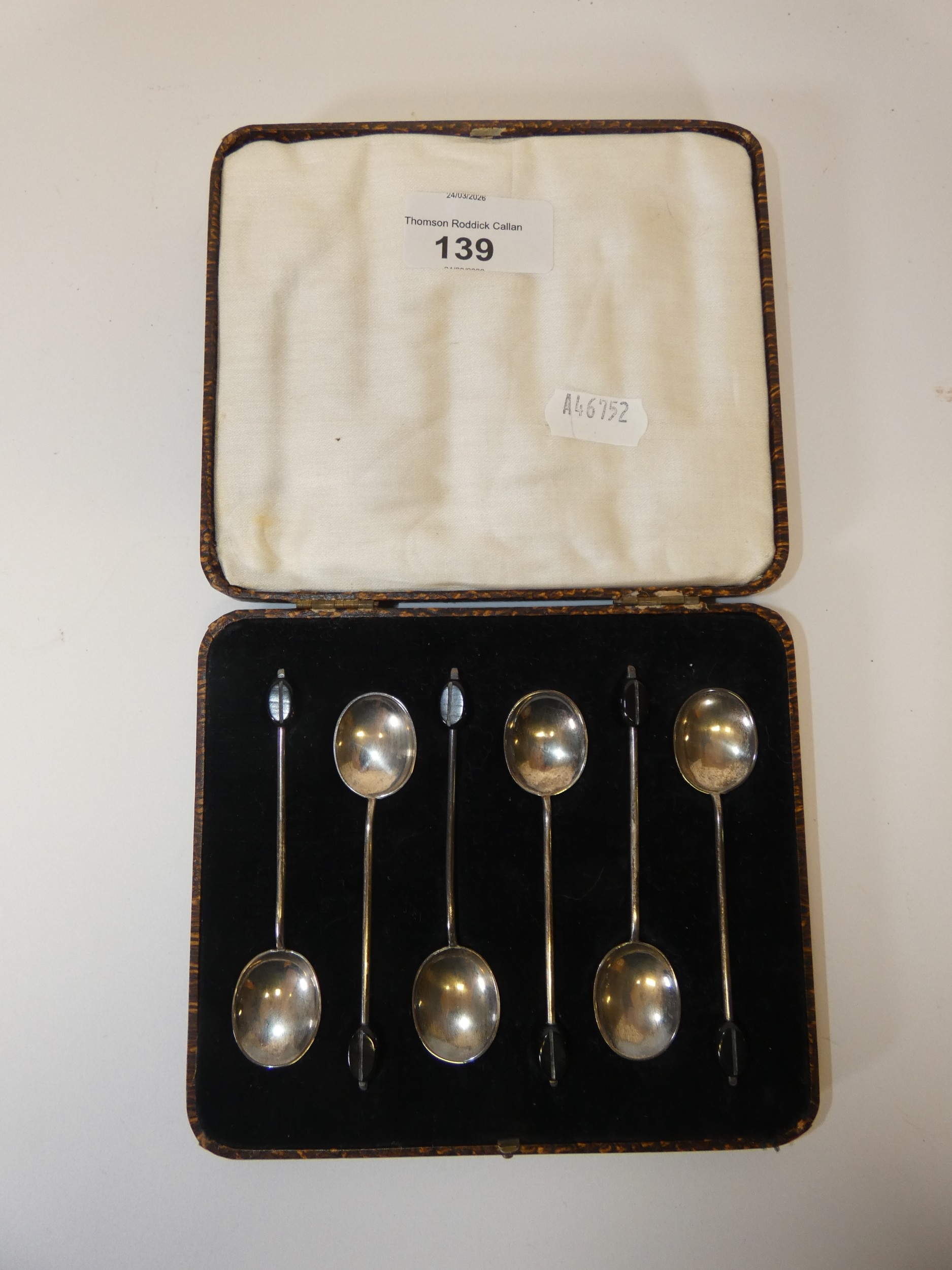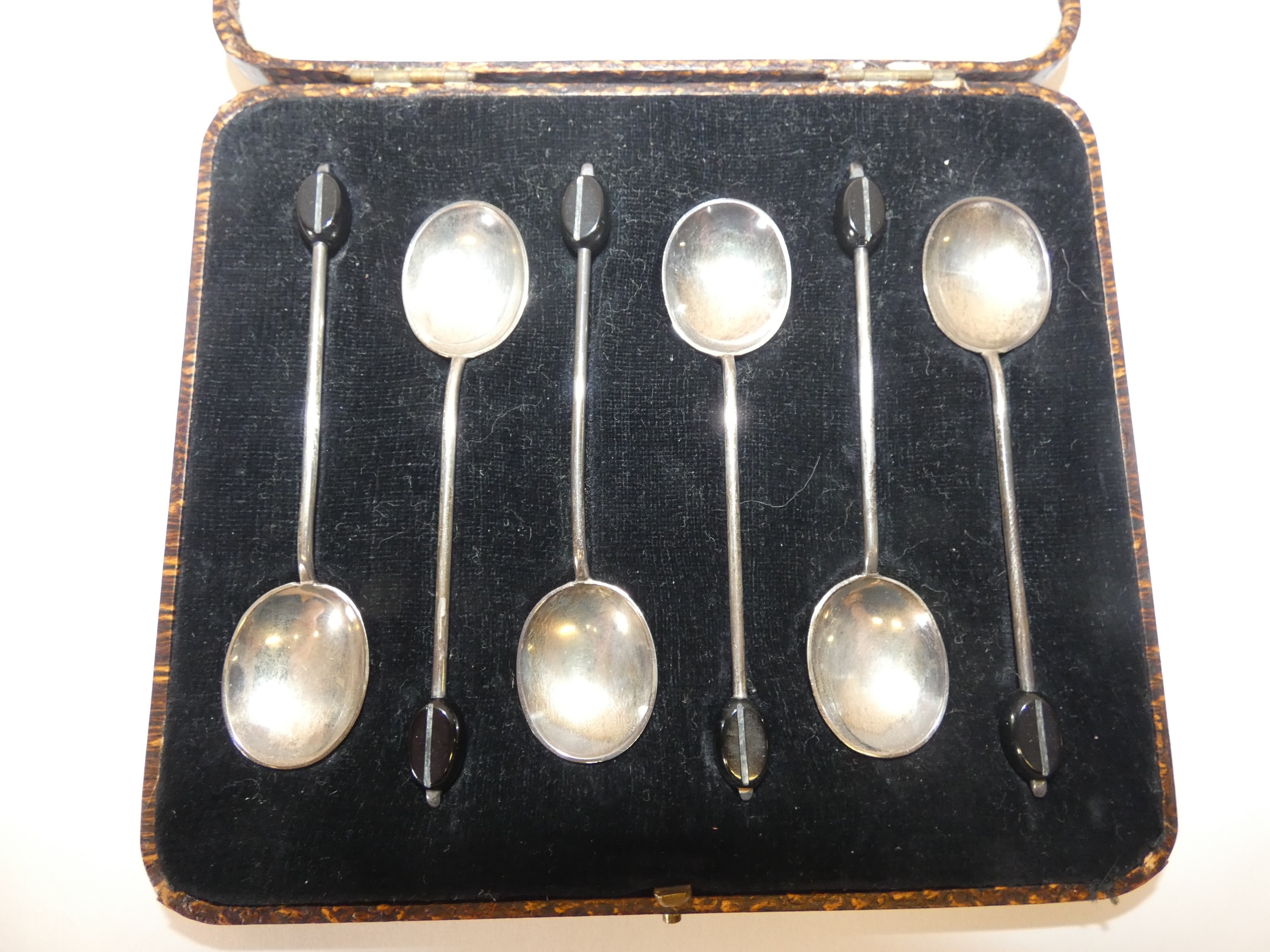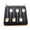 Set of six silver bean top coffee spoons in fitted case.
