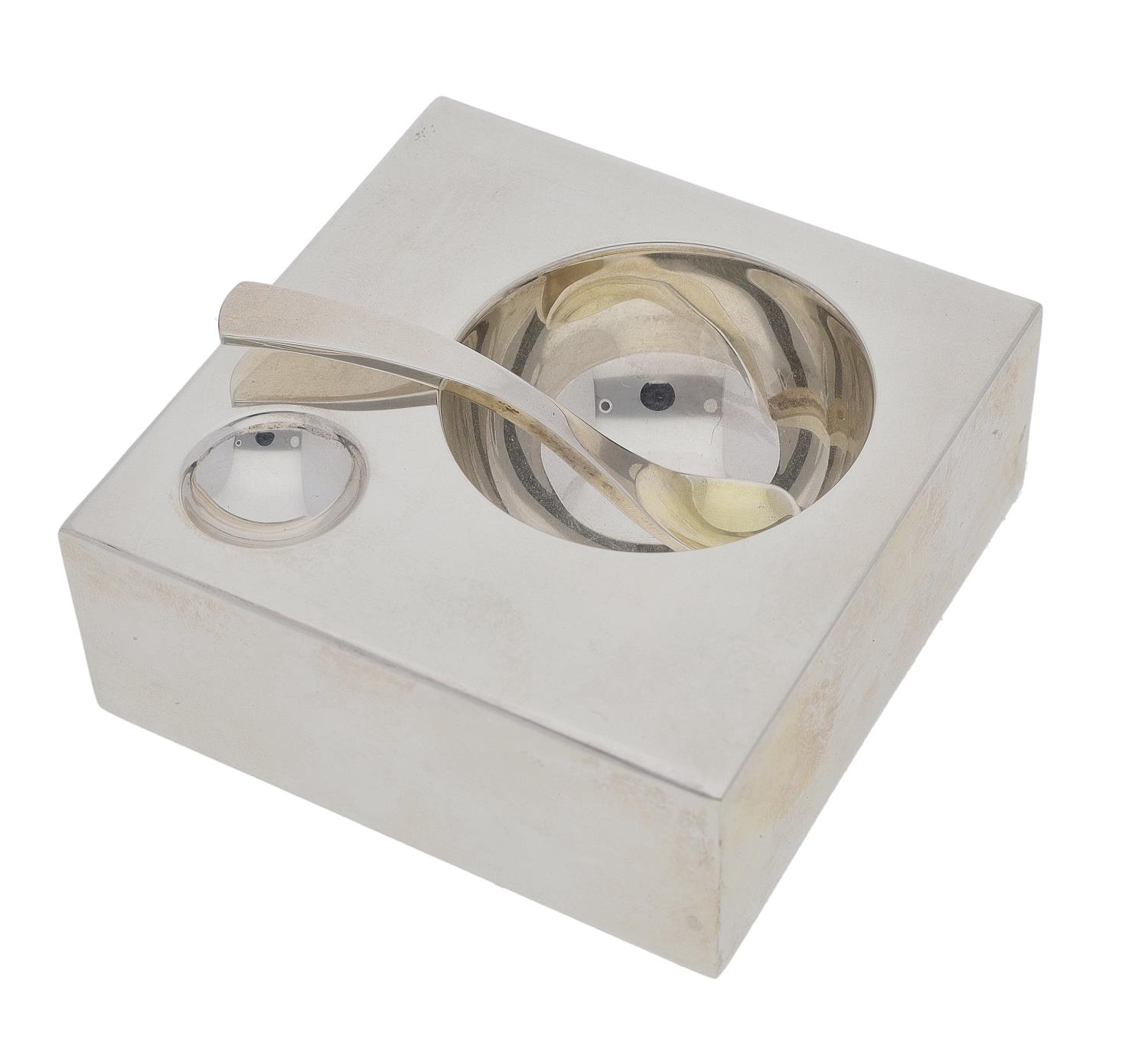 Philip Kydd silver condiment cube stand with spoon, hallmarks for London 2016, 3" x 3", 180gm total