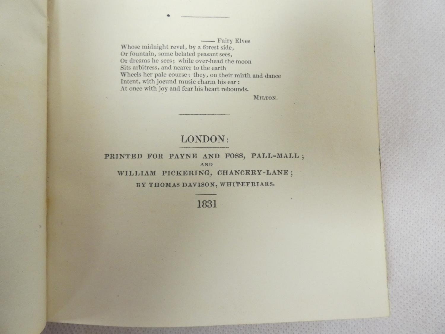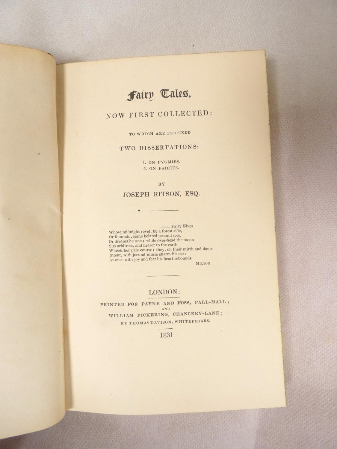 FORE-EDGE PAINTING. Ritson Joseph. Fairy Tales Now First Collected to which are Prefixed Two Dissertations 1. On Pygmies 2. On Fairies. Fore-edge painting of elves & fairies. Nice calf gilt extra by Wickwar, a.e.g. Marbled endpapers. Very clean internally. 1831.