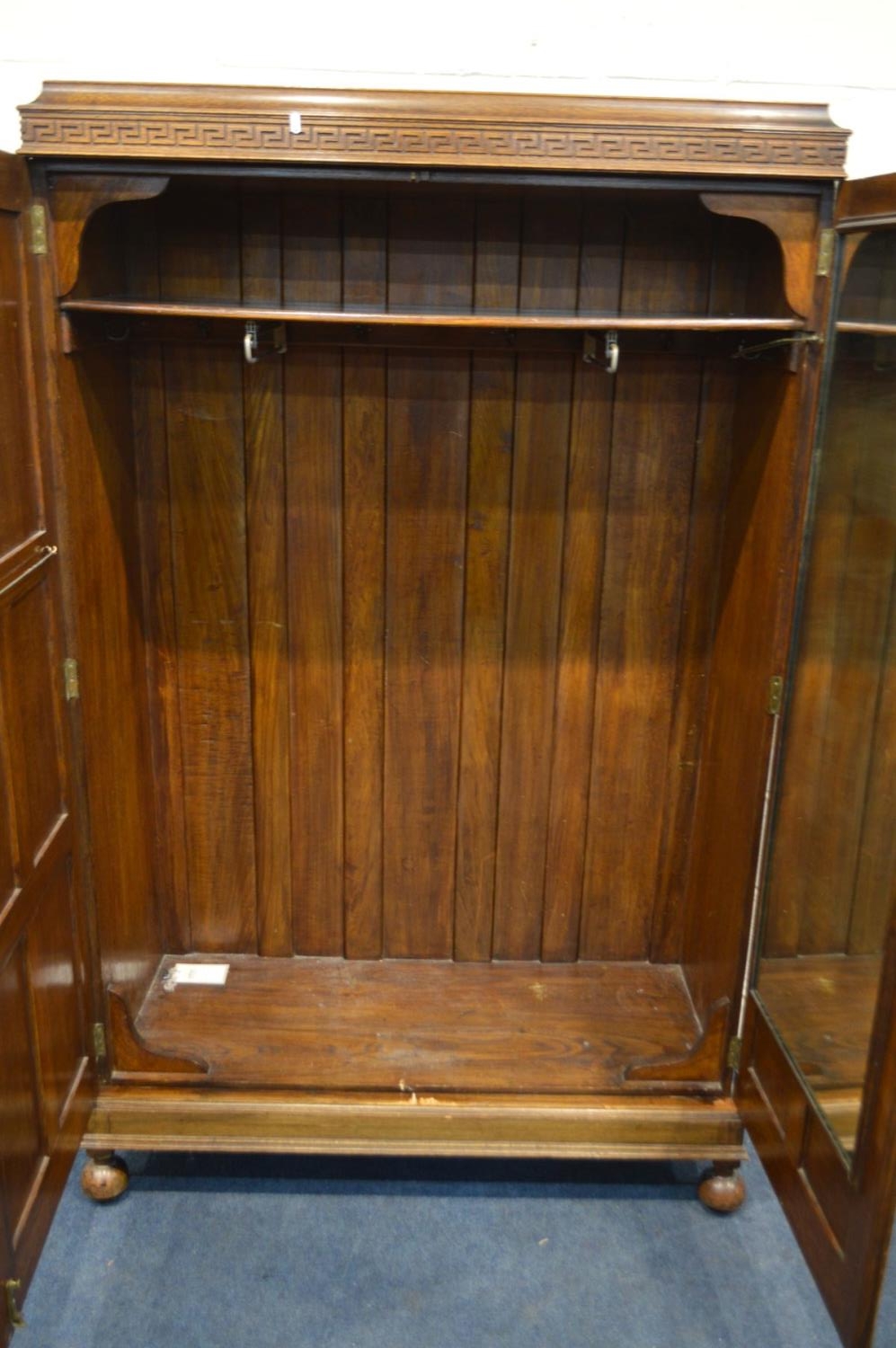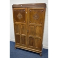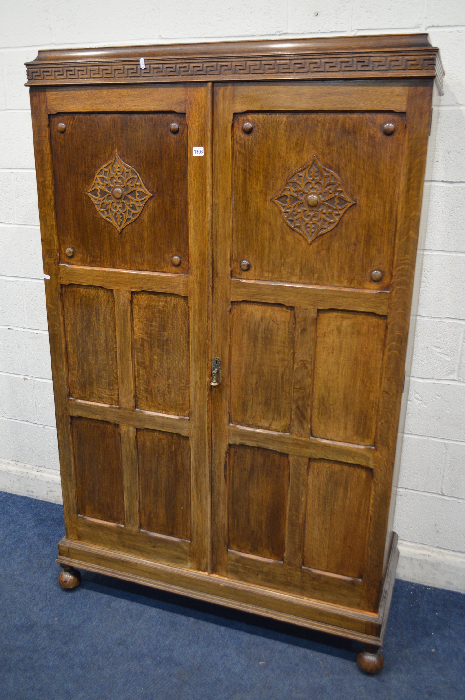 A MID 20TH CENTURY OAK DOUBLE PANELLED DOOR WARDROBE, with raised fretwork decoration, width 116cm x depth 49cm x height 188cm