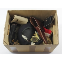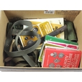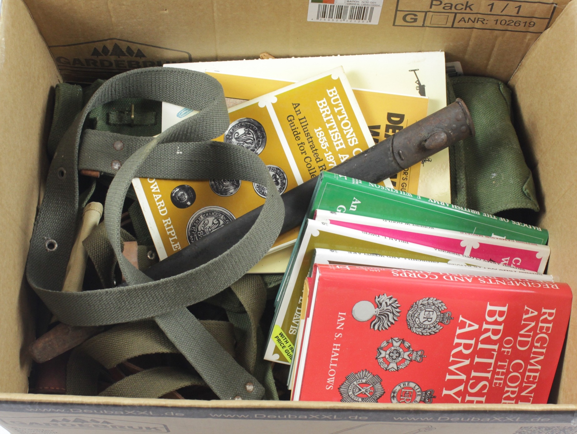 Box Militaria to incl reference books, Slings, Holsters, SMLE scabbard, Bren Barrel Bag and Pouches (qty)