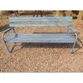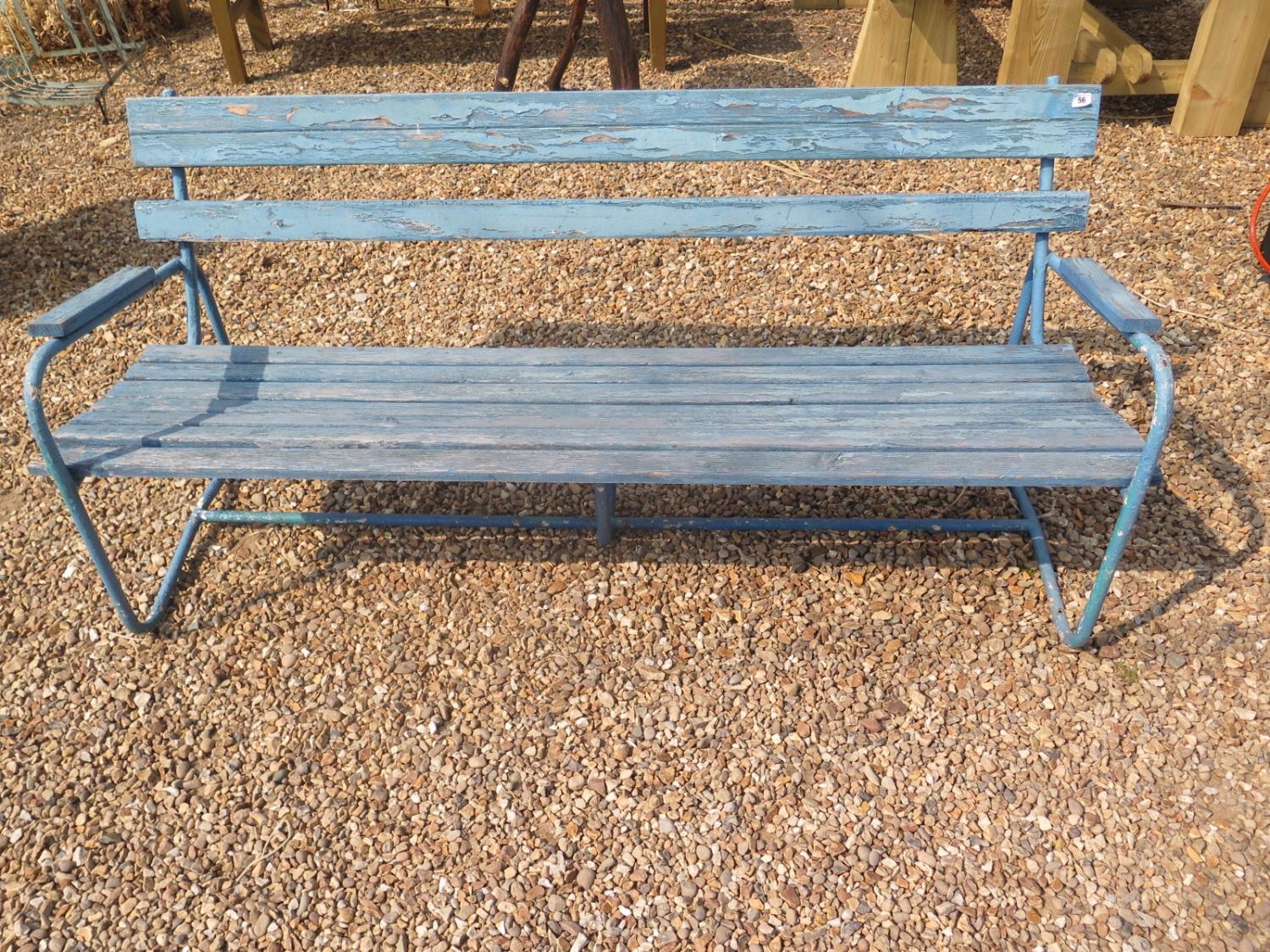 An early 20th century rustic garden bench with original distressed paint, comprising wooden slats on a tubular metal frame - approx 169.5cm W