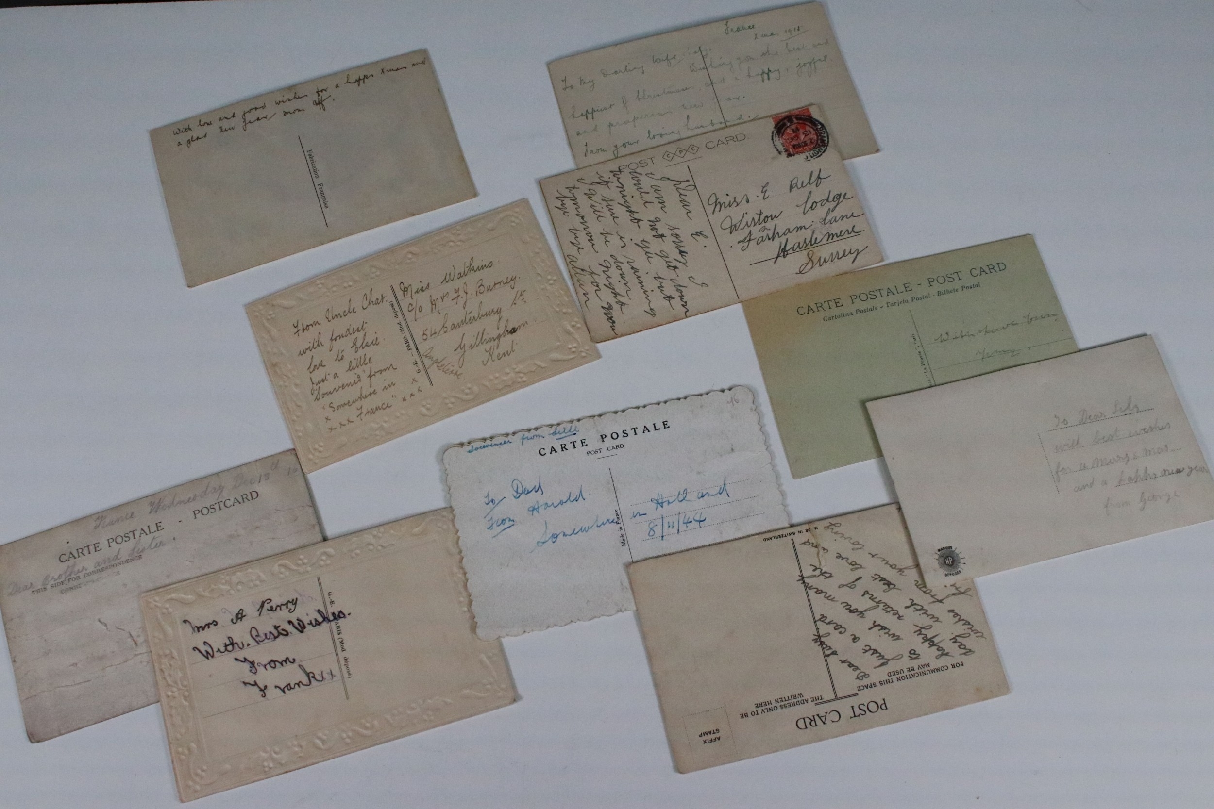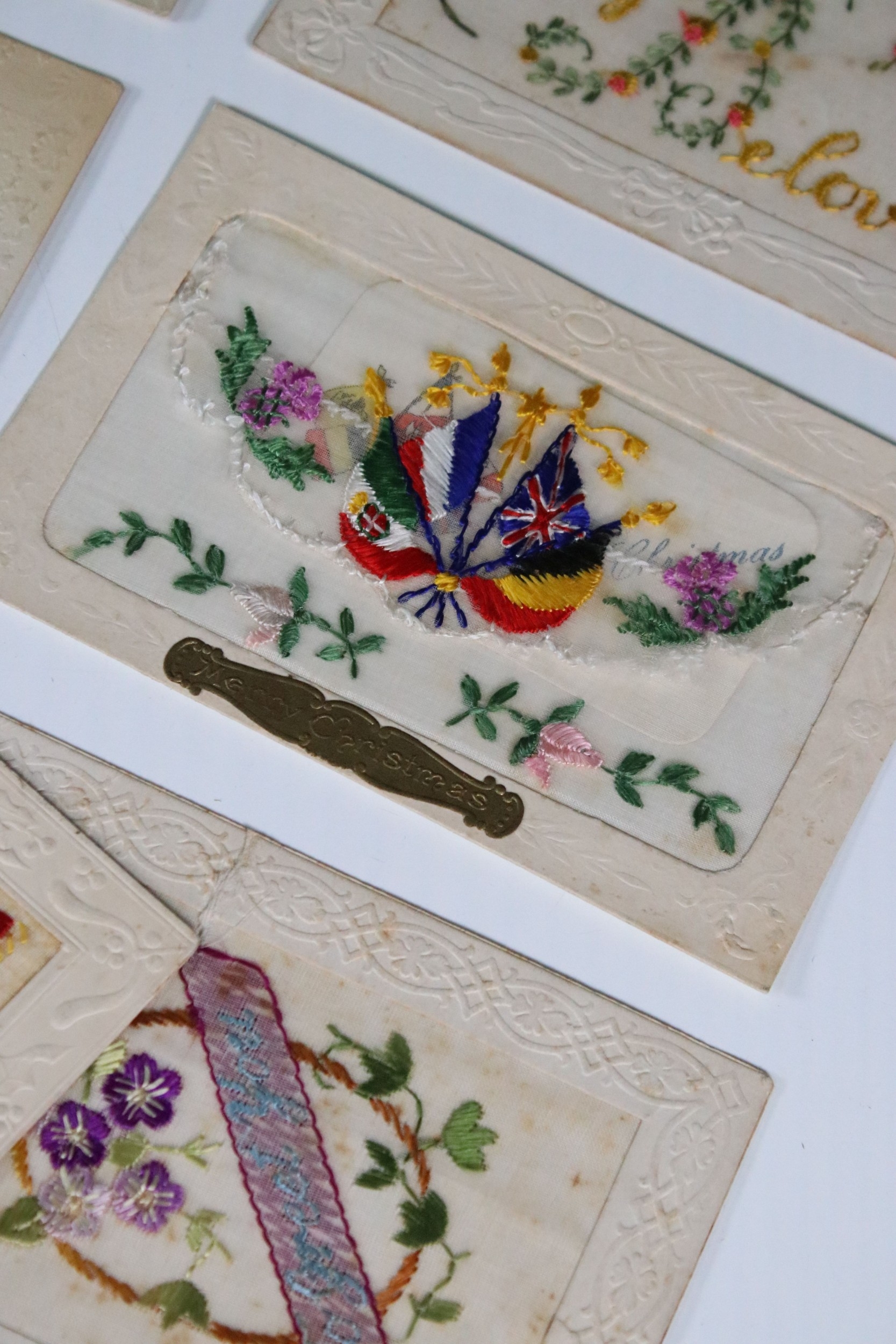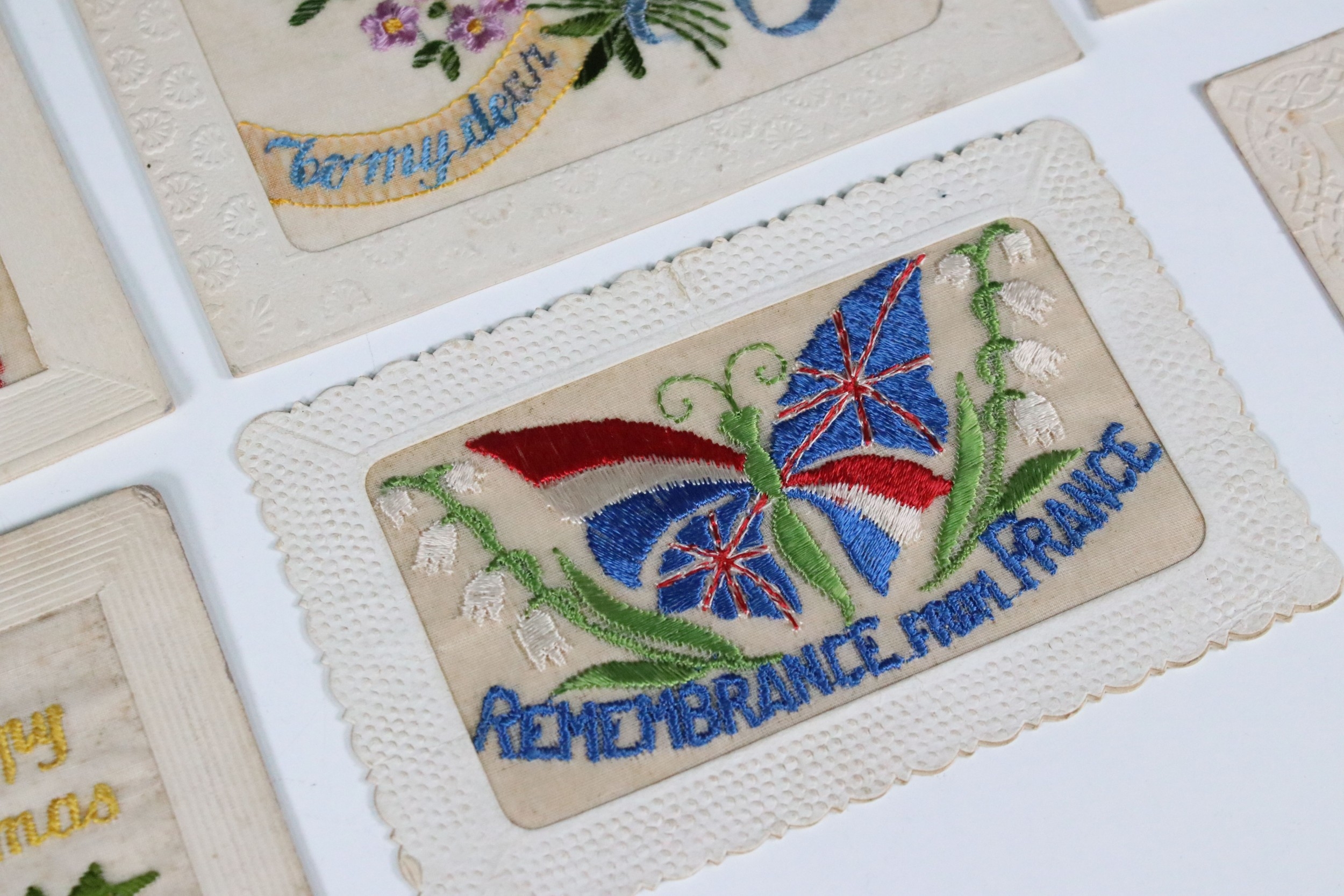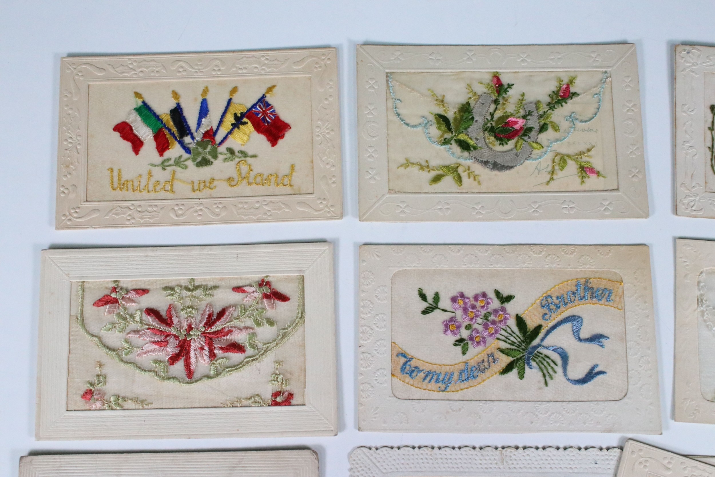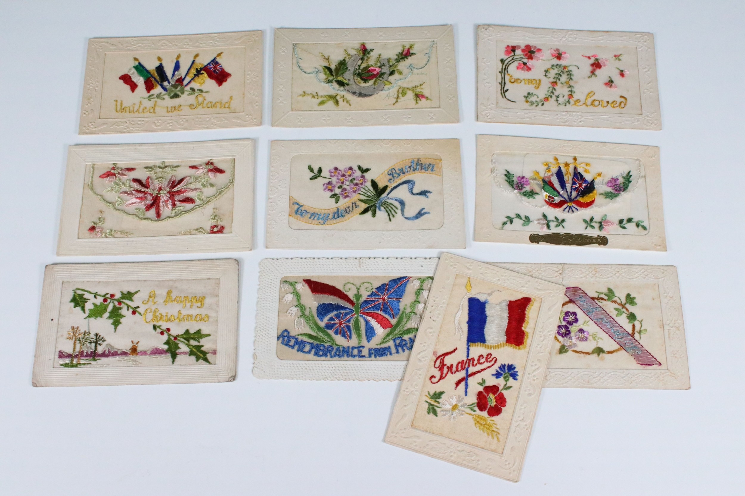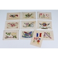 A collection of ten WW1 / World War One British patriotic silk postcards.