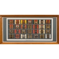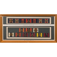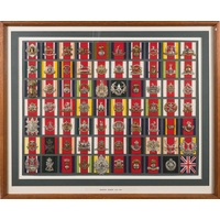 A framed collection of British Cavalry Regiment cap badges: including Royal Scots Greys, 3rd Dragoon Guards, Queens Own Hussars 9th Lancers 19th PWO Hussars and others, 28 x 61cm.