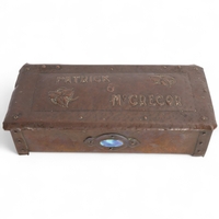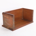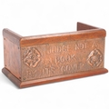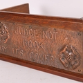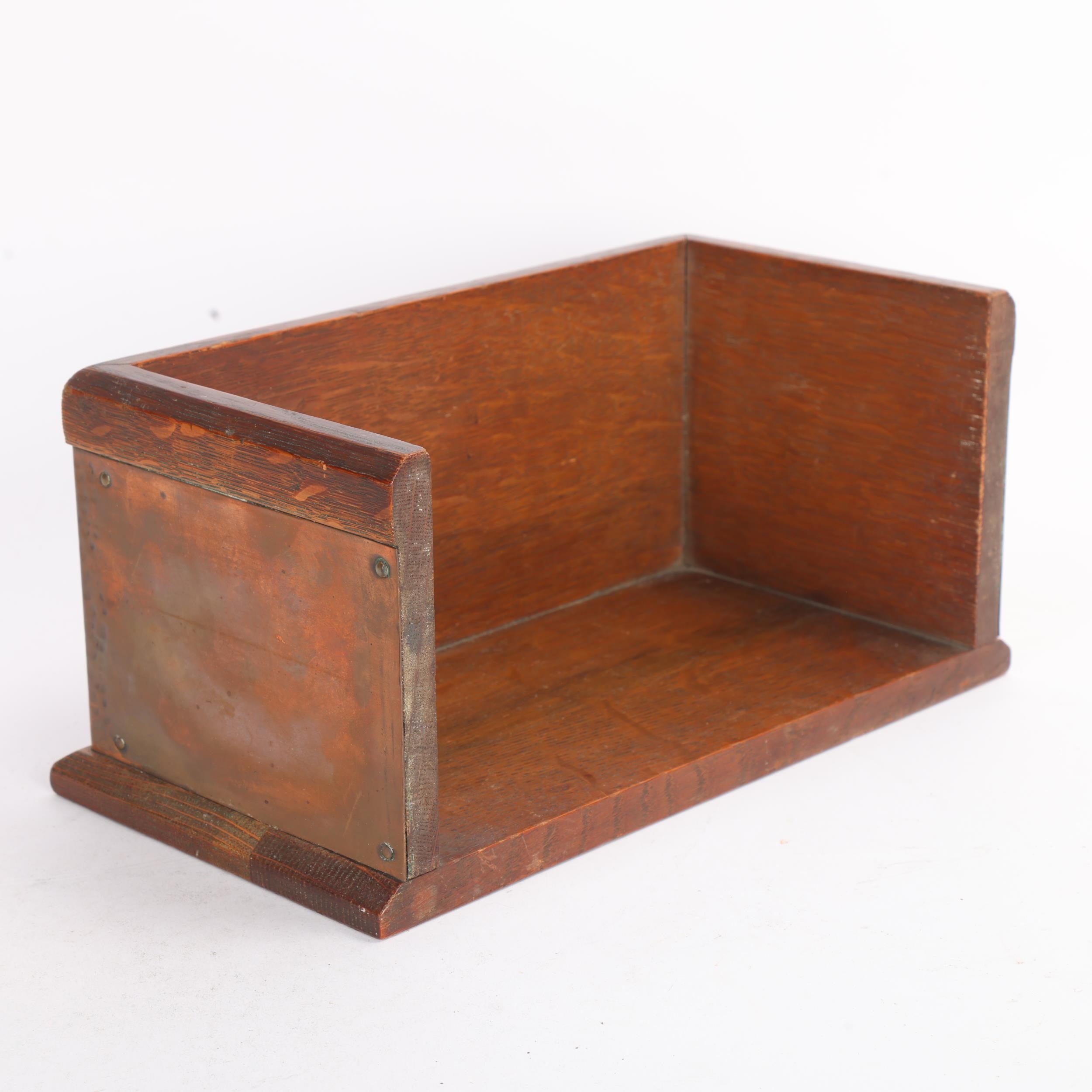 Arts and Crafts oak and copper mounted book rack, inscribed "Judge Not A Book By Its Cover", length 27cm