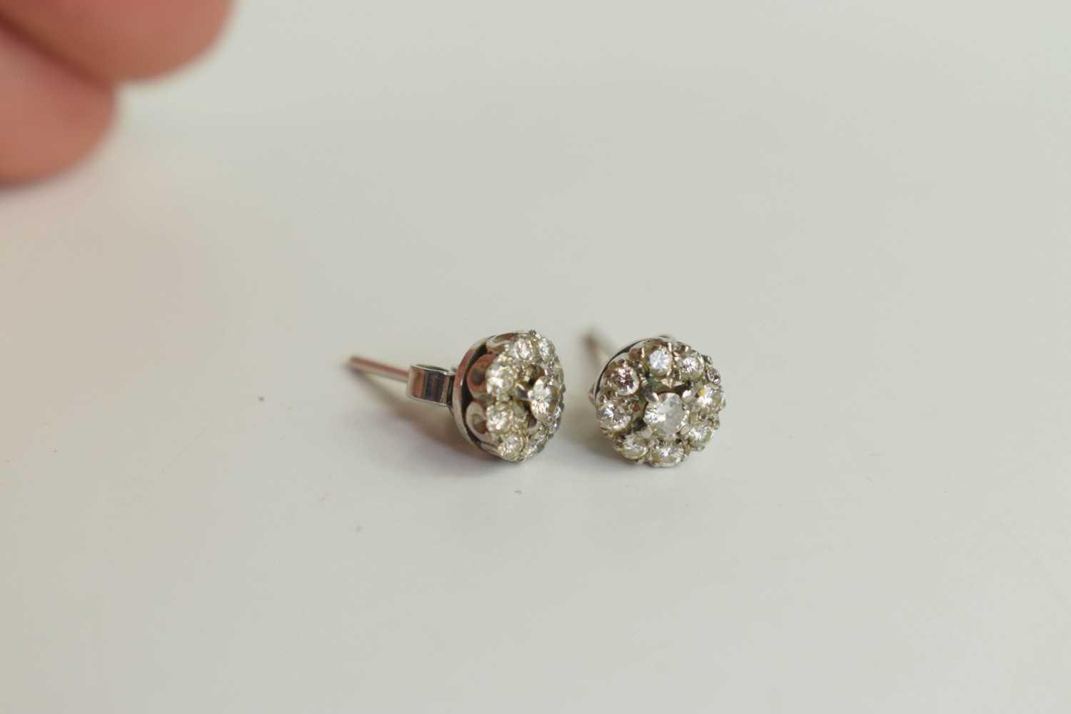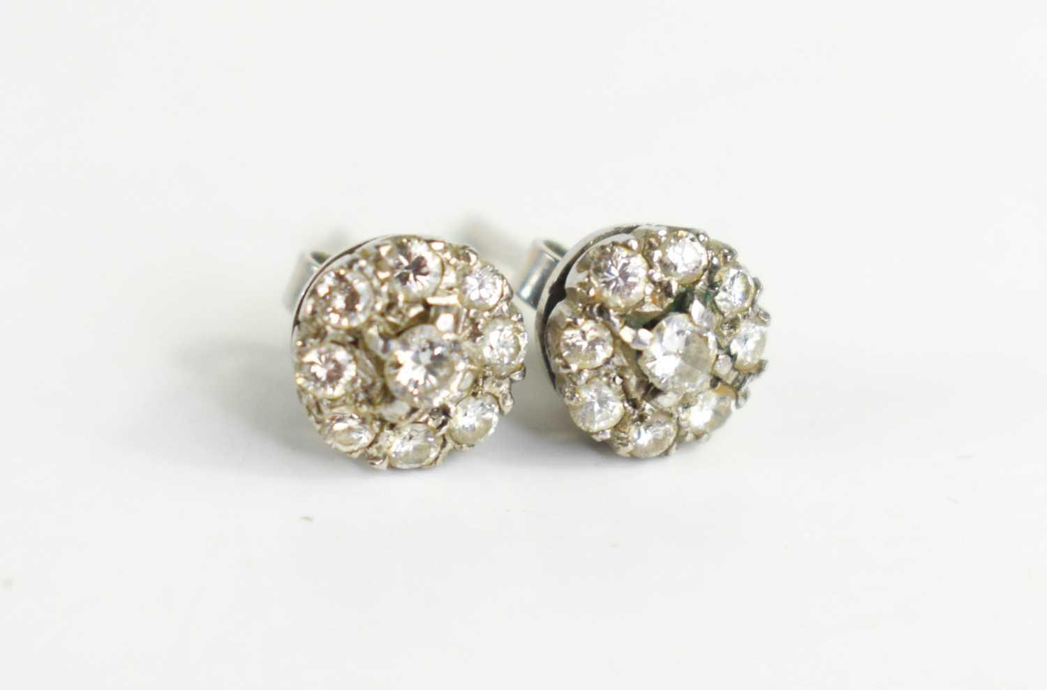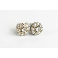 A pair of diamond flowerhead earrings, each set with a central diamond surrounded by eight further smaller diamonds, set in white metal, likely silver, 2.35g total weight including butterflies.