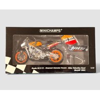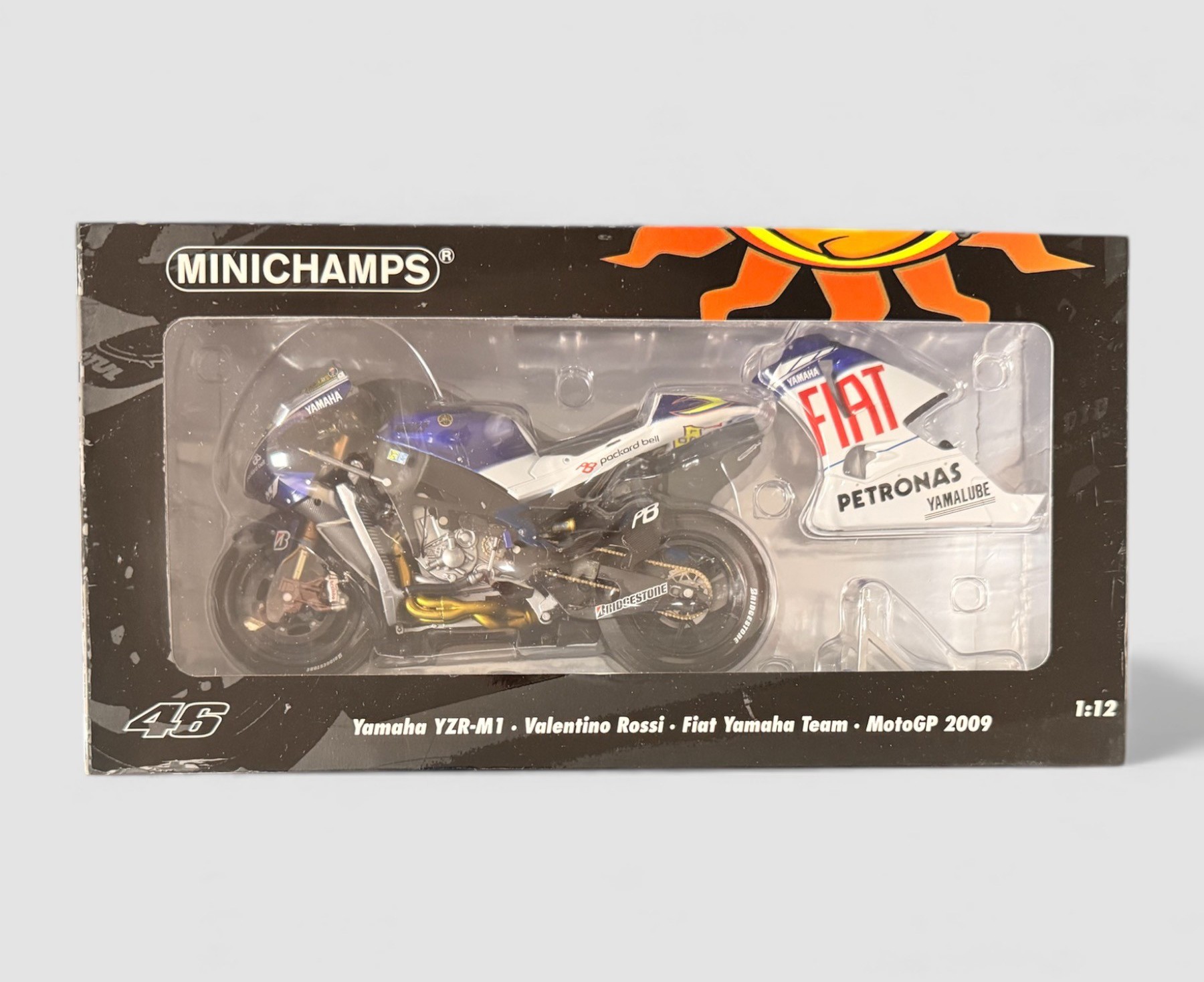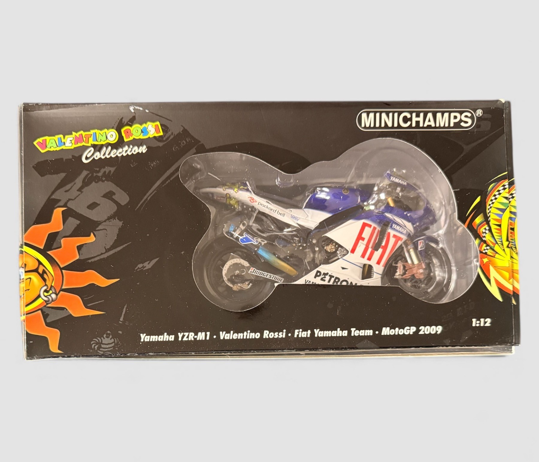 Minichamps 1/12th scale Yamaha YZR-M1 2009 FIAT V Rossi No. 122 093046, generally excellent in excellent window box including inner plastic clamshell. Contents unchecked for completeness or correctness and viewing recommended.