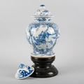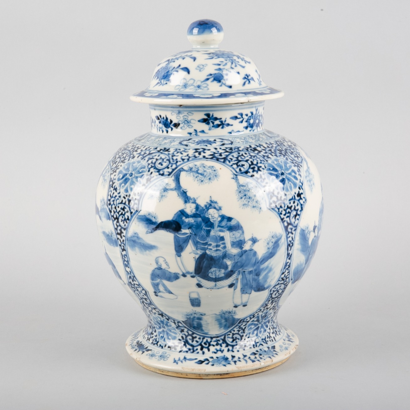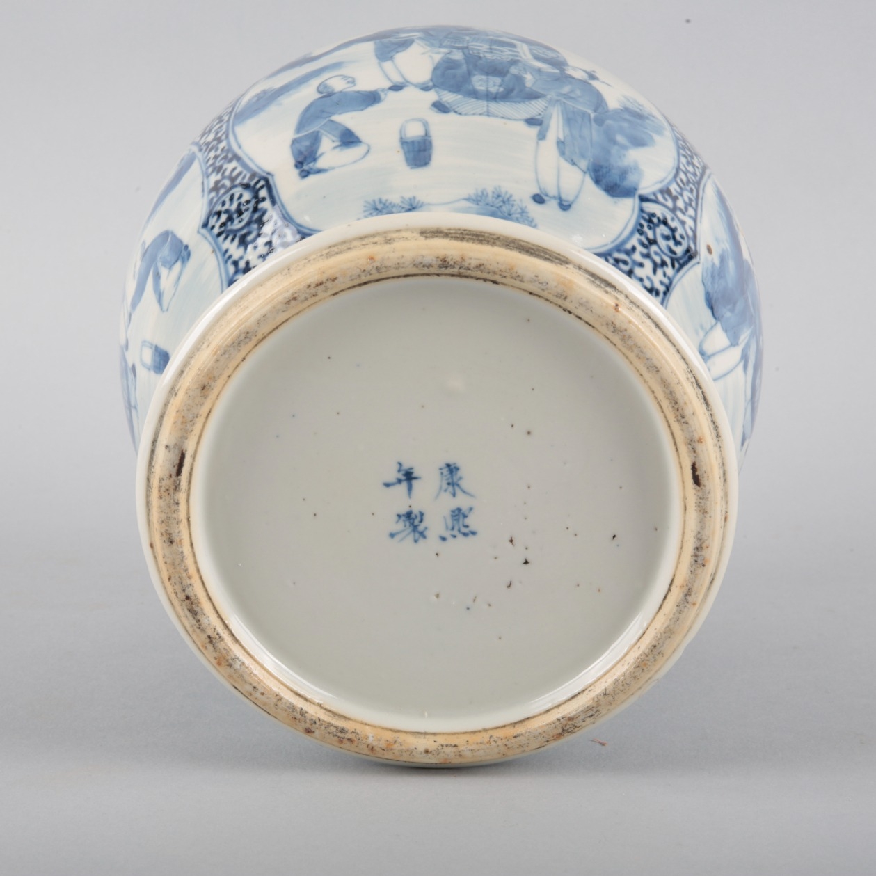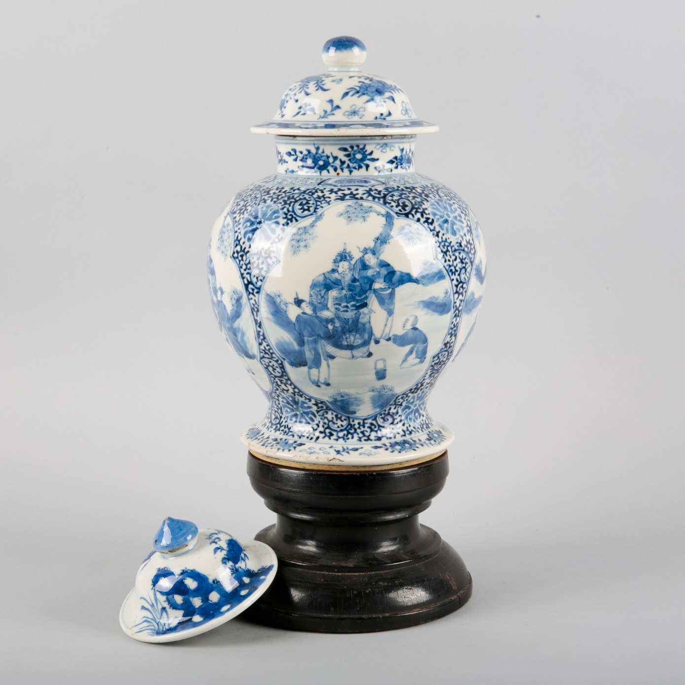 bearing a four character Kangxi mark to the base, 19th century, decorated with four repeating panels of figures in a garden landscape, a young boy presenting an offering to an official with attendants, against a ground decorated with stylised flower heads and leafy tendrils, 21cm high; together with two associated porcelain covers and a turned wood stand