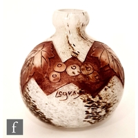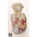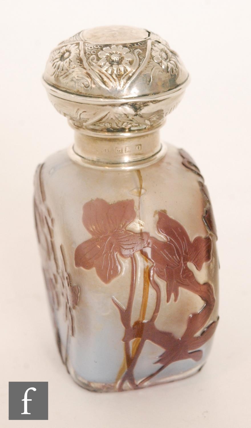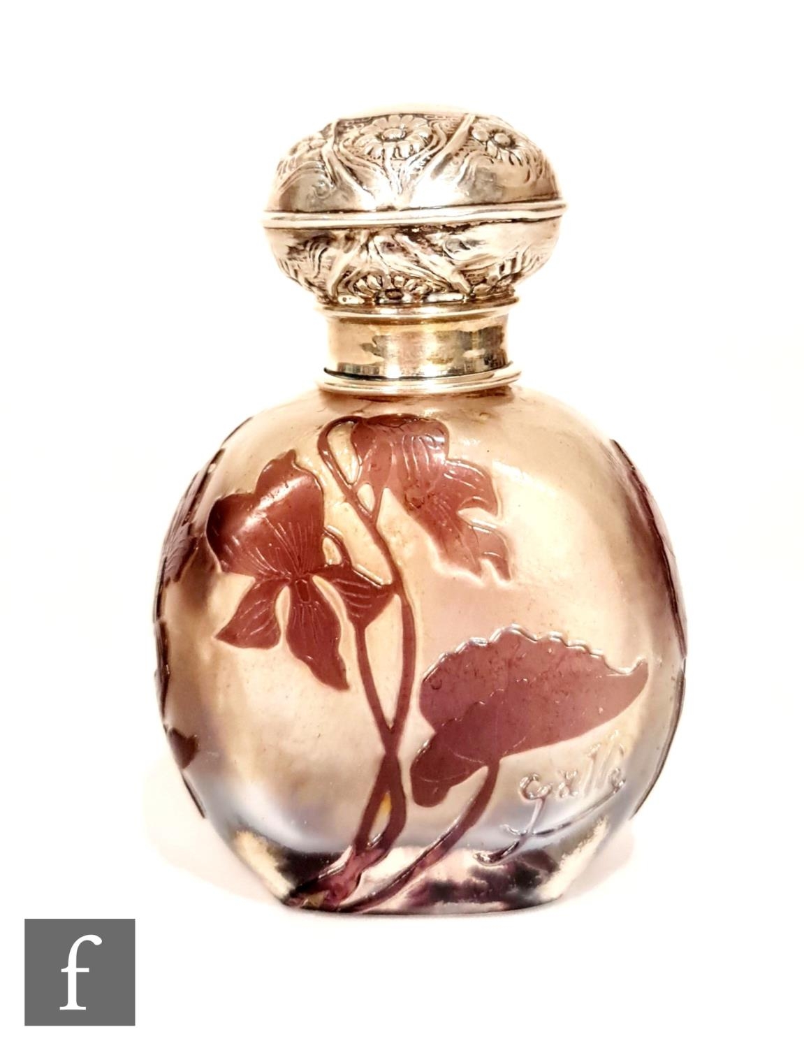 Galle - An early 20th Century cameo glass and hallmarked silver scent bottle, of compressed ovoid form, cased in amethyst over the opalescent and clear ground and cut with flowers, cameo signature to body, the silver cap embossed with flowers, height 10cm, S/D.