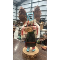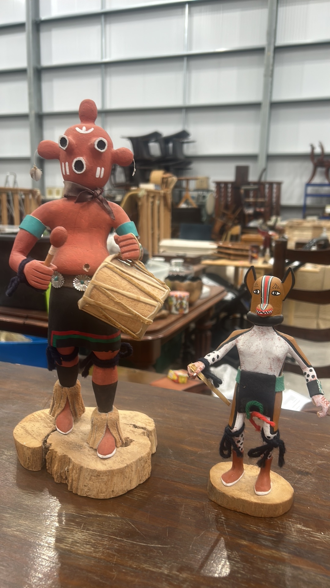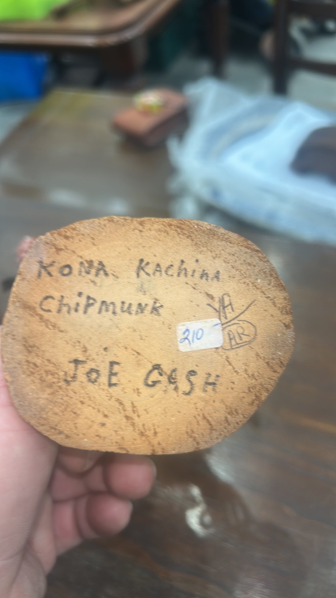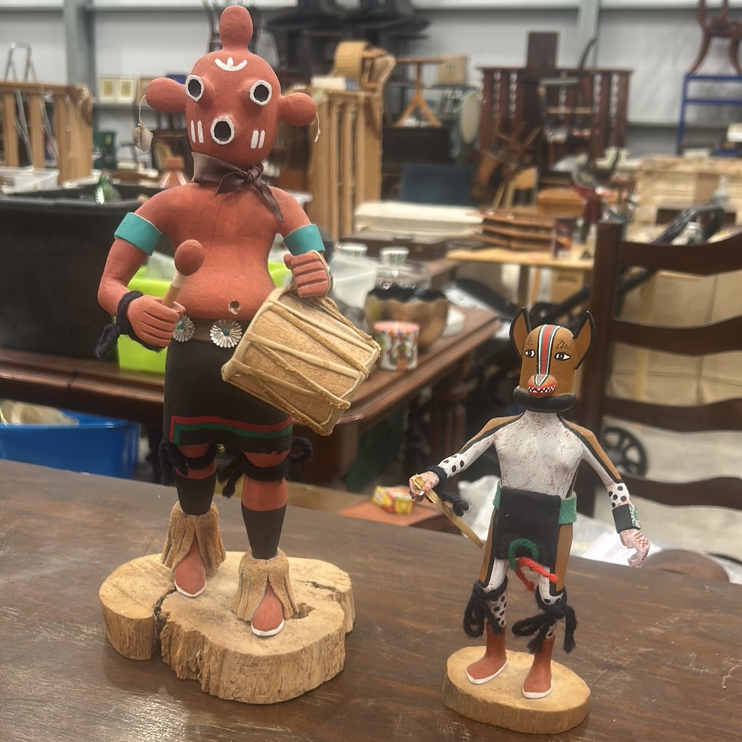 Pair of Hopi carved cottonwood kachina figures, polychrome painted and appliqued, each on natural wood bases; one inscribed beneath “Kona (Chipmunk) Kachina – Joe Gash.”