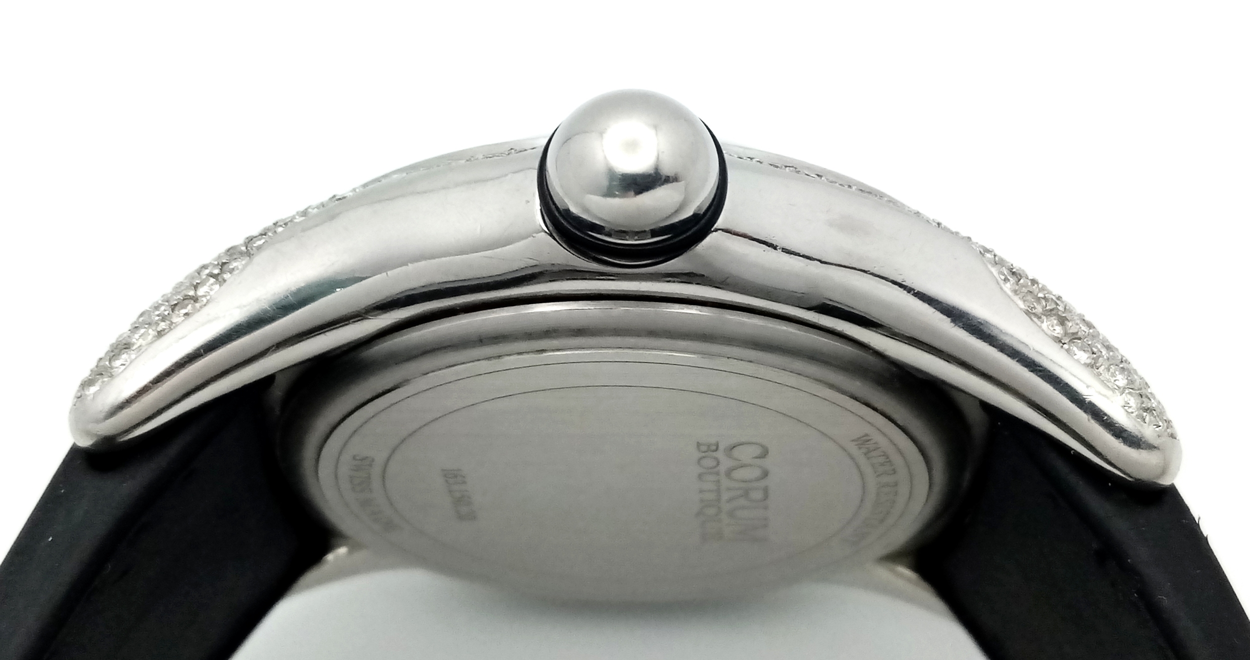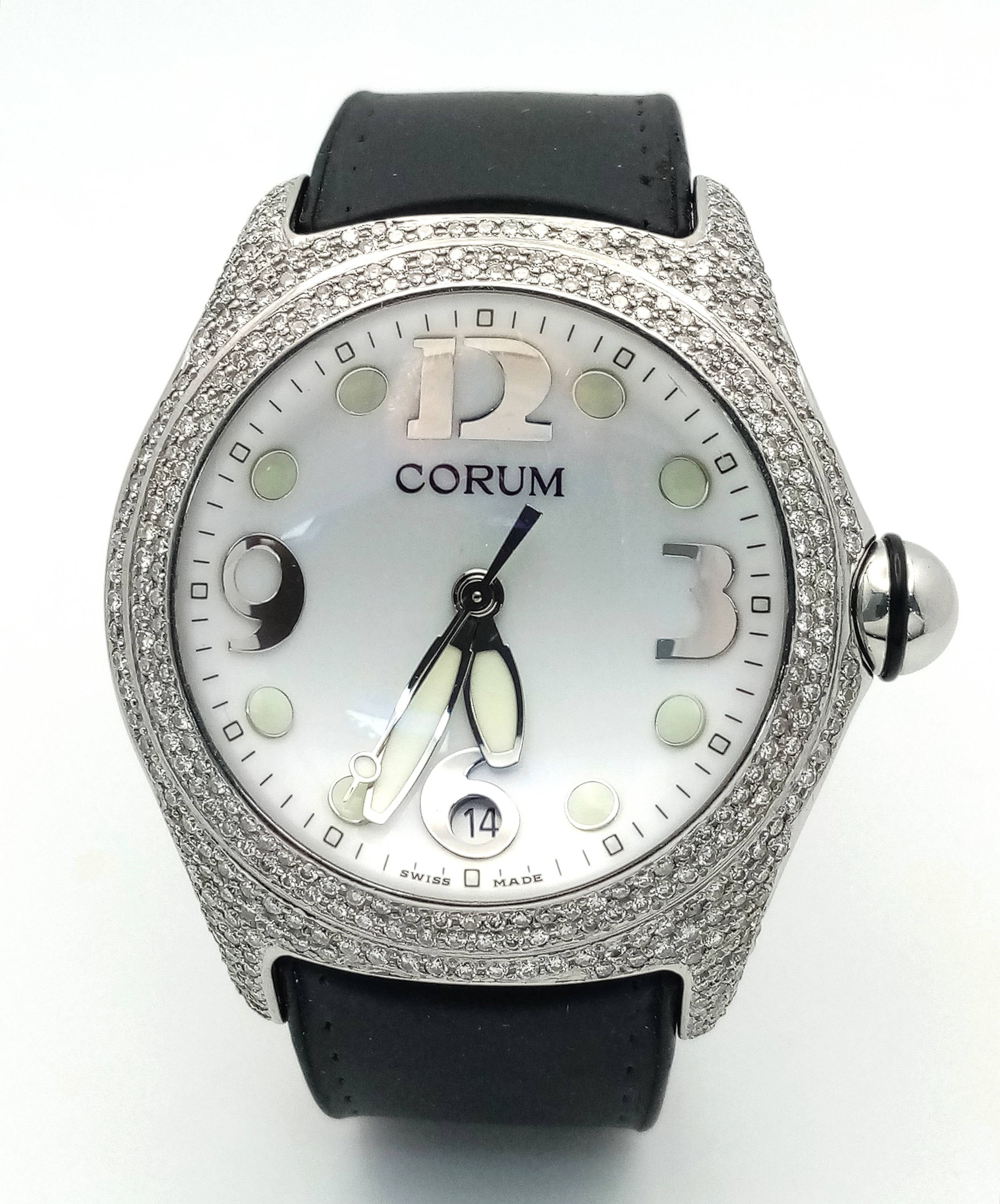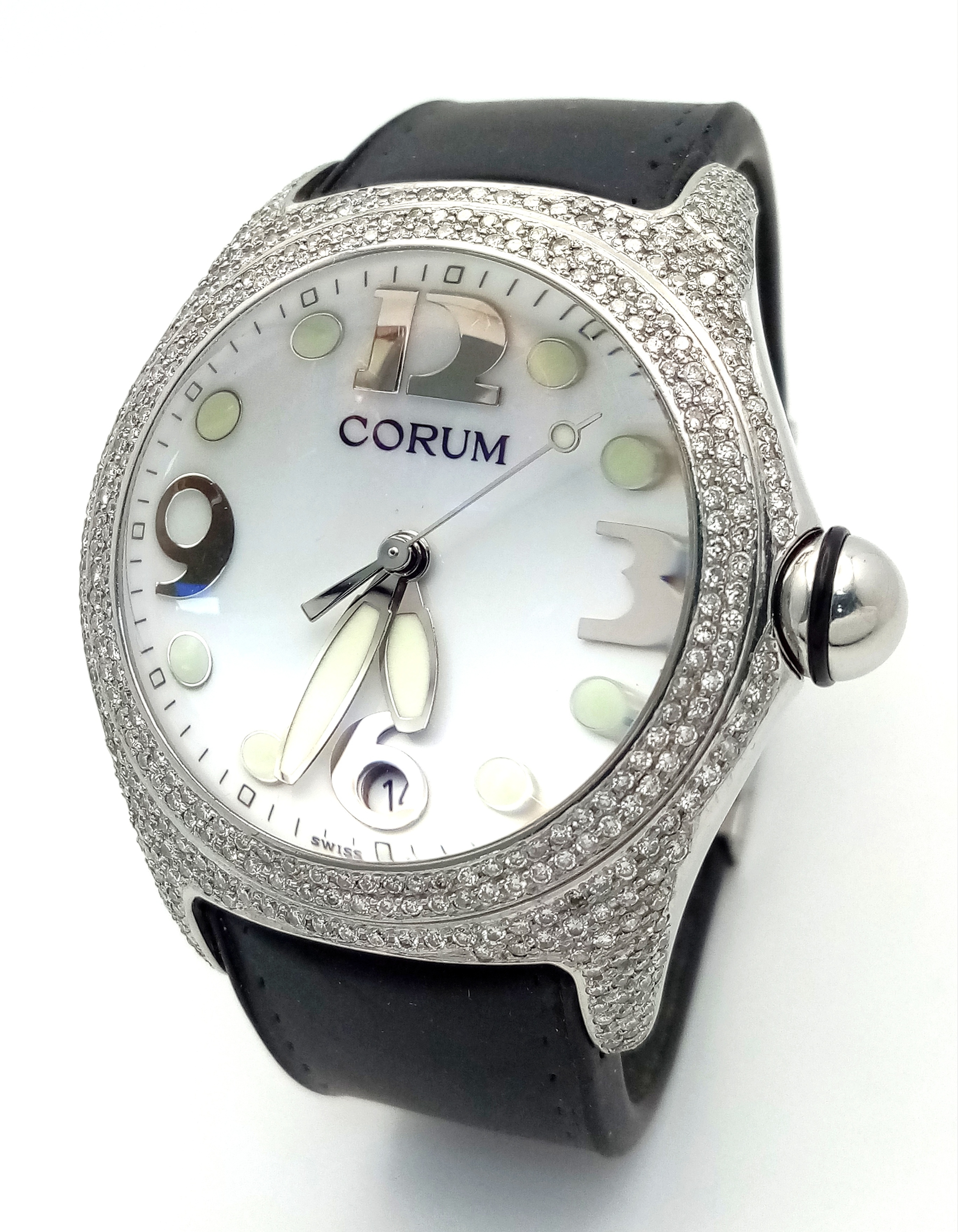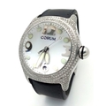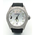 Black leather and rubber strap - With a Corum deployment buckle. Stainless steel case - 44mm. Diamond set bezel, outer front case and lugs. White dial with Arabic numeral markers. Quartz movement. In good condition and working order.