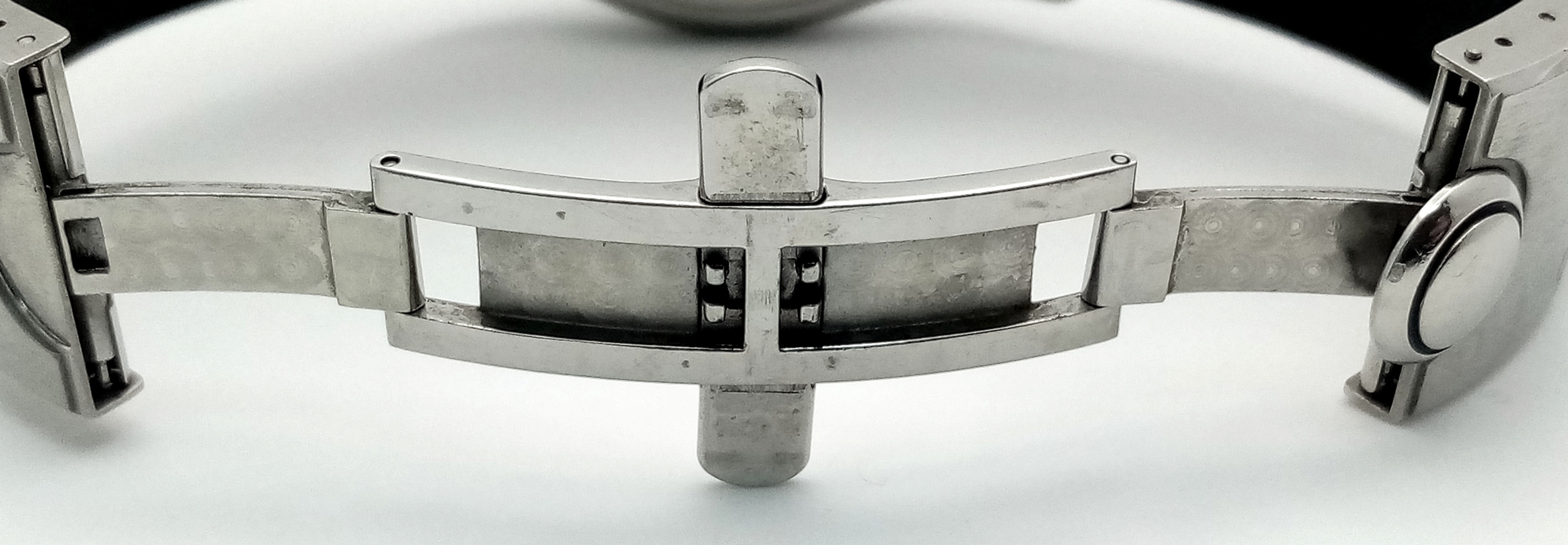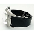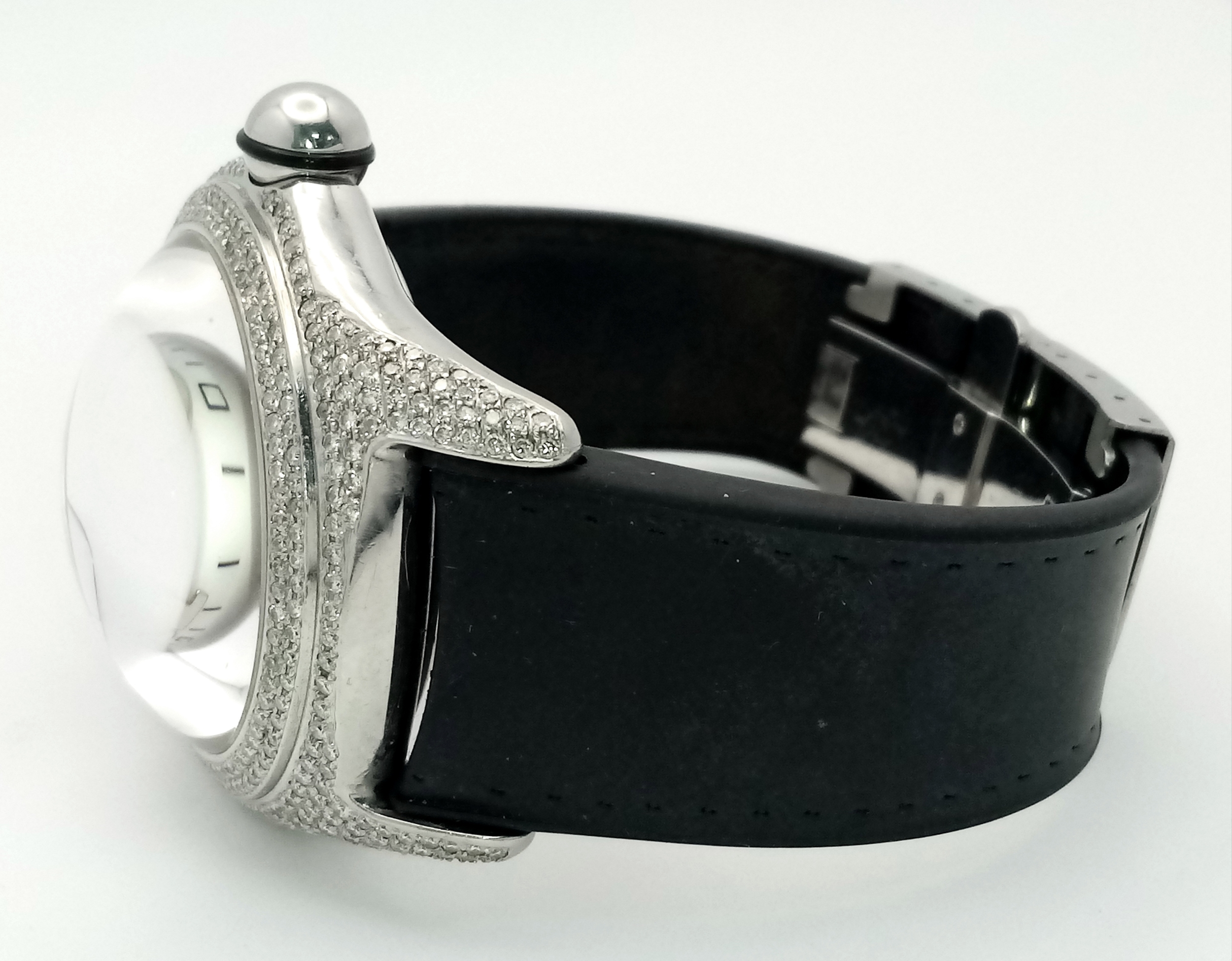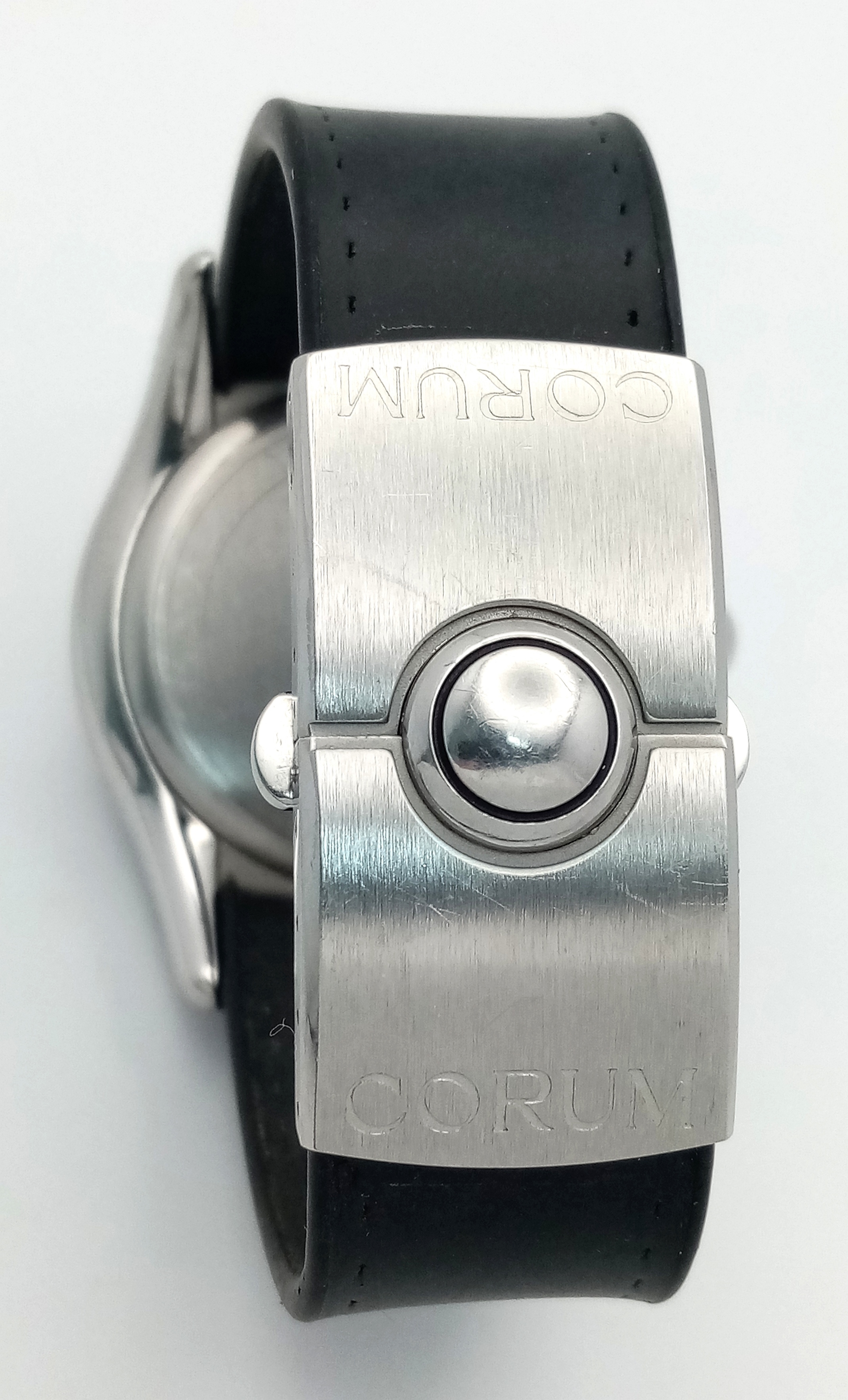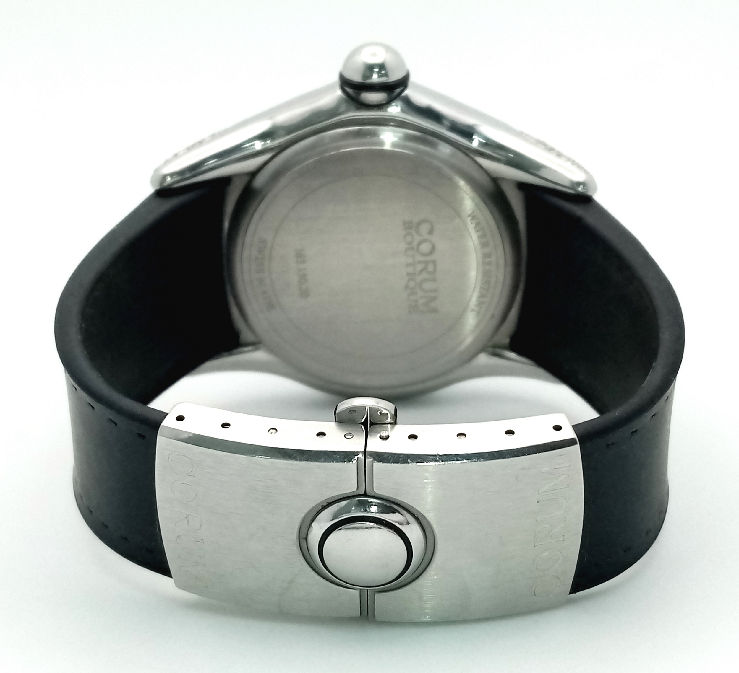 Black leather and rubber strap - With a Corum deployment buckle. Stainless steel case - 44mm. Diamond set bezel, outer front case and lugs. White dial with Arabic numeral markers. Quartz movement. In good condition and working order.