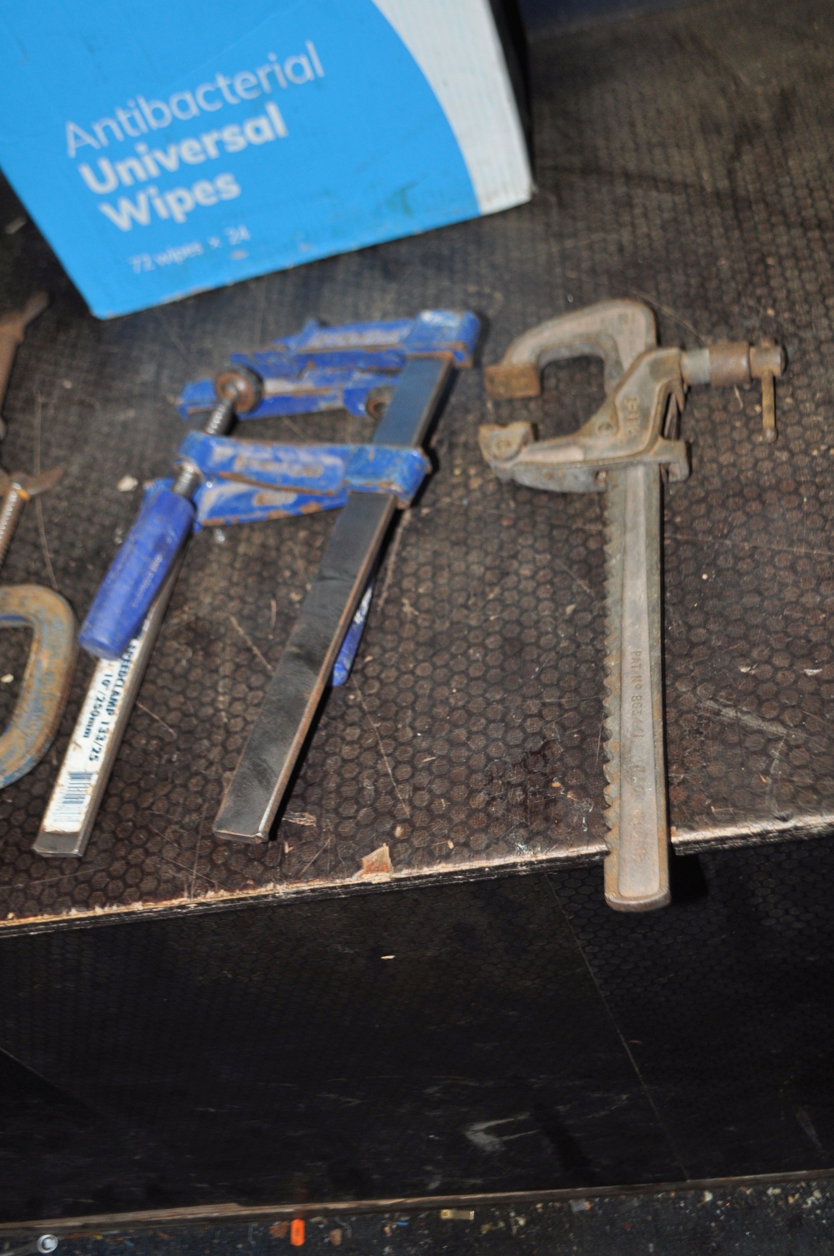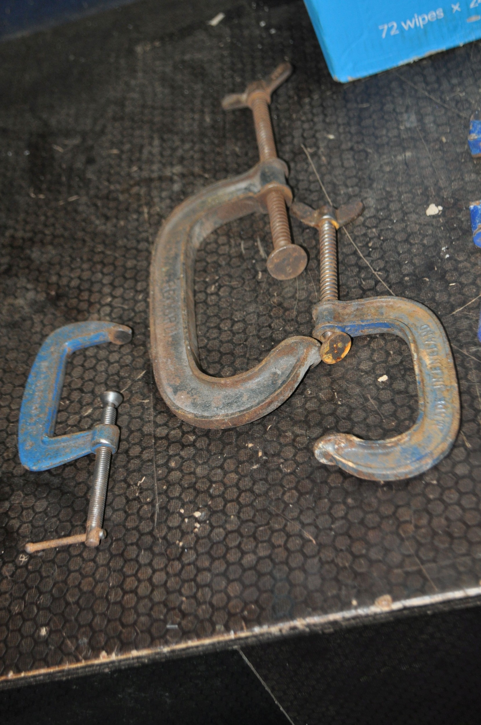 A BOX CONTAINING CLAMPS including two Record 133/25 speed clamps, a 6, a 3, a 119 and a Carver T186/2 clamp (6)