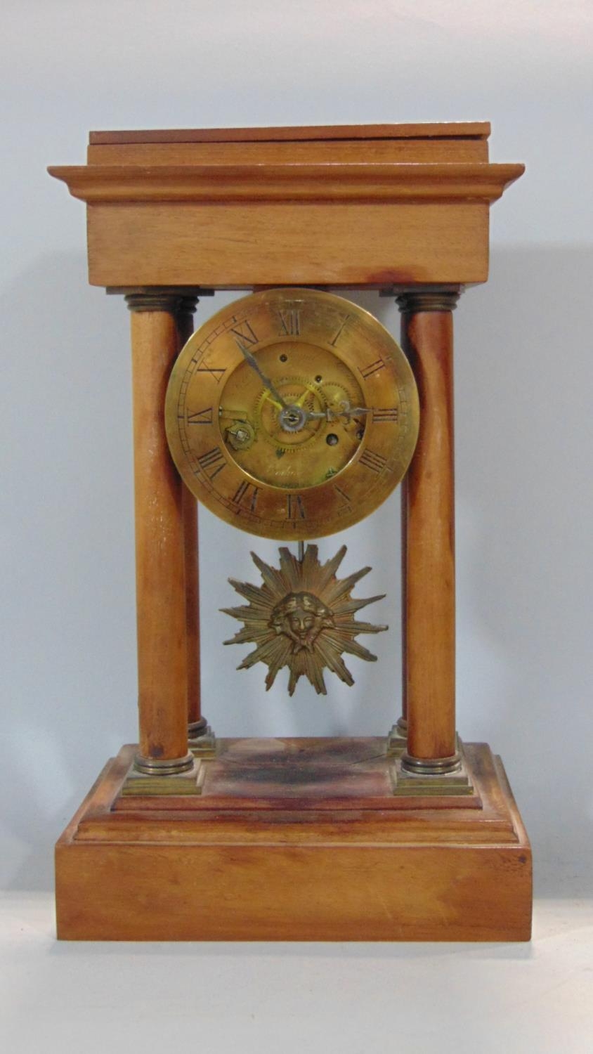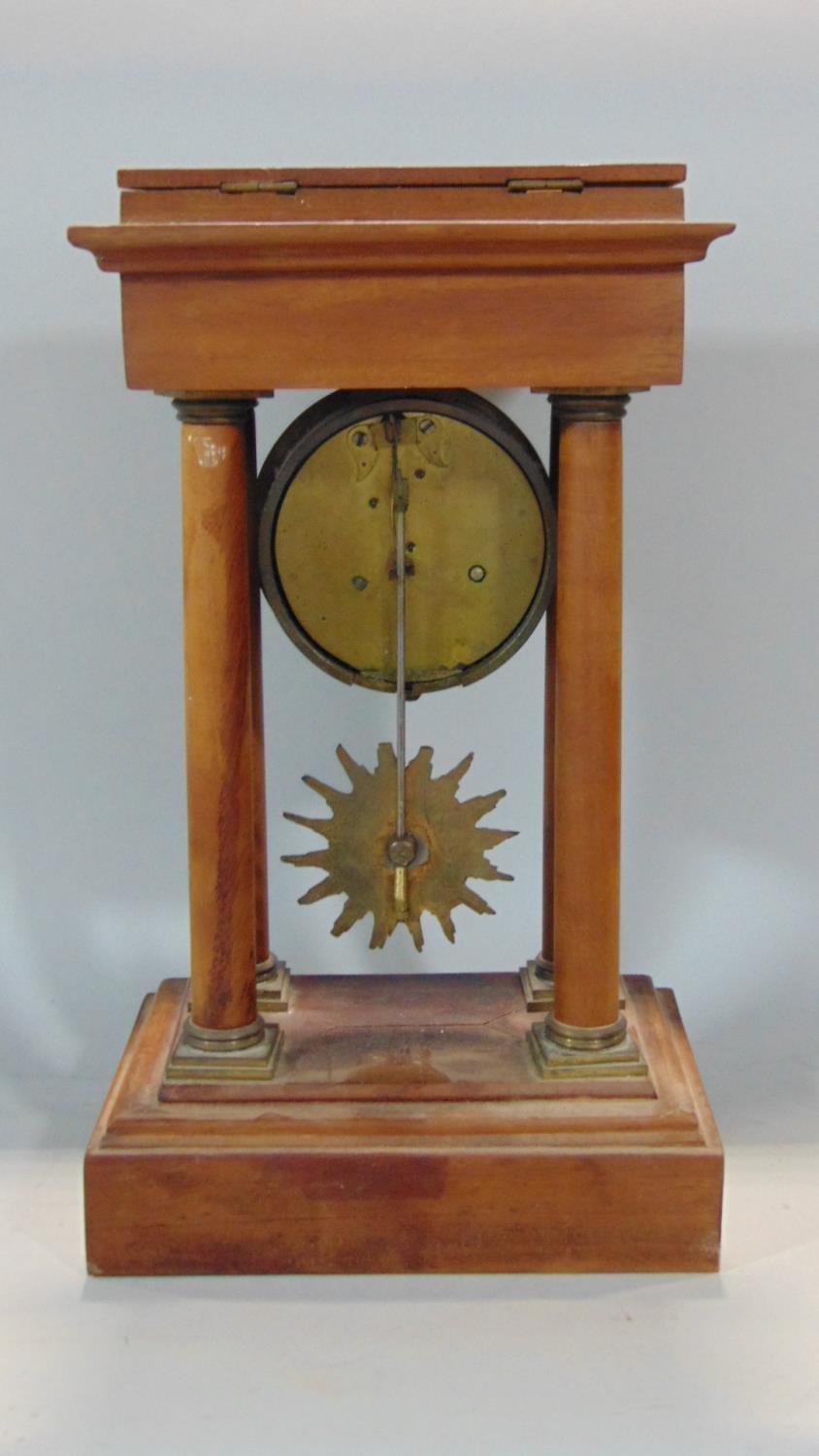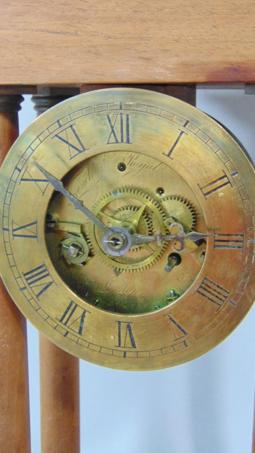 Unusual 19th century portico mantel clock by French Royal Exchange London, the brass dial with open escapement upon a typical four column frame, 32cm high