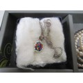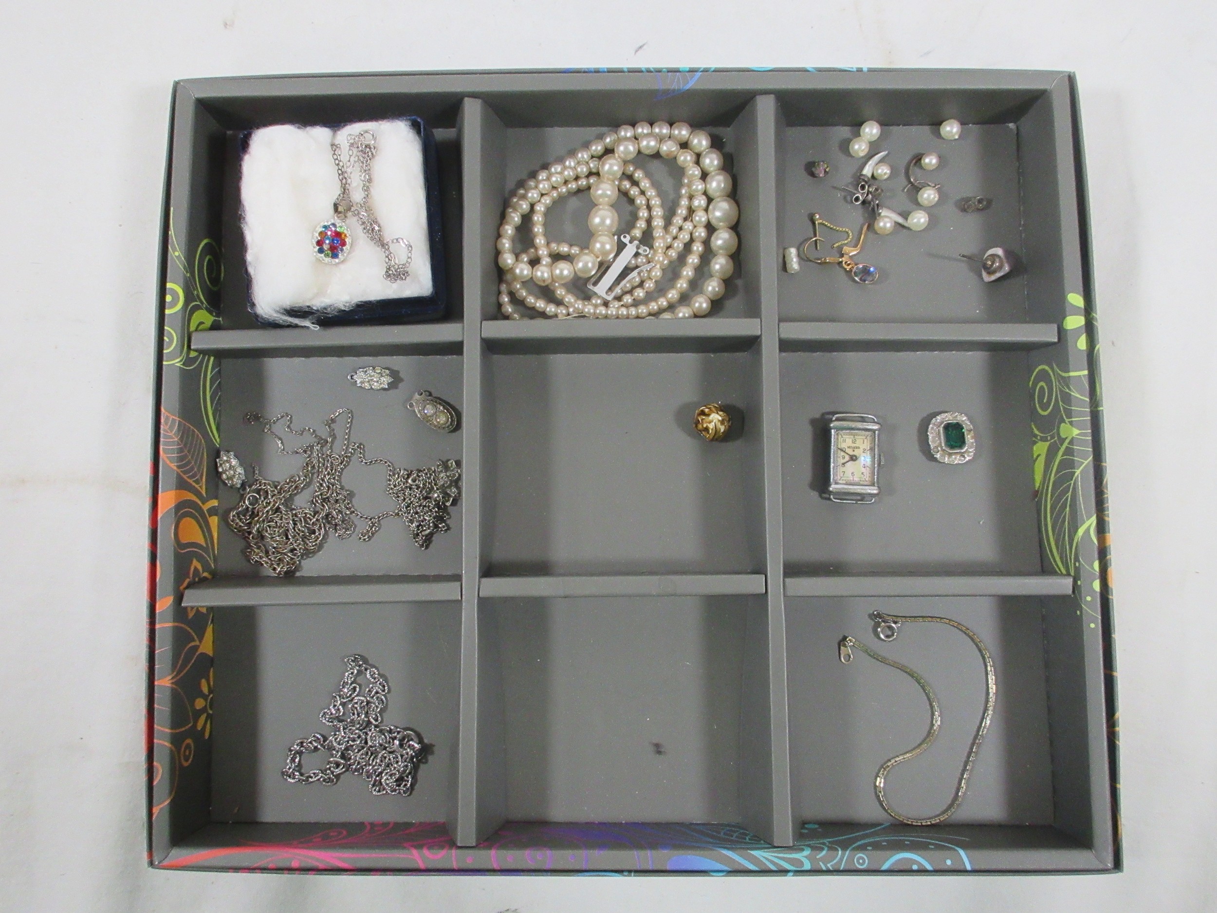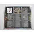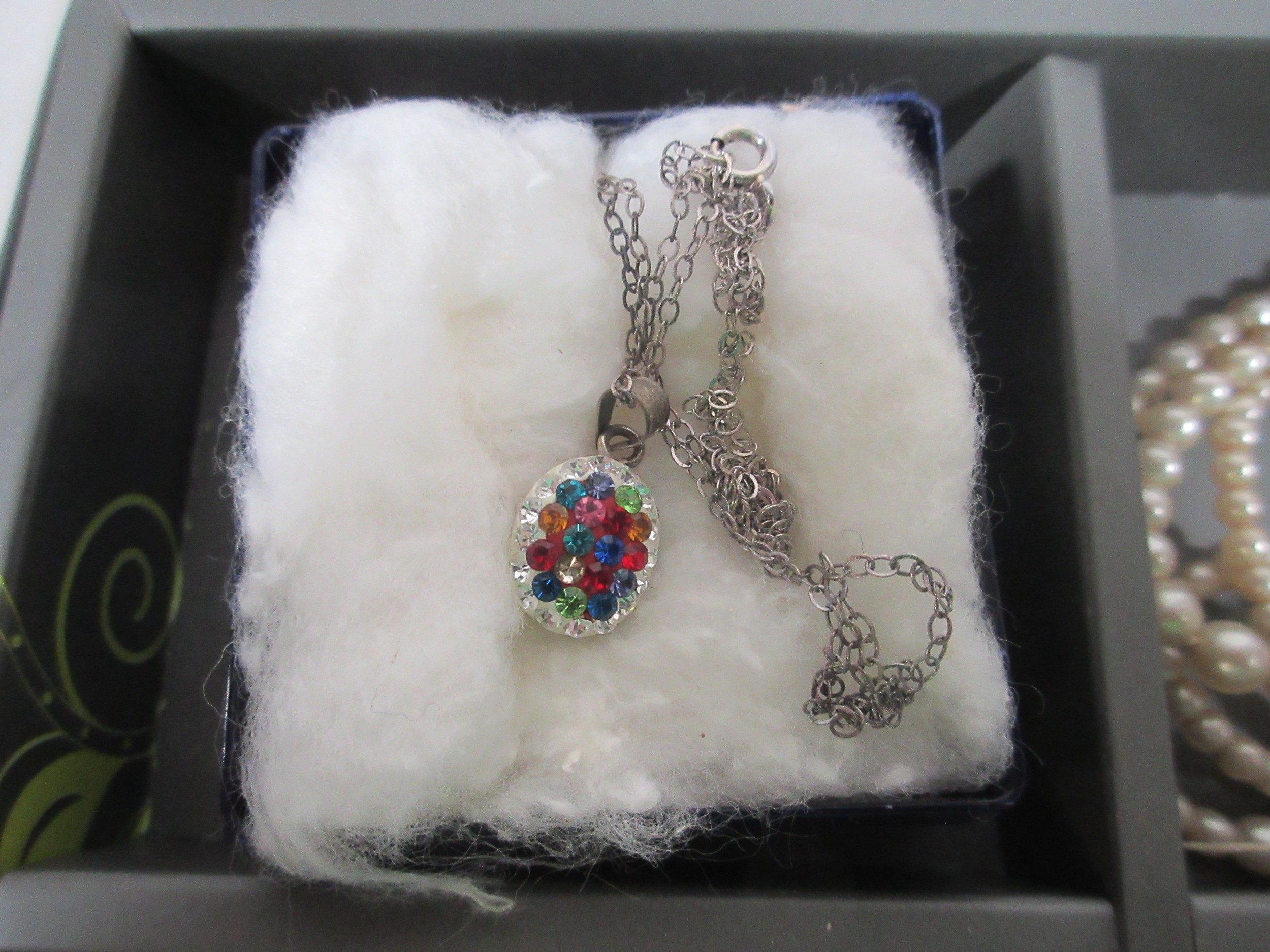 A tray of mixed jewellery including an eye-catching silver multi-stone pendant on chain, earrings, pearls, etc