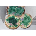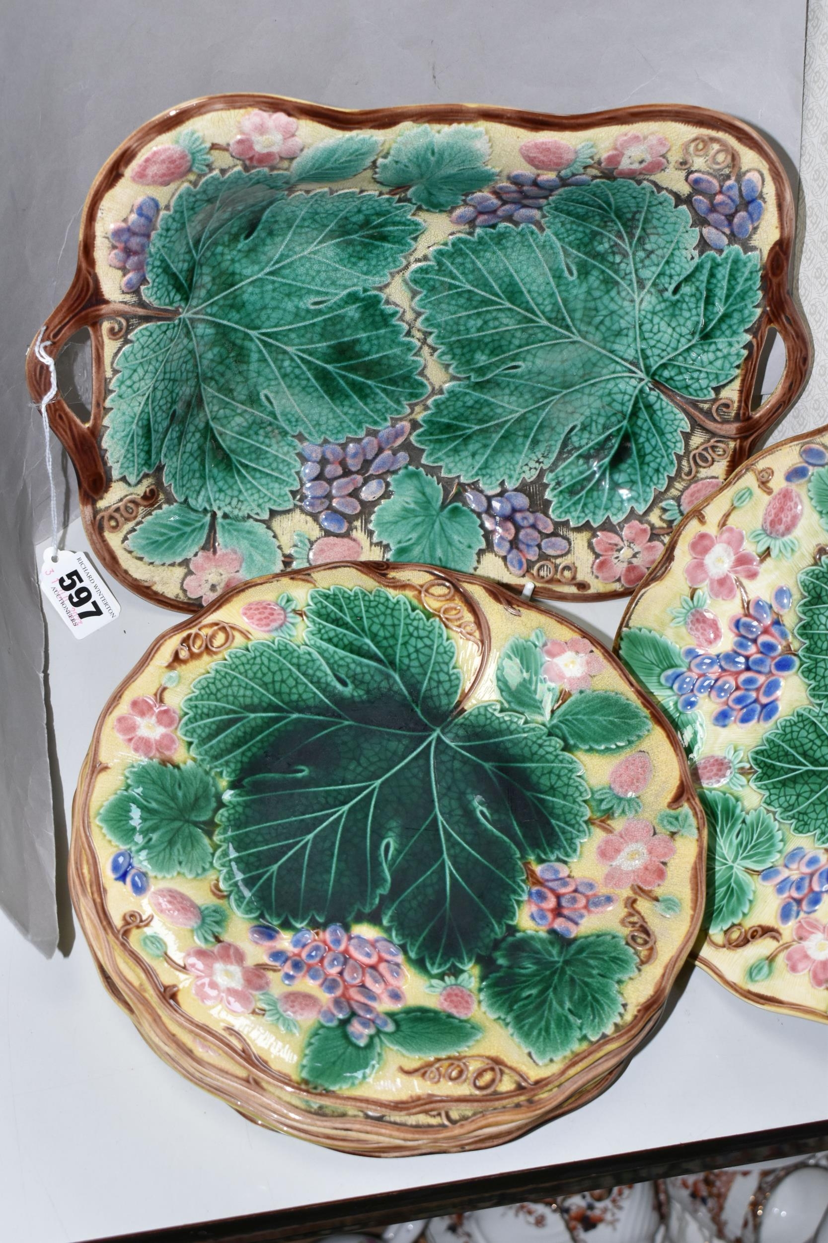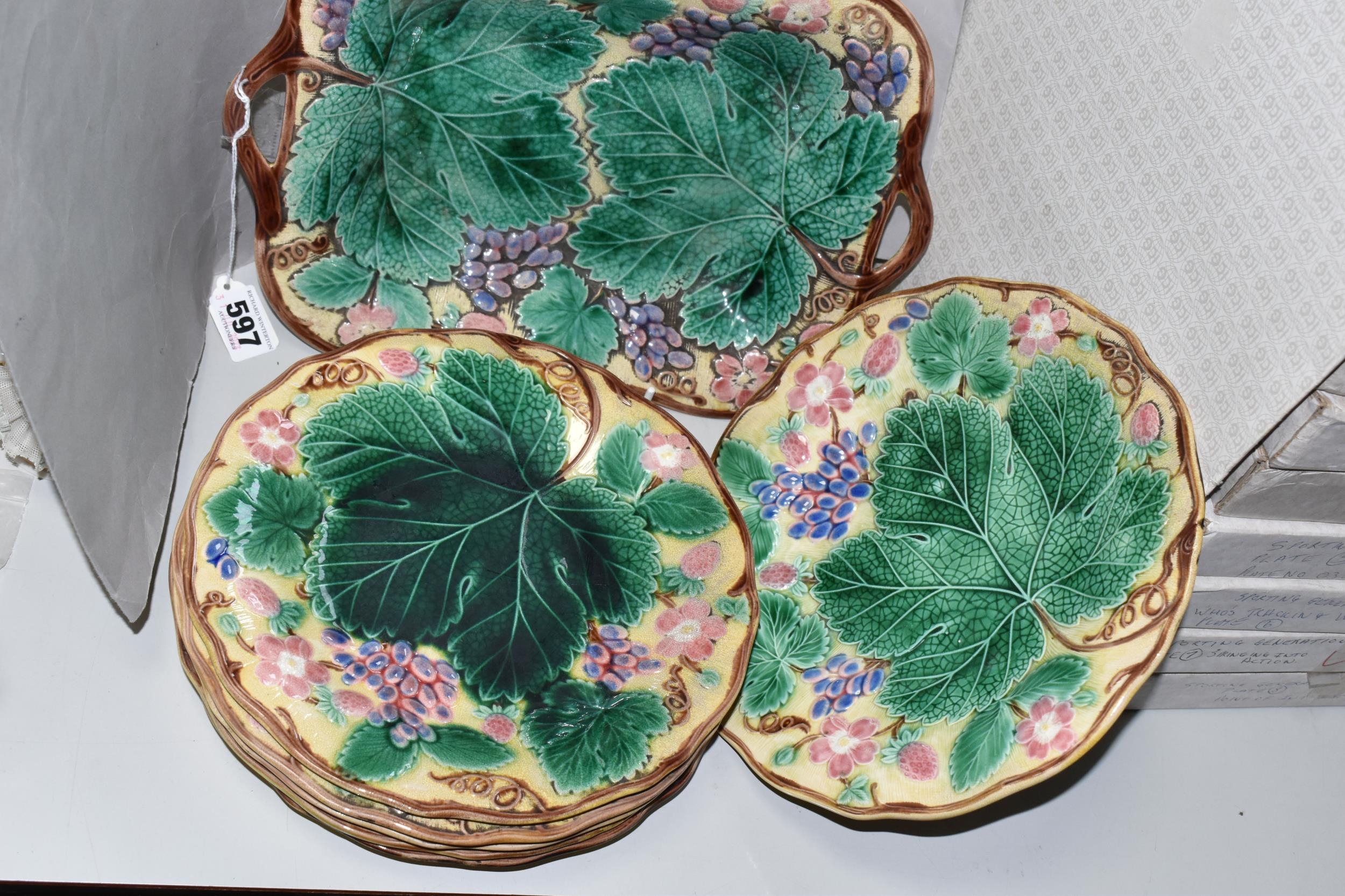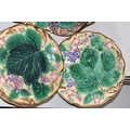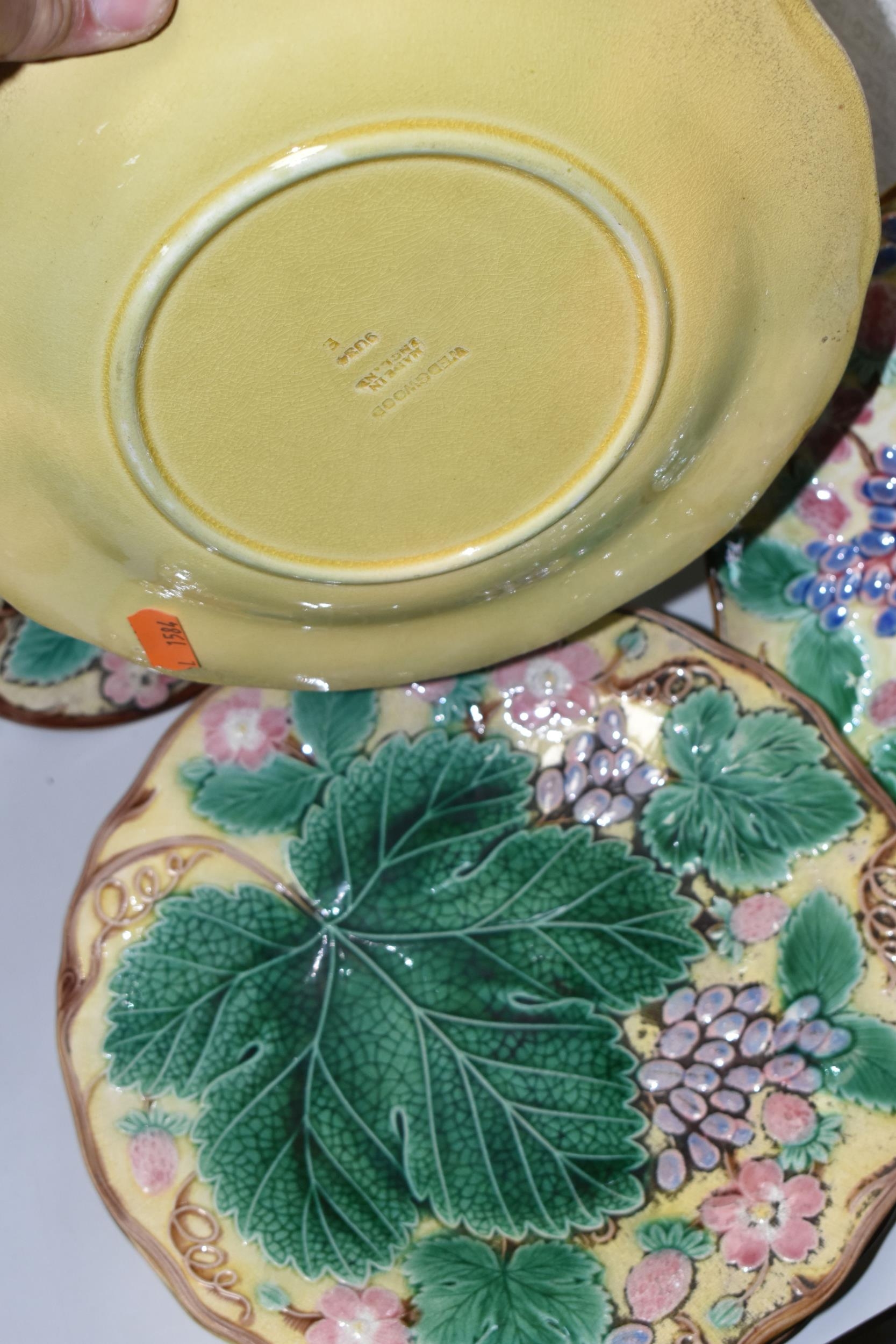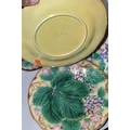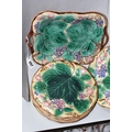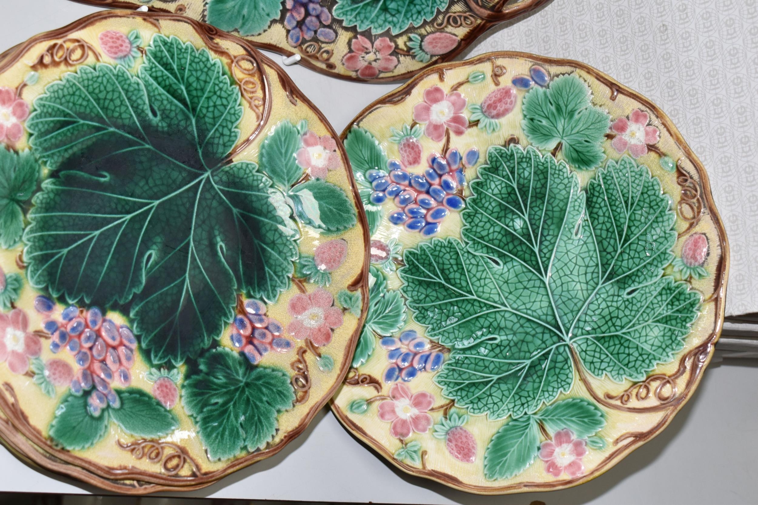 A SEVEN PIECE WEDGWOOD MAJOLICA PART DESSERT SERVICE, decorated with relief moulded vines and strawberry plants, comprising six plates (one chipped verso) and a twin handled serving dish (chip verso), all bearing impressed 'Wedgwood, Made in England' backstamps (7) (Condition Report: good overall condition, specific obvious damage as stated, all pieces have crazing, and some staining to the underside)