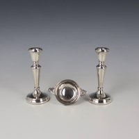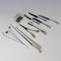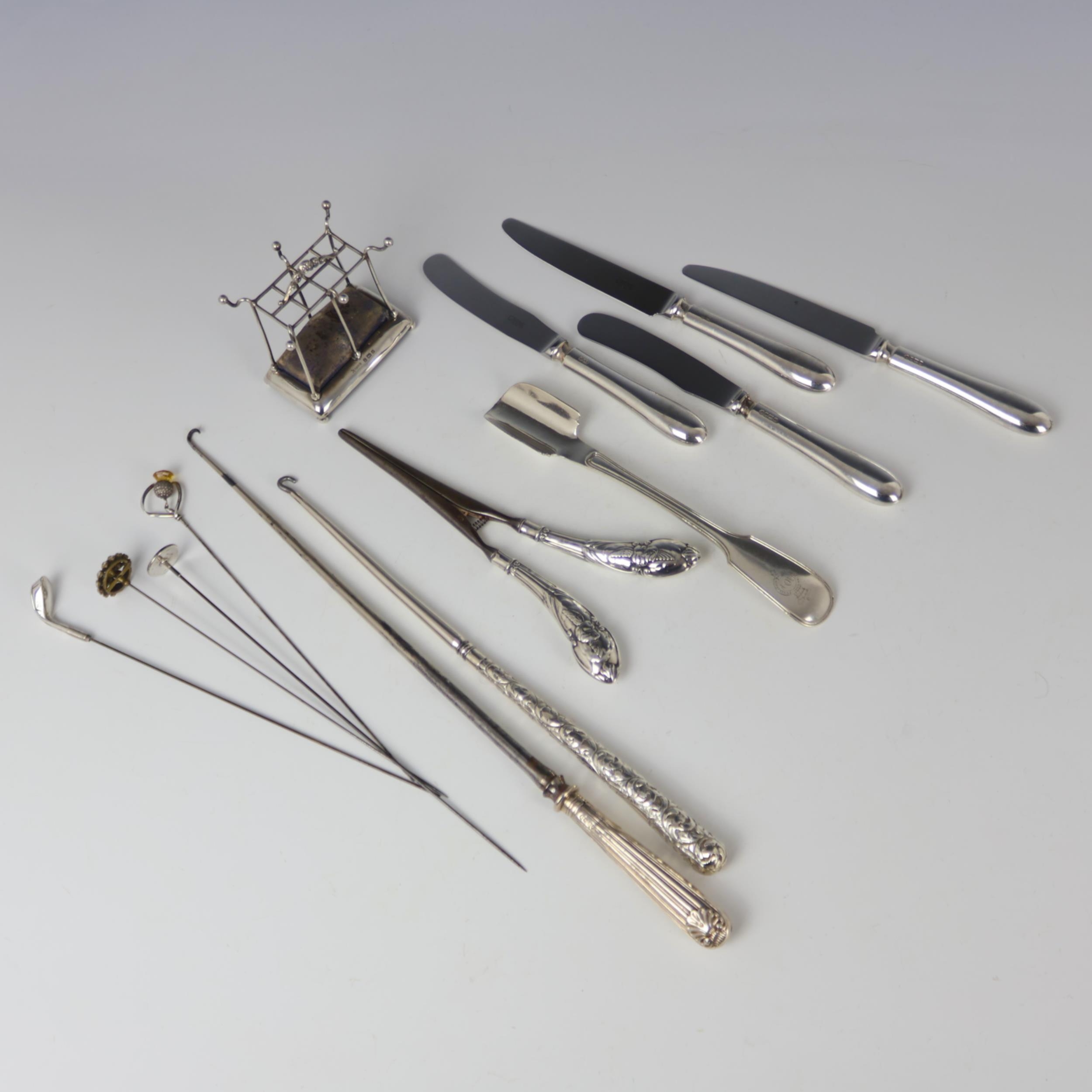 An Edwardian silver mounted hat pin stand, Miller Brothers, Birmingham 1903, modelled as a stick stand with cast floral handle, 8cm high, with four associated hat pins, together with a selection of silver and silver coloured flatware, including a George IV silver mounted button hook, possibly William Chawner II, London 1827, of typical form with shell capped decoration, 40cm long, two late 20th century silver handled butter knives, Carr's of Sheffield Ltd, Sheffield 1993, 20cm long etc (qty) (at fault)