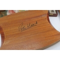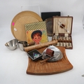 An unusual wooden board, together with oak burr wooden disc, Myrtle wood dish, Danish stainless steel dish, bowl and fork, two napkin rings, deco tin, and a kaleidoscope, cased Win-El-Ware coasters, cased set of cake forks, and a Blandford Forum the great fire pottery plate in original box