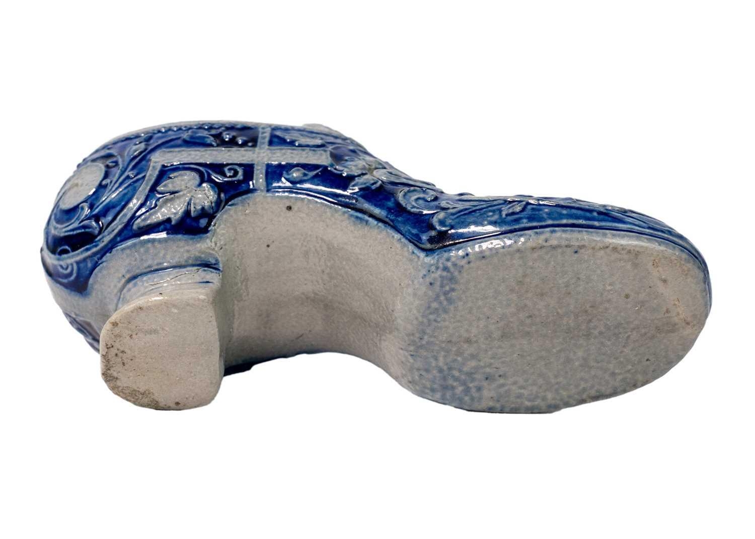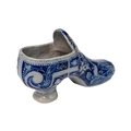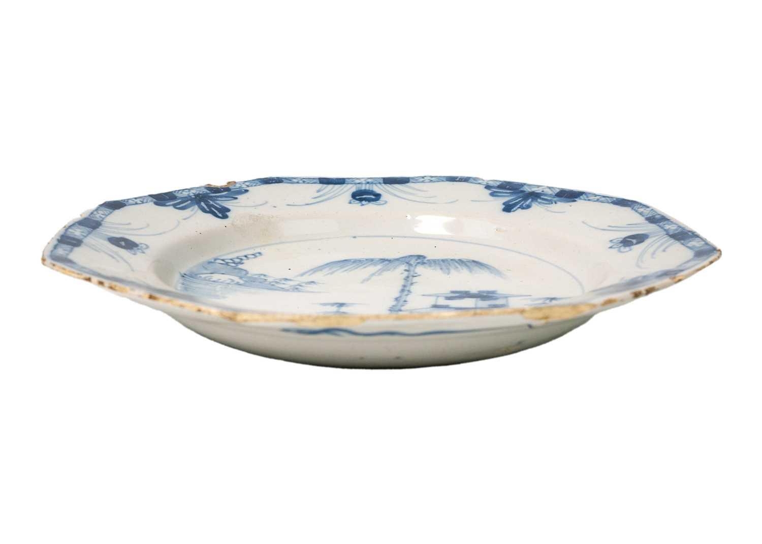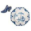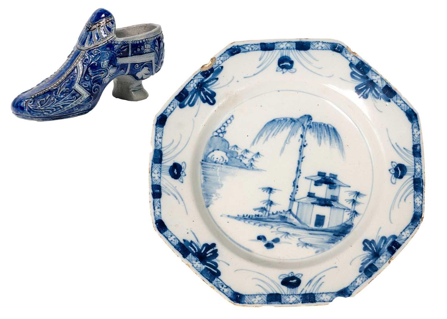 An English Delft hexagonal plate. Circa 1770, painted in blue with an unusual decoration of a palm diameter 21.5cm together with a salt glaze stoneware marriage shoe, moulded and painted in blue.